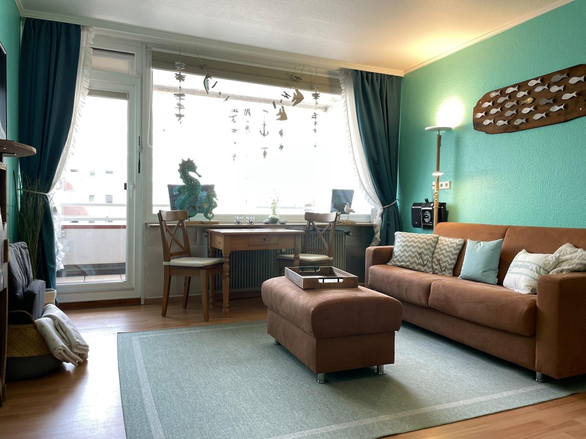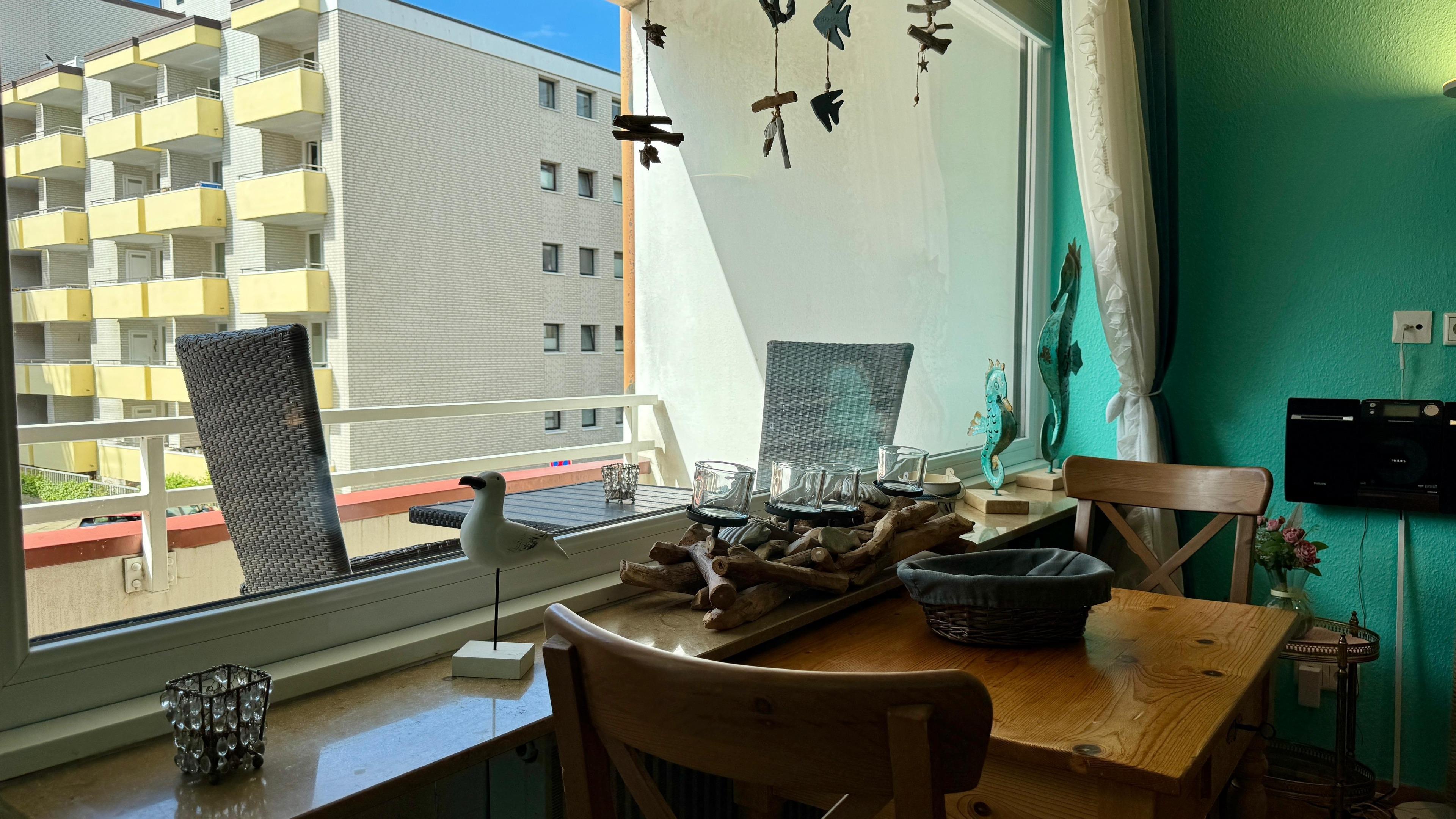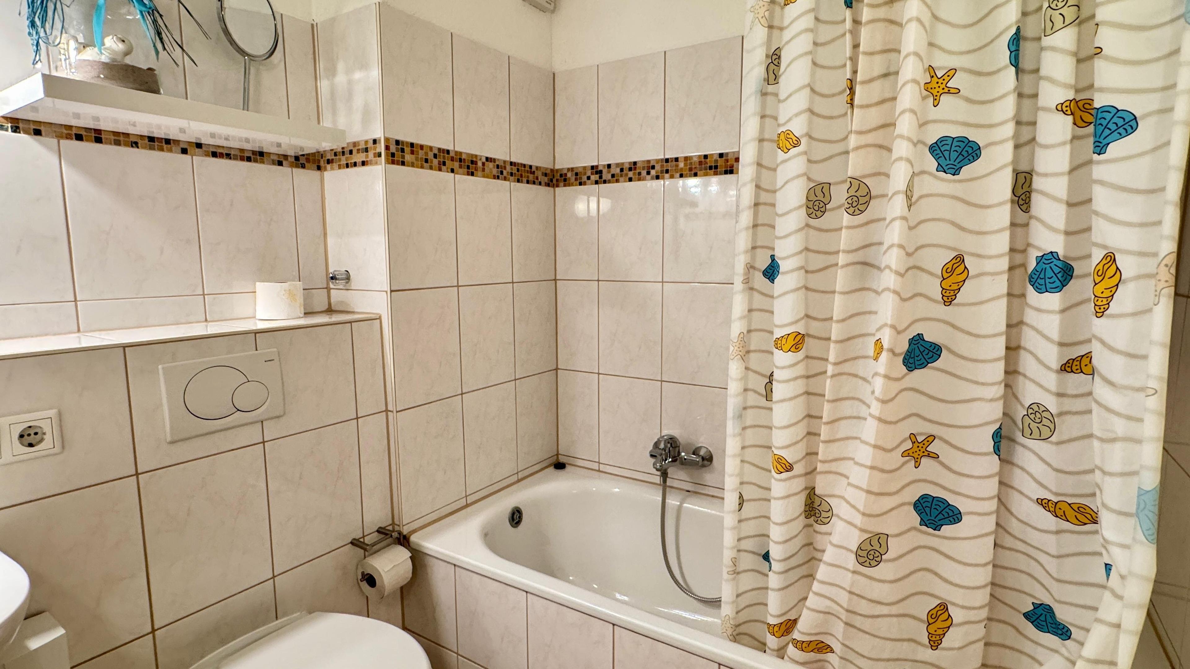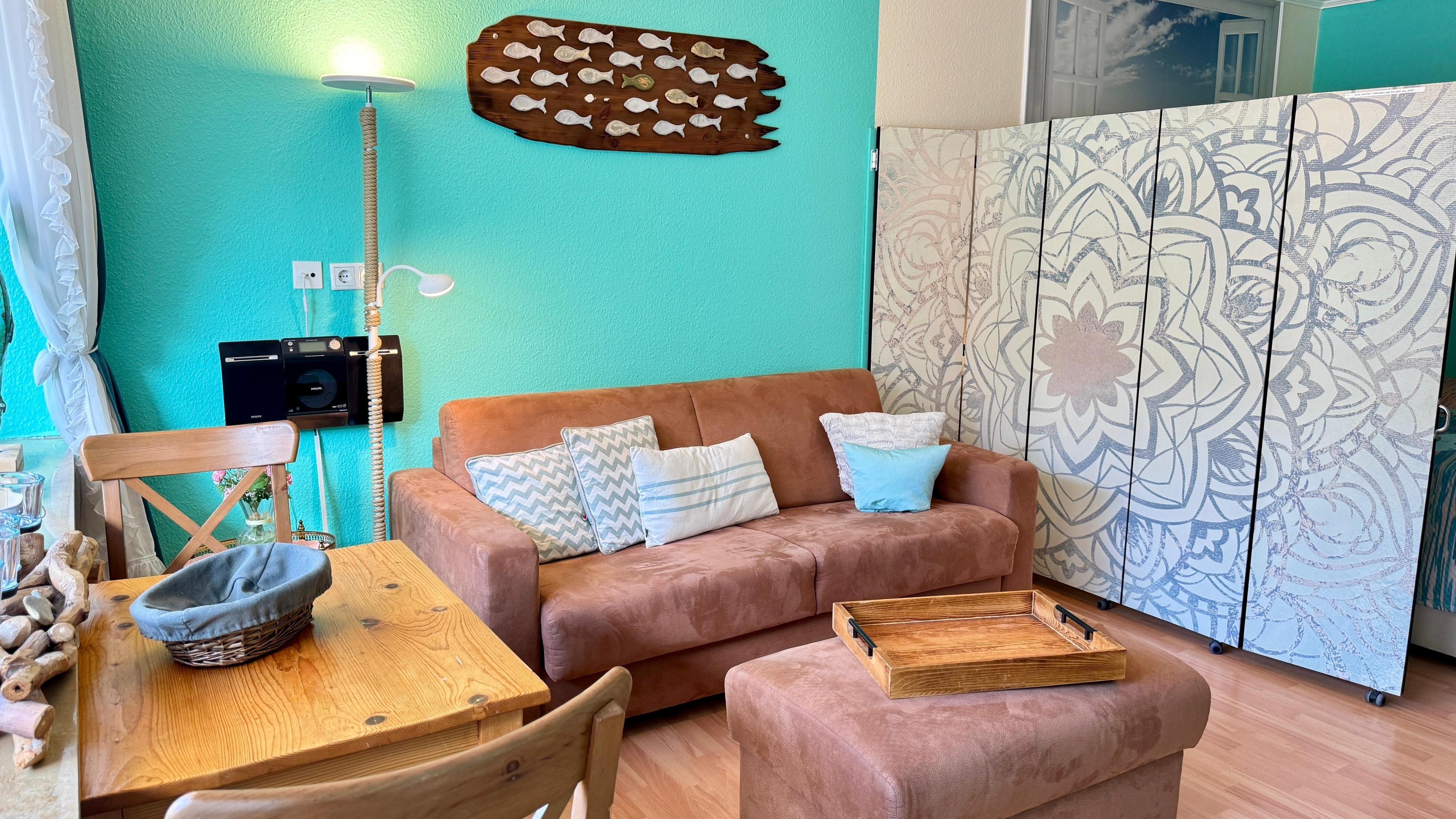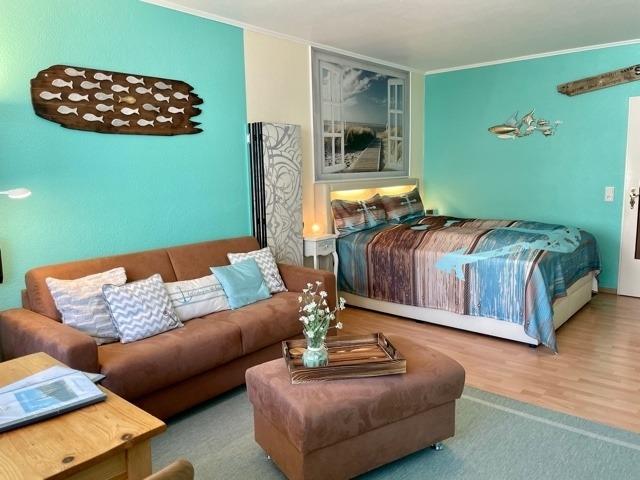 Das im 1. OG gelegene Einzimmerappartement, mit Westbalkon, erreichen Sie bequem auch mit dem Fahrstuhl. Im Eingangsbereich befindet sich die Küchenzeile mit Geschirrspüler, Mikrowelle, Cerankochfeld usw. Nun betreten Sie den leicht maritim gestalteten Wohn- und Schlafbereich. Das Boxspringbett, in komfortabler Höhe und mit geteilter Matratze (2 x 80 x 200), kann durch einen Paravent optisch vom Wohnbereich getrennt werden. Hier finden Sie eine zusätzliche Schlafcouch, den Essplatz, einen Kleiderschrank, sowie einen Flat-TV und eine Stereoanlage. Ein Internetzugang via WLAN (ohne Gewähr) ist ebenso vorhanden. Im geräumigen Vollbad gibt es einen festinstallierten Fön und einen Handtuchheizkörper.