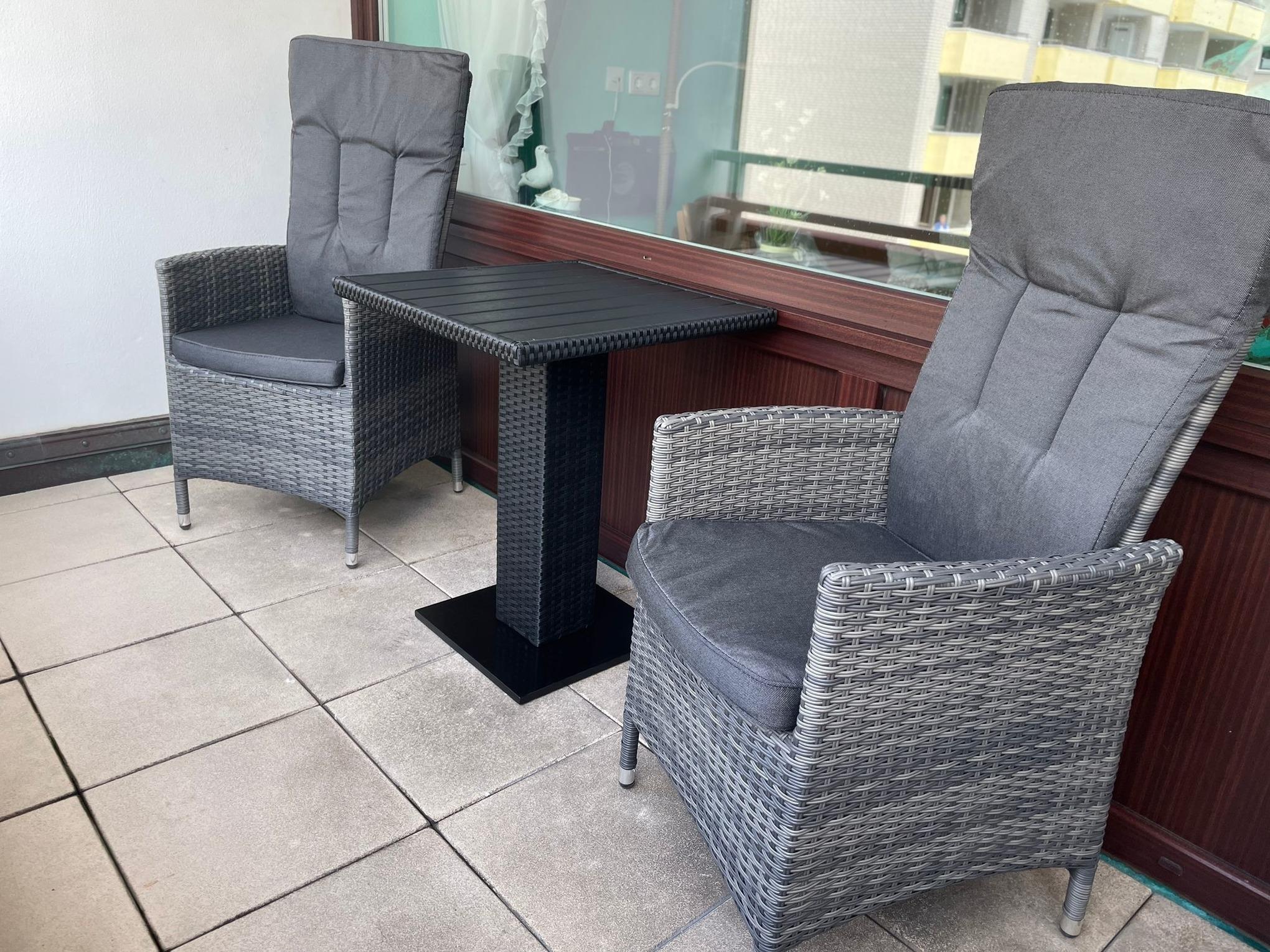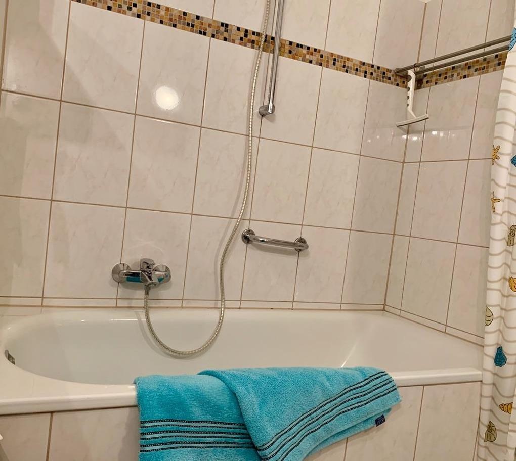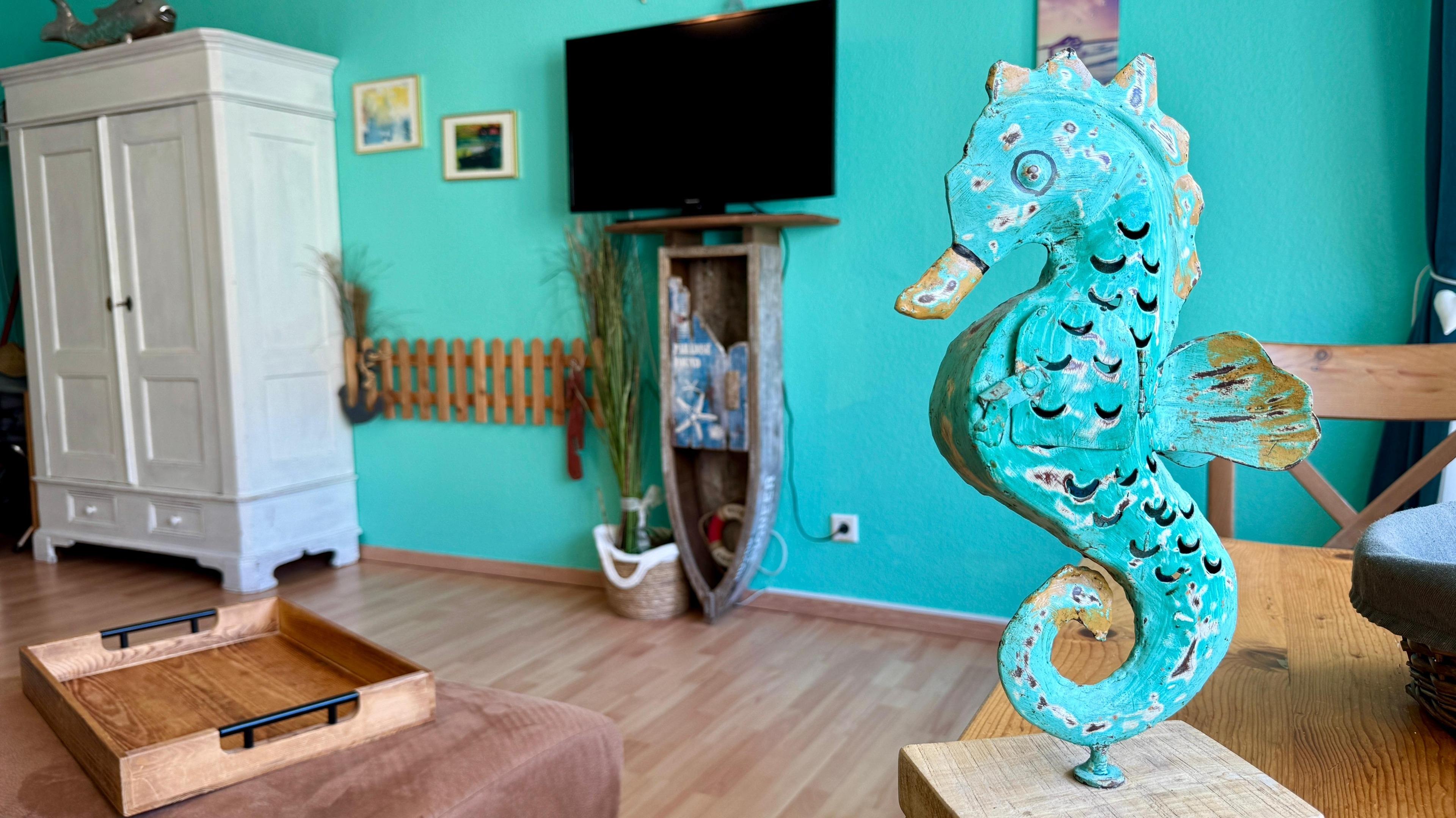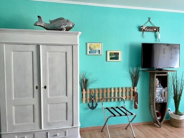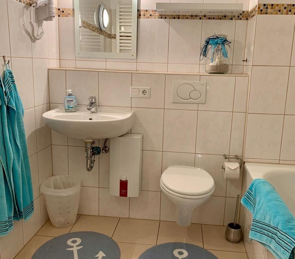 Das im 1. OG gelegene Einzimmerappartement, mit Westbalkon, erreichen Sie bequem auch mit dem Fahrstuhl. Im Eingangsbereich befindet sich die Küchenzeile mit Geschirrspüler, Mikrowelle, Cerankochfeld usw. Nun betreten Sie den leicht maritim gestalteten Wohn- und Schlafbereich. Das Boxspringbett, in komfortabler Höhe und mit geteilter Matratze (2 x 80 x 200), kann durch einen Paravent optisch vom Wohnbereich getrennt werden. Hier finden Sie eine zusätzliche Schlafcouch, den Essplatz, einen Kleiderschrank, sowie einen Flat-TV und eine Stereoanlage. Ein Internetzugang via WLAN (ohne Gewähr) ist ebenso vorhanden. Im geräumigen Vollbad gibt es einen festinstallierten Fön und einen Handtuchheizkörper.