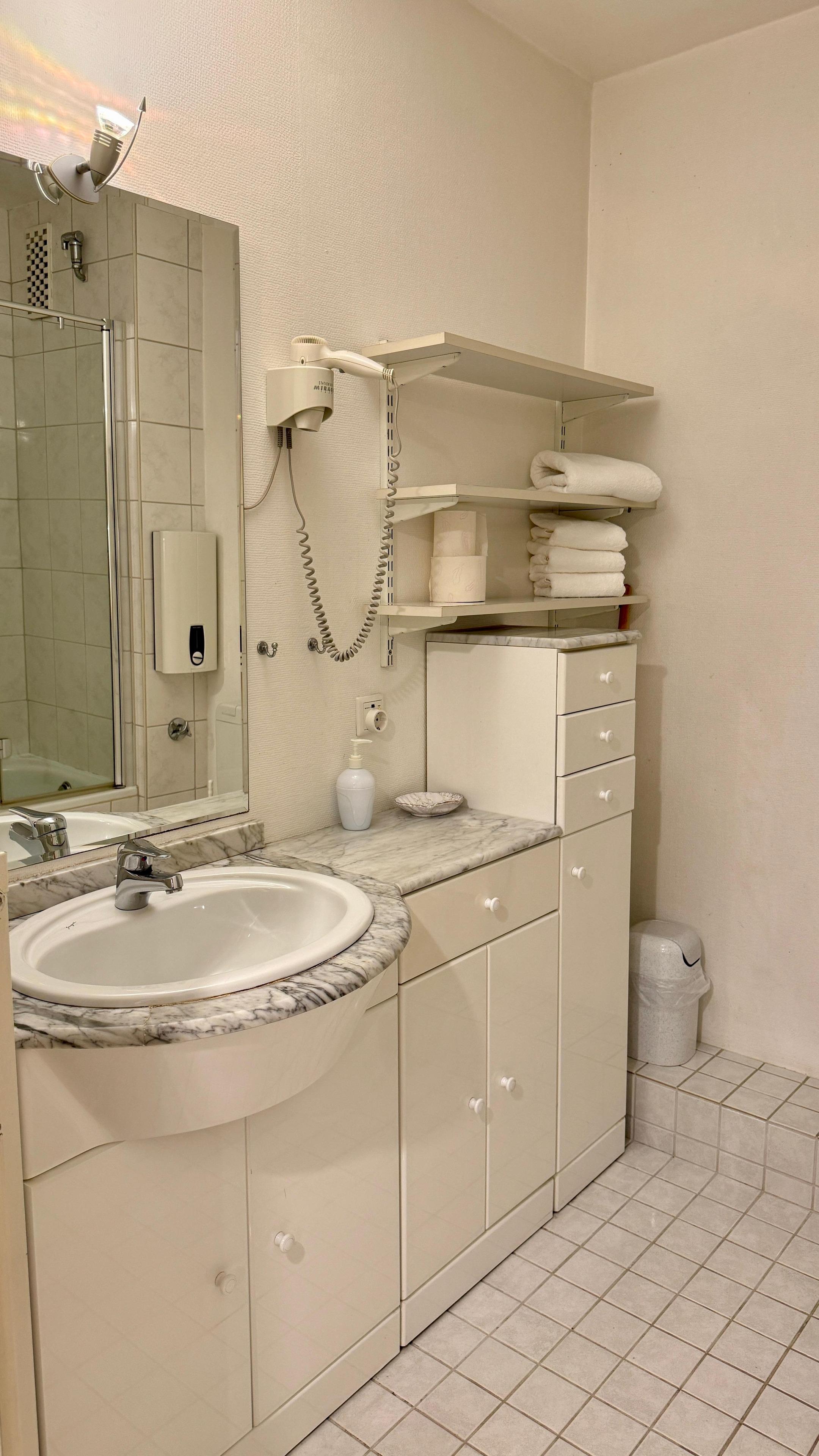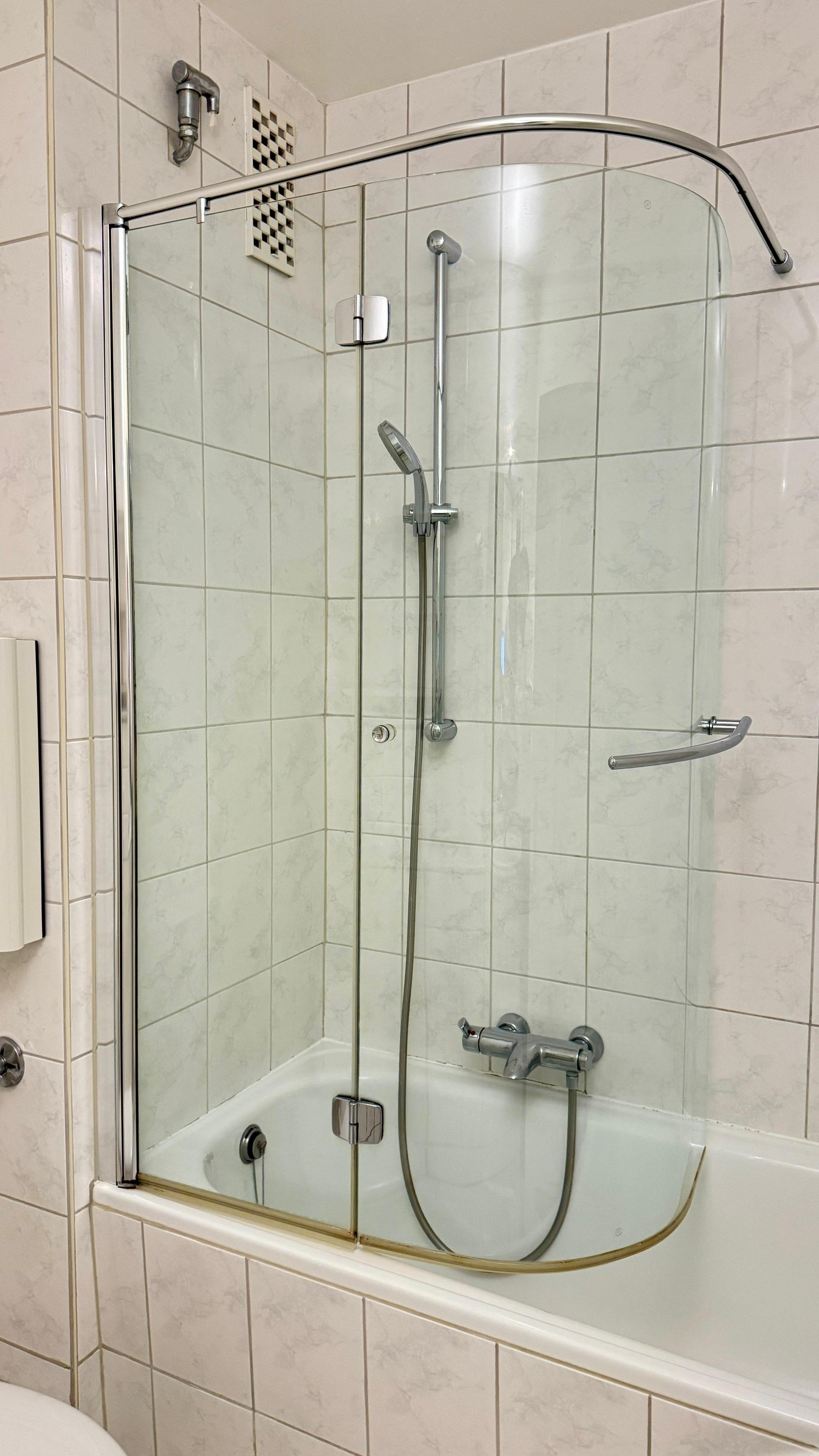 Im hell gefliesten Badezimmer steht Ihnen eine Badewanne mit Duschkabine zur Verfügung.