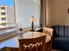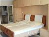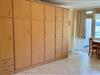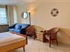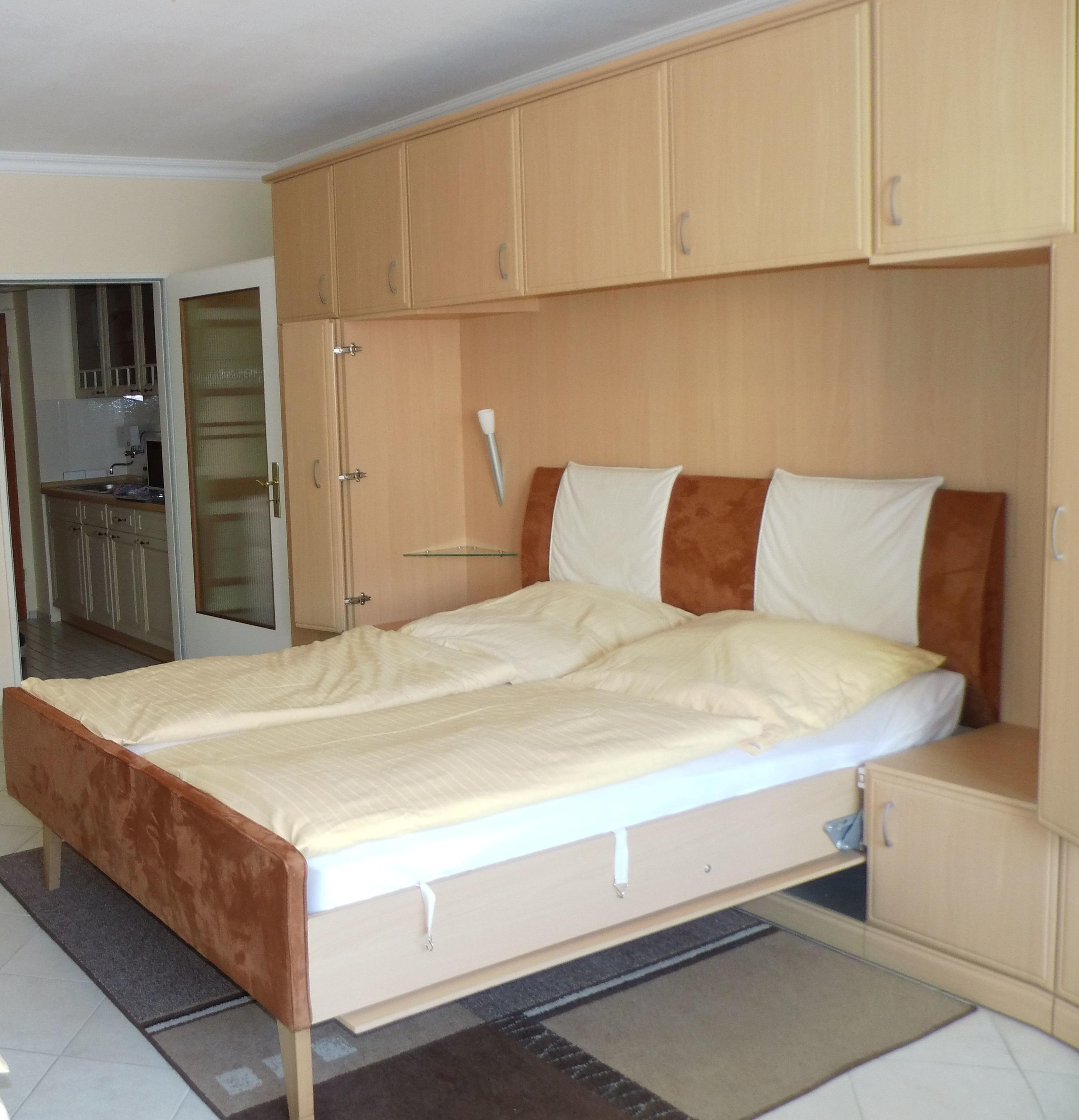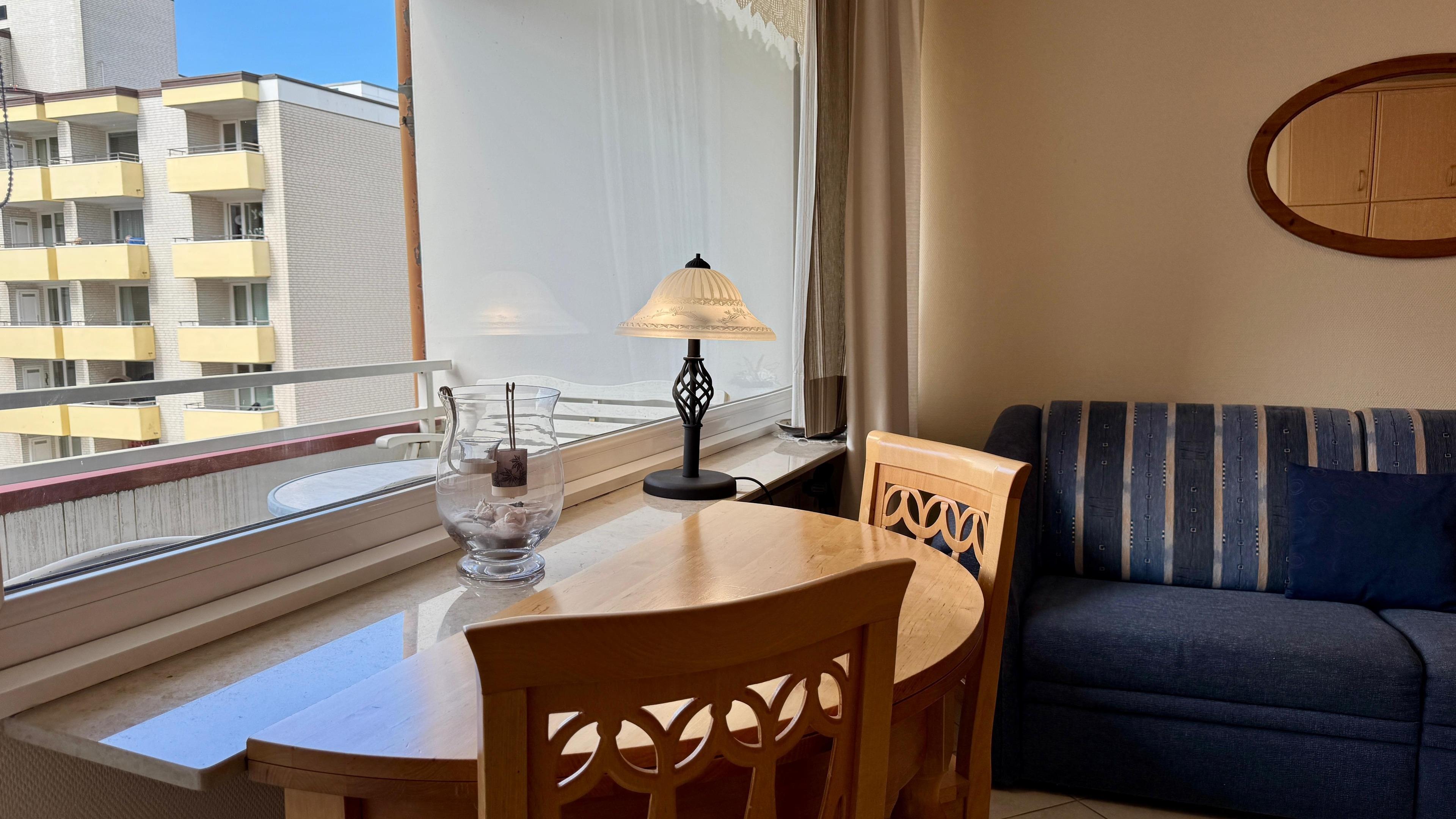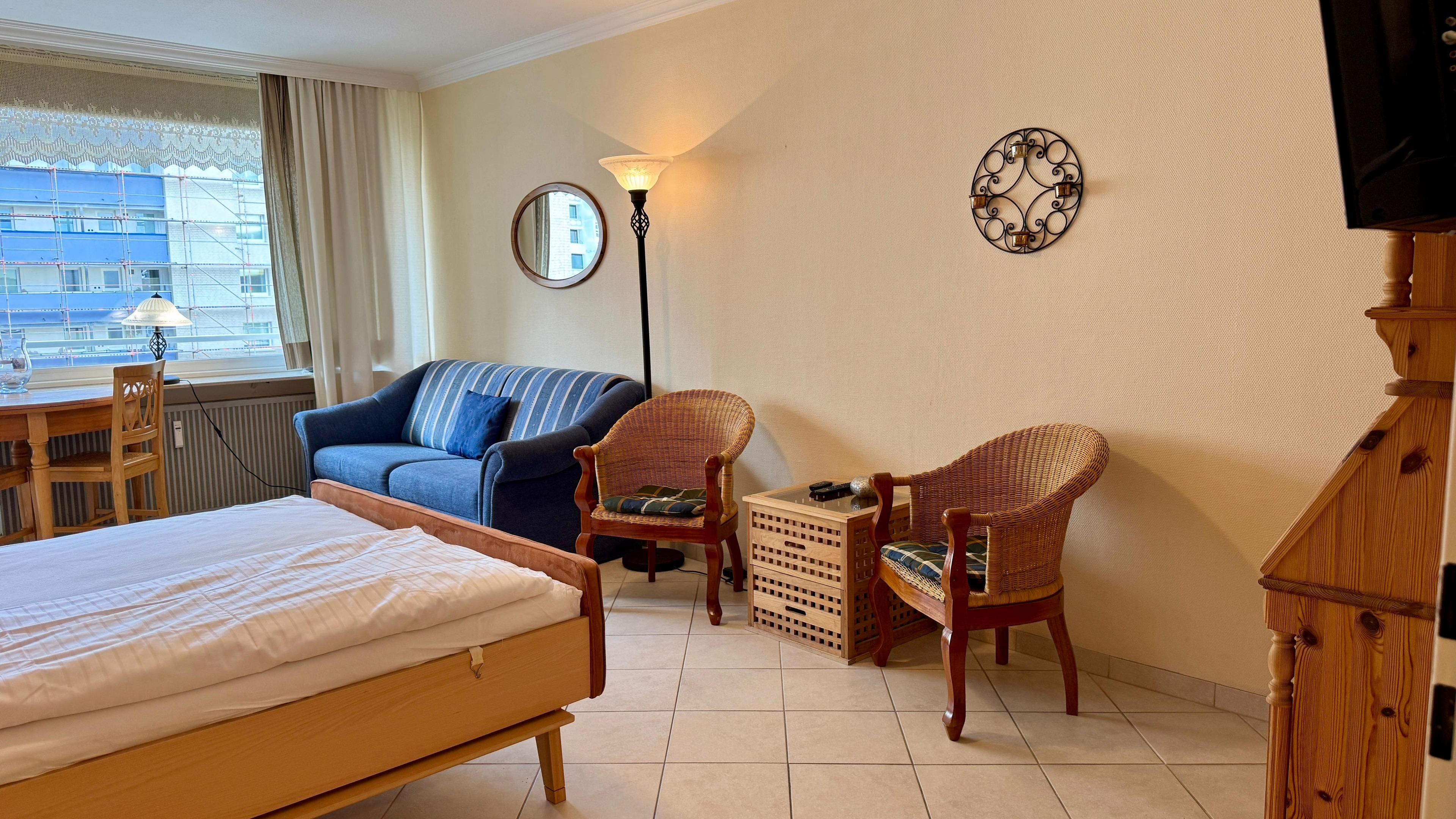 Im Wohn/Schlafraum befindet sich eine beigefarbene Appartementwand mit einem ausklappbaren Doppelbett, eine blaue Schlafcouch (für die dritte Person), ein runder Holz-Esstisch mit zwei Stühlen und zwei Ersatzstühlen an der Wand, ein rustikaler Aufsatzsekretär mit zwei Korbstühlen, sowie ein Flachbildfernseher und eine Stereoanlage an der Wand hängend. Internetzugang via WLAN (ohne Gewähr). Der Fußboden ist hell gefliest. Der sonnige Balkon geht zum Westen hinaus.