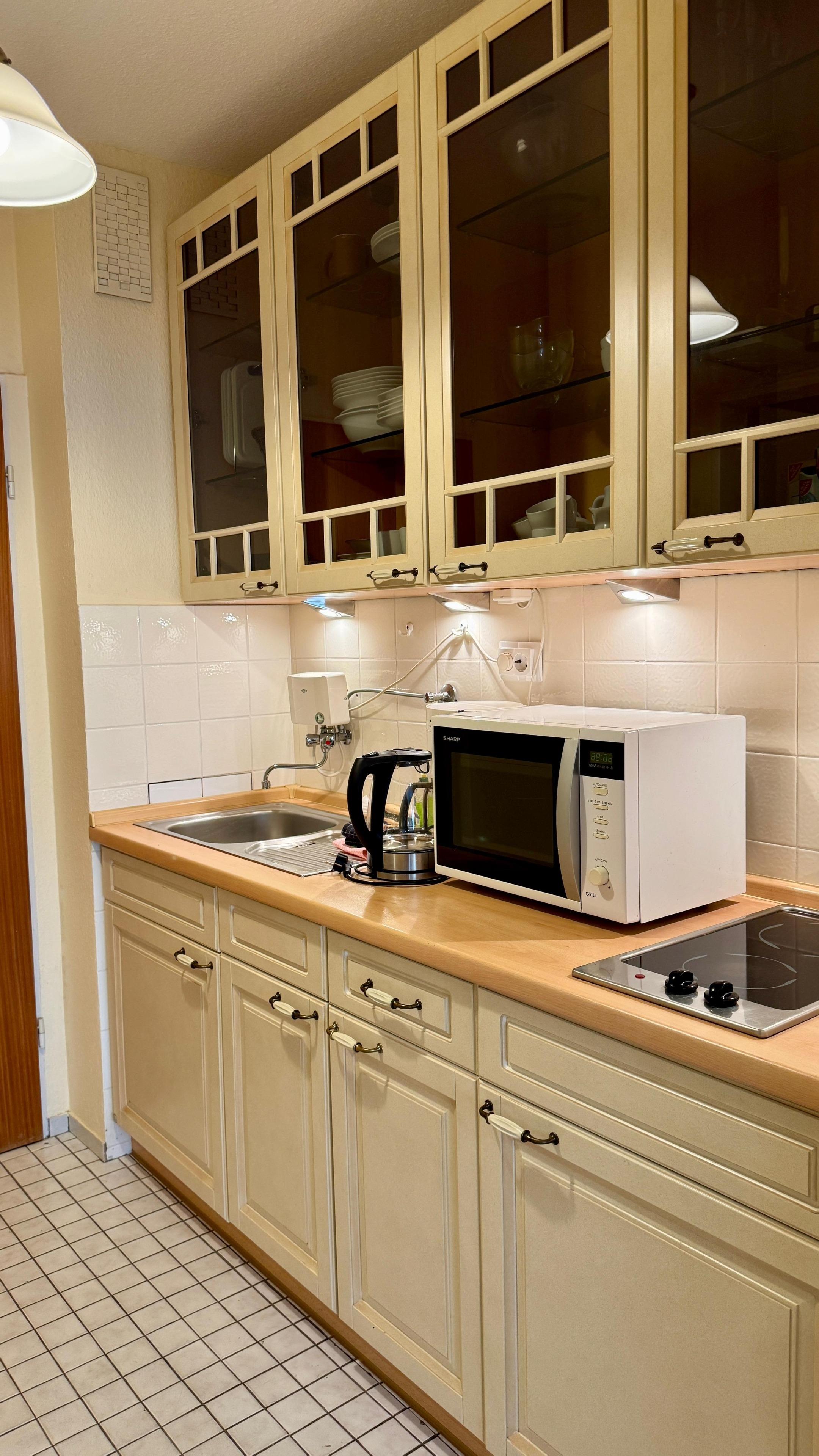 Im Flurbereich befindet sich eine Küchenzeile im Landhausstil mit Ceranfeld (2 Kochfelder) und eine Mikrowelle mit Grillfunktion.