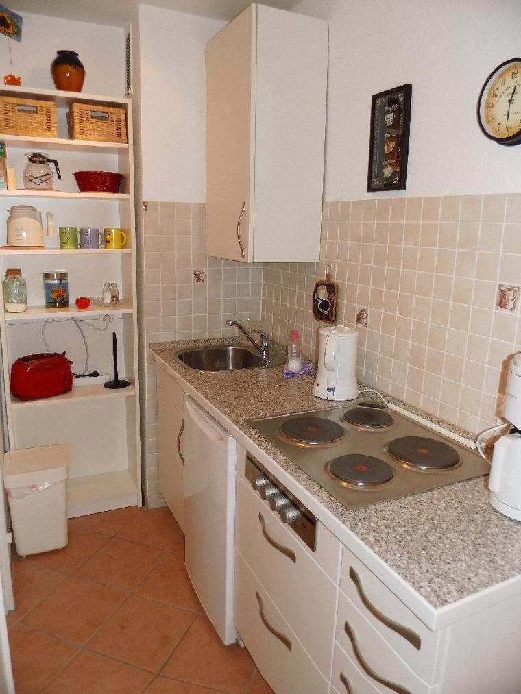 Das Appartement verfügt über eine voll ausgestattete Küche mit Kühlschrank, Kaffeemaschine, Wasserkocher, Toaster, Mikrowelle und einem 4-Platten E-Herd. Im hell gefliesten Badezimmer befindet sich, neben der Toilette und dem Waschbecken, eine Dusche und ein großer Spiegelschrank.