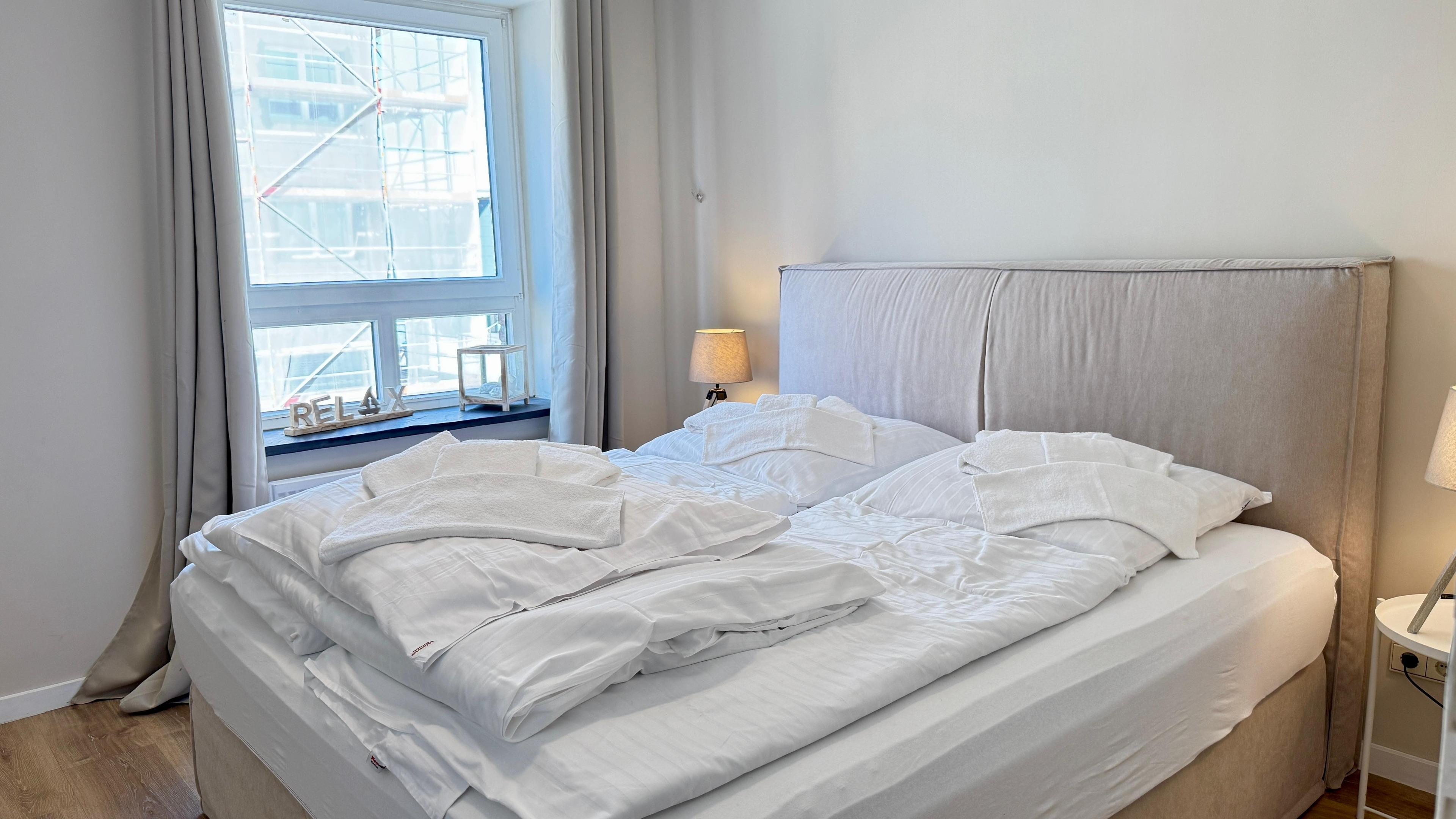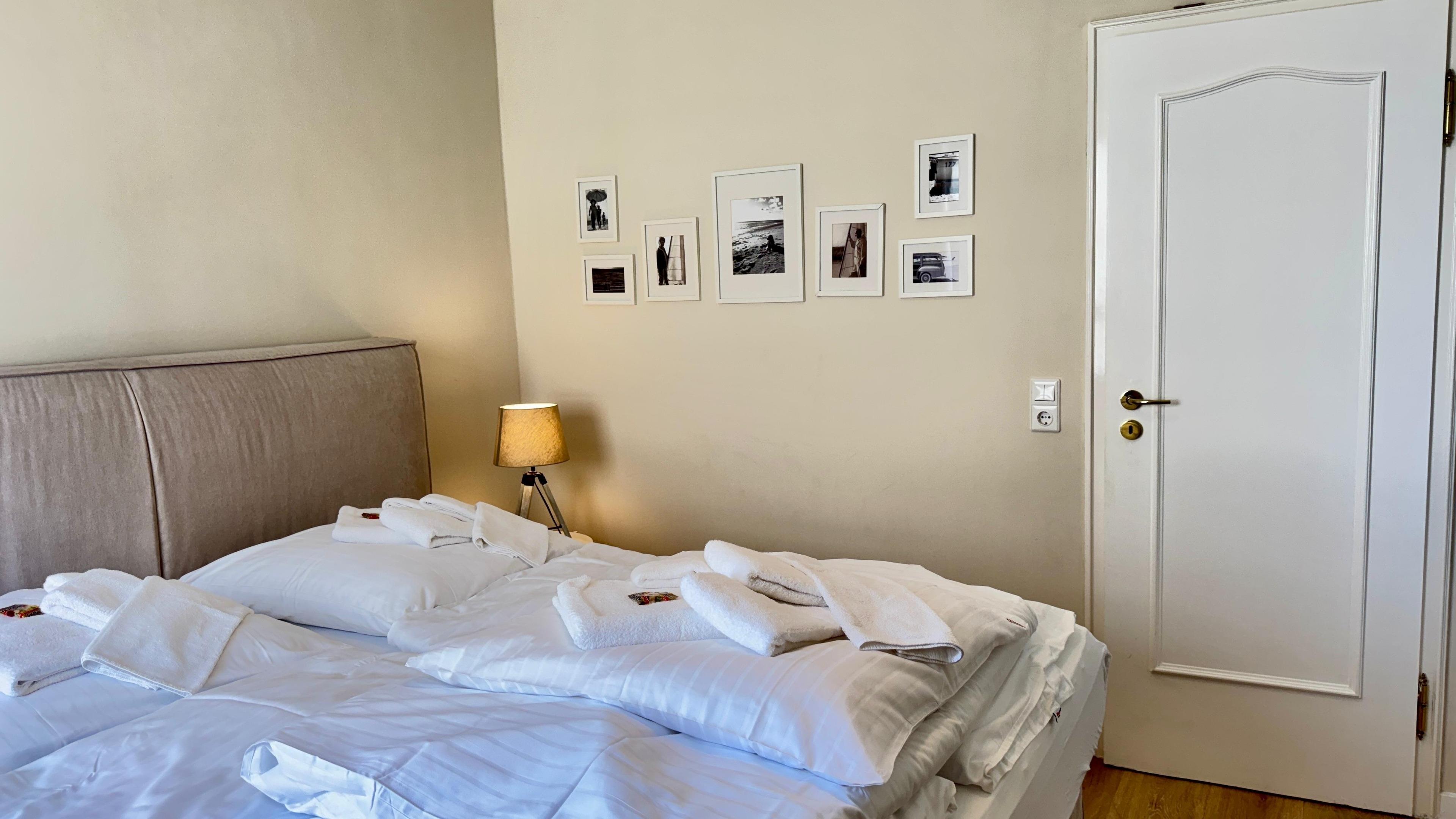 Im Schlafzimmer steht Ihnen ein großes Boxspringbett 180 x 200 cm und zwei Kleiderschränke sowie eine kleine Bank zwischen den Schränken zur Verfügung.