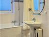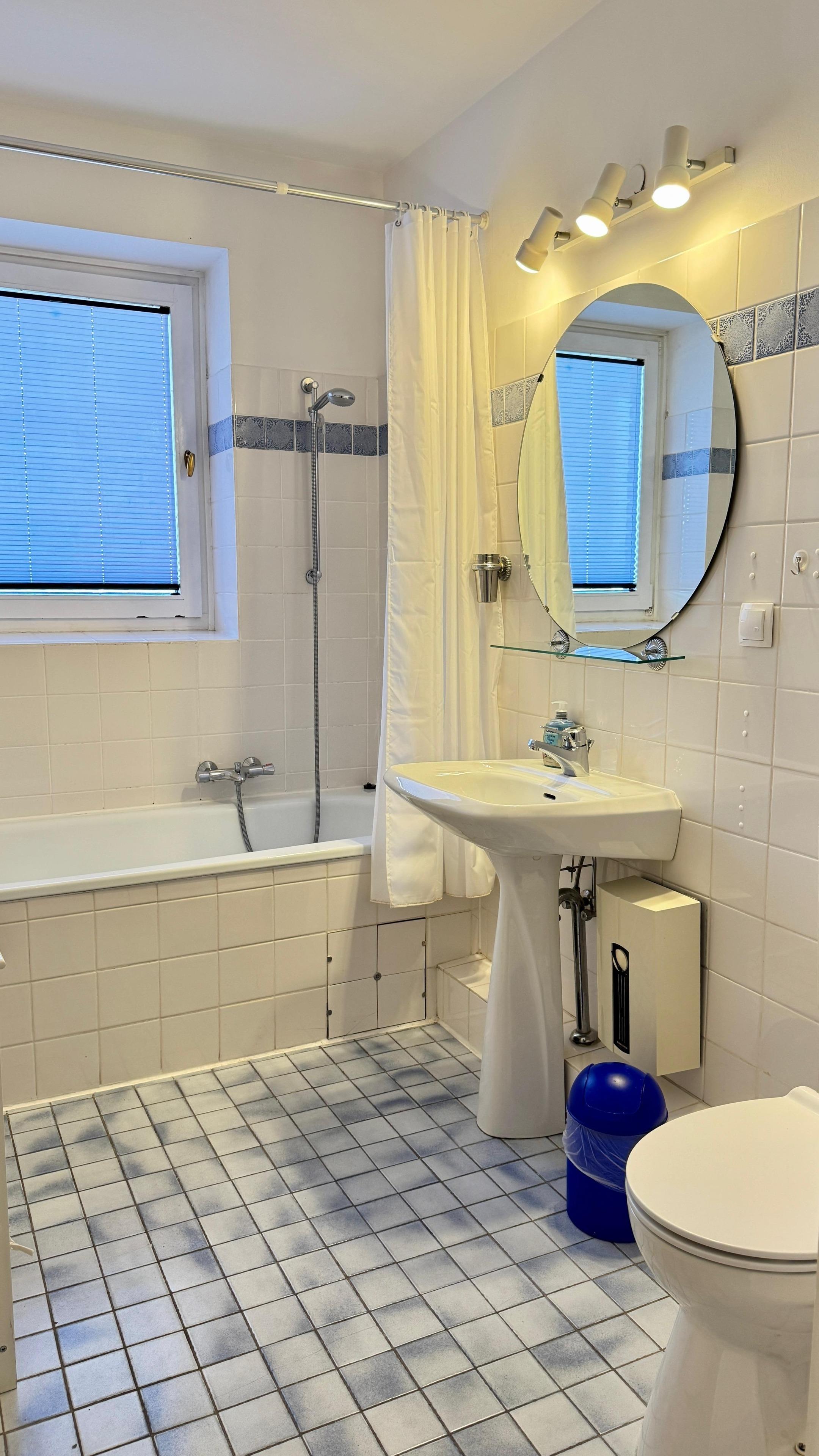 Das Badezimmer ist hell gefliest und bietet eine Badewanne mit Duschvorrichtung, Waschbecken und WC. Ablagemöglichkeiten und Handtuchhalter stehen ebenfalls bereit.