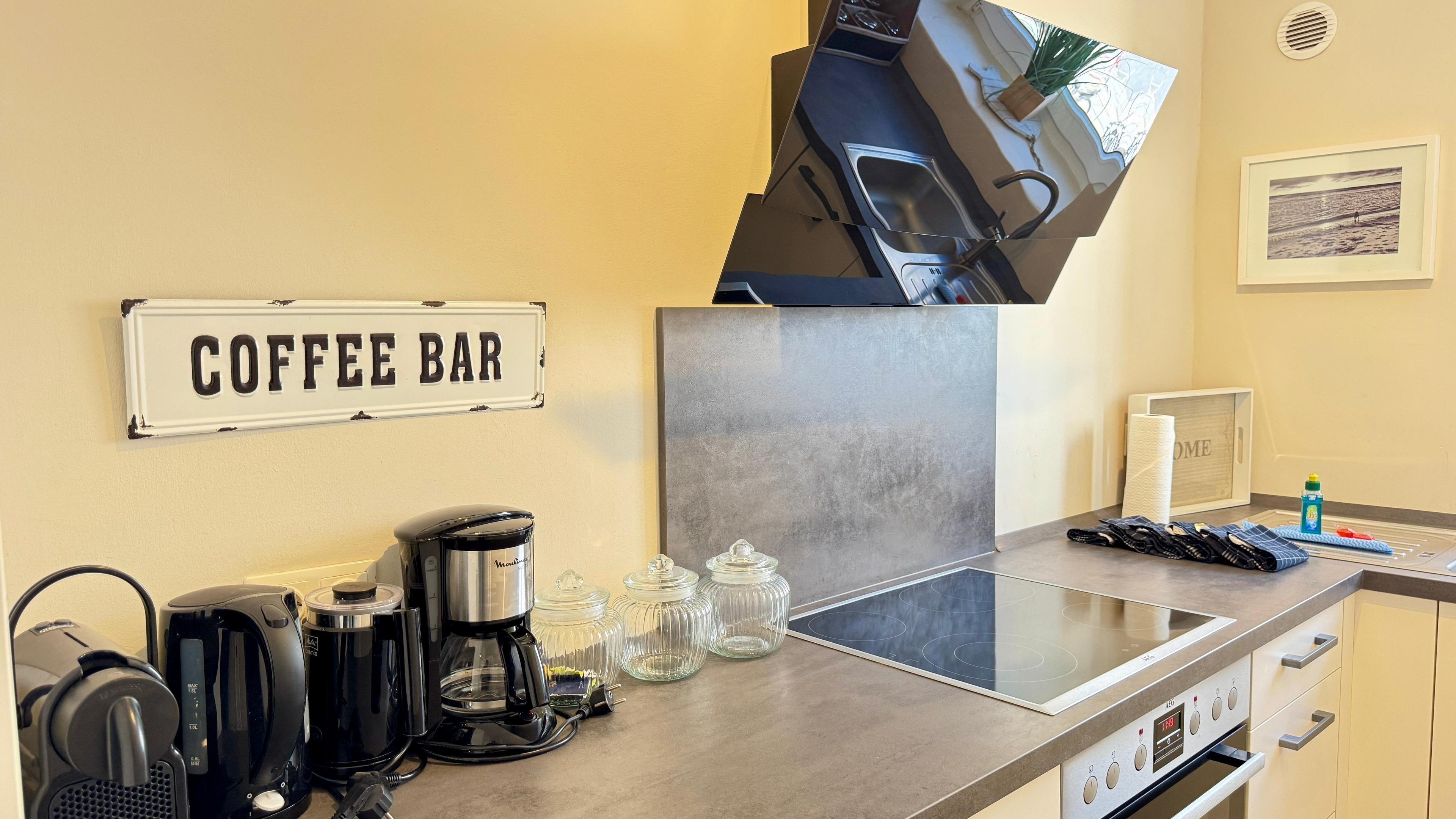 Die neue Küche verfügt über folgende Merkmale: Geschirrspüler, 4er Cerankochfeld, modernen Backofen, Kaffeemaschine, Nespressomaschine, Wasserkocher, Toaster und natürlich einen Kühlschrank und die üblichen Küchenutensilien.