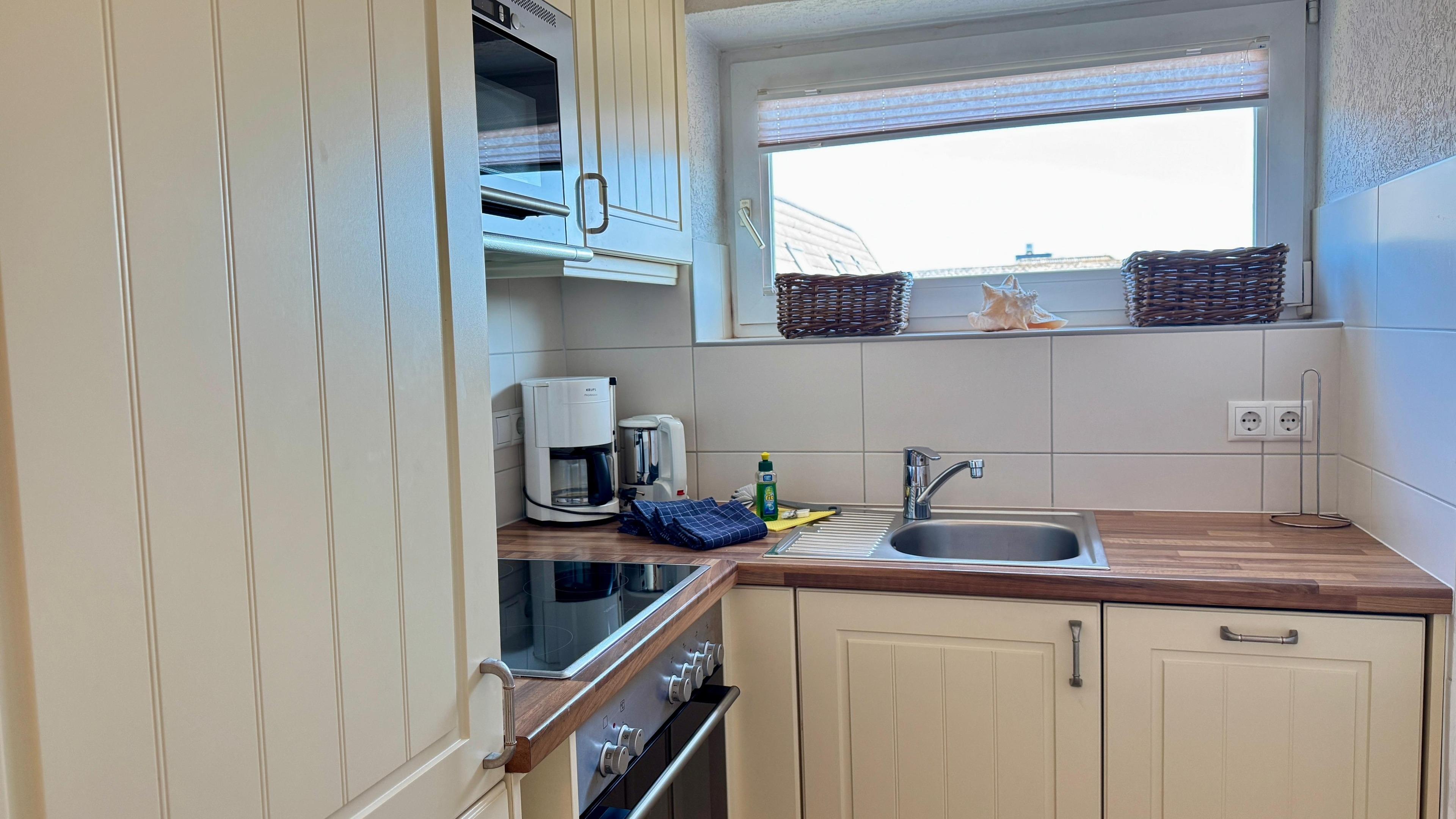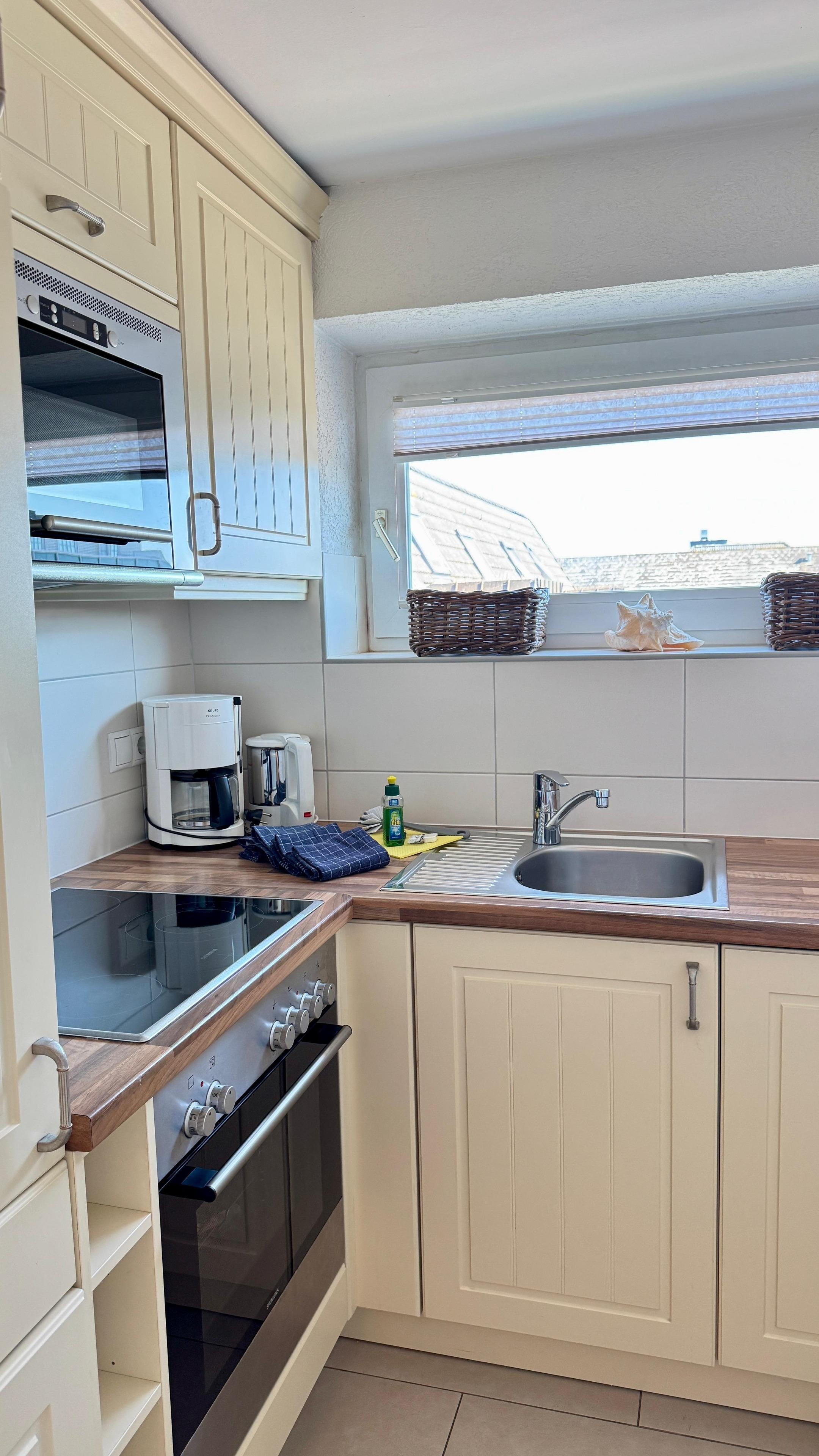 Die Küche bietet eine kleine, voll ausgestattete Einbauküche mit Kühlschrank und integriertem Gefrierfach, Backofen, Cerankochfeld mit 4 Platten, Spüle, Geschirrspüler und integrierter Mikrowelle. Die Küche verfügt über ein separates Fenster.