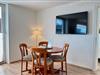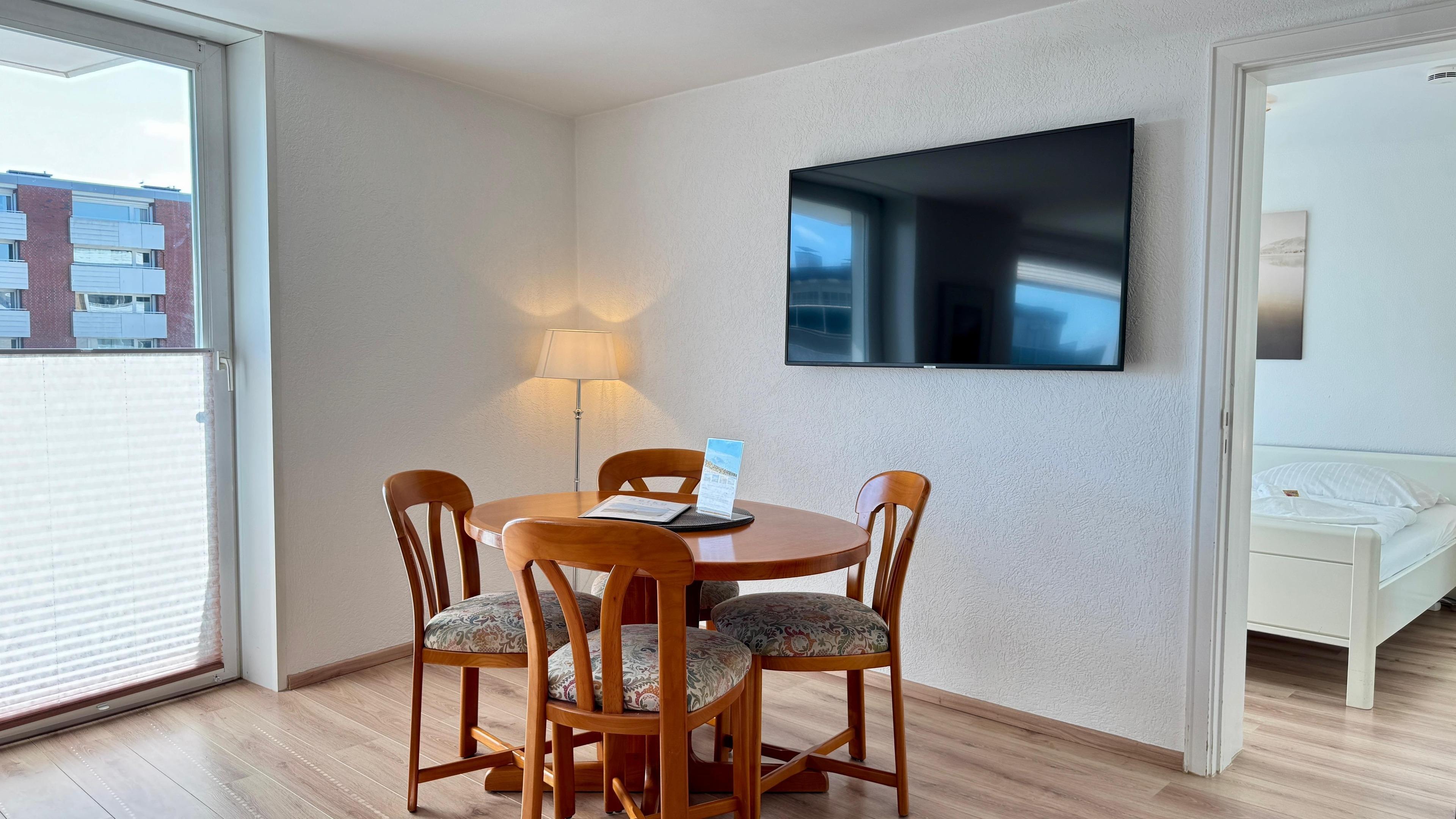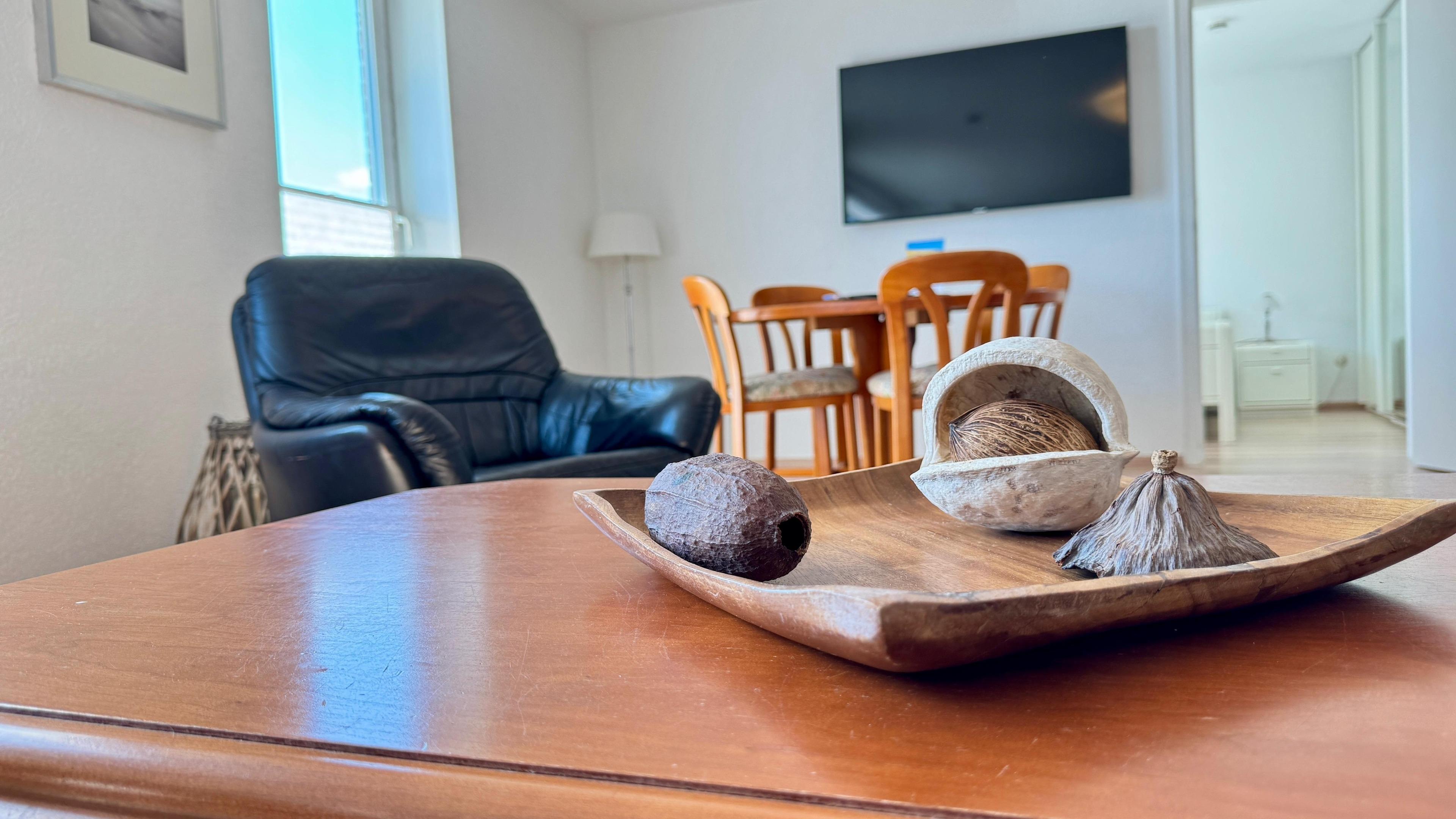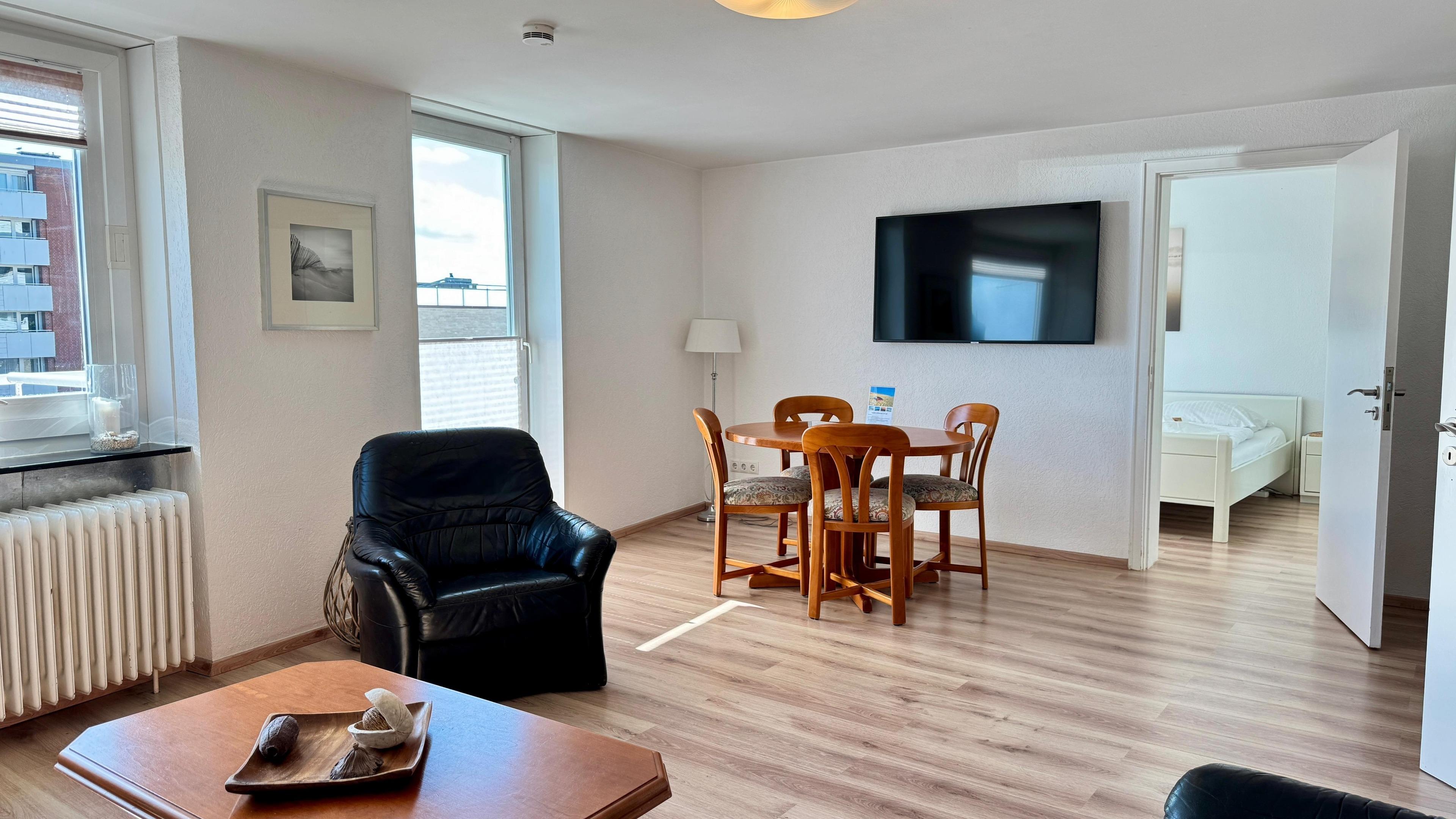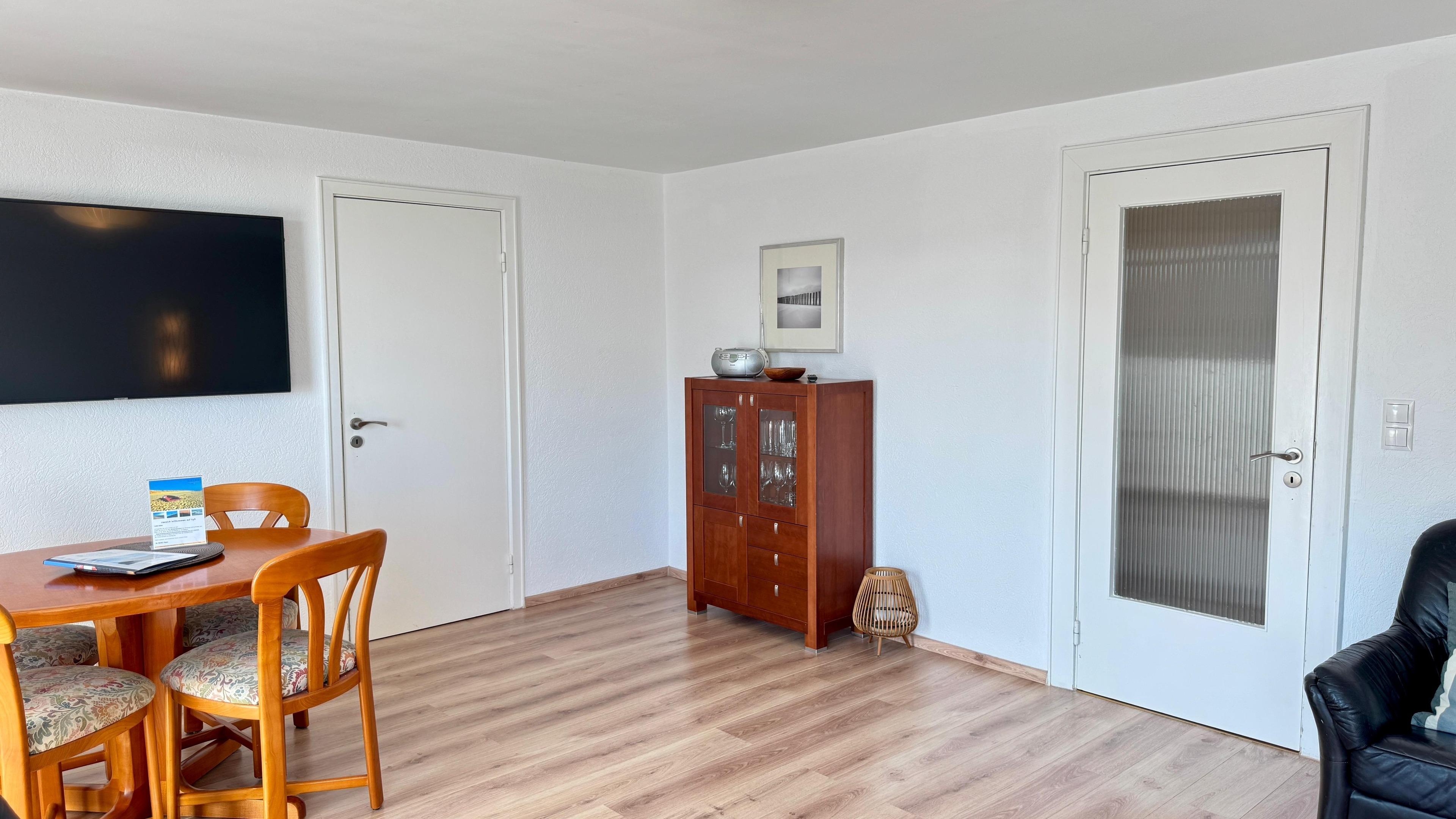 Im Wohnzimmer befinden sich neben einer schwarzen Ledergarnitur Massivholzmöbel. Ein separarter Esstisch steht Ihnen mit vier Sitzplätzen zur Verfügung. Die beiden Zimmer sind einheitlich mit Laminat ausgelegt. Ein 55 Zoll-Flachbildschirm rundet das bequeme und moderne Wohnzimmer ab. Der Balkon zum Osten hin bietet einen tollen Blick zum Sonnenaufgang.