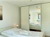 Das Schlafzimmer ist mit einem Doppelbett (bzw. auf Wunsch zwei Einzelbetten), Nachttischen und einem dreitürigen Schrank mit Schiebetüren und integriertem Spiegel ausgestattet.
