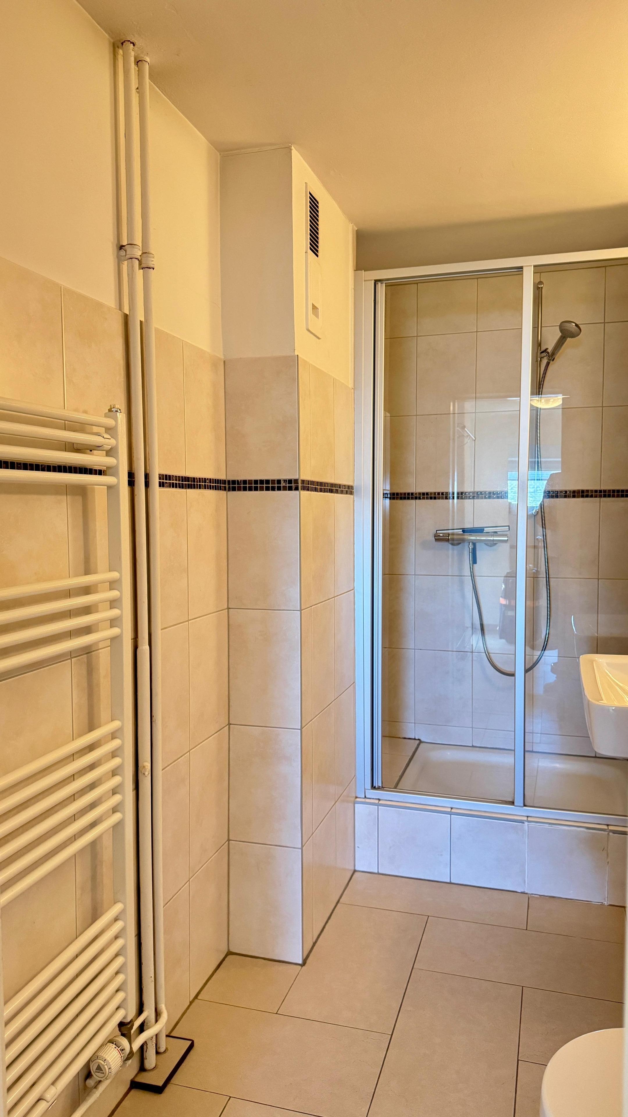 In dem Bad befindet sich eine großzügige Dusche, Waschtisch, WC und ein beheizter Handtuchhalter.