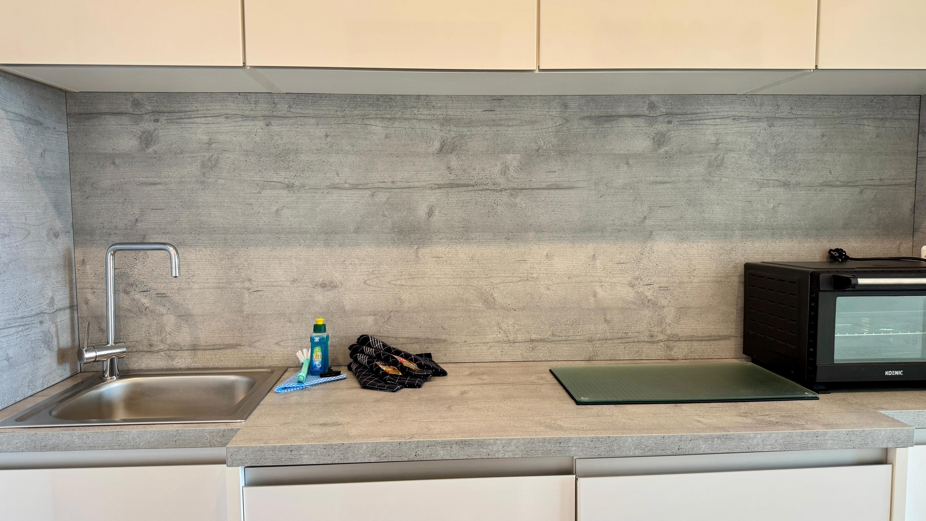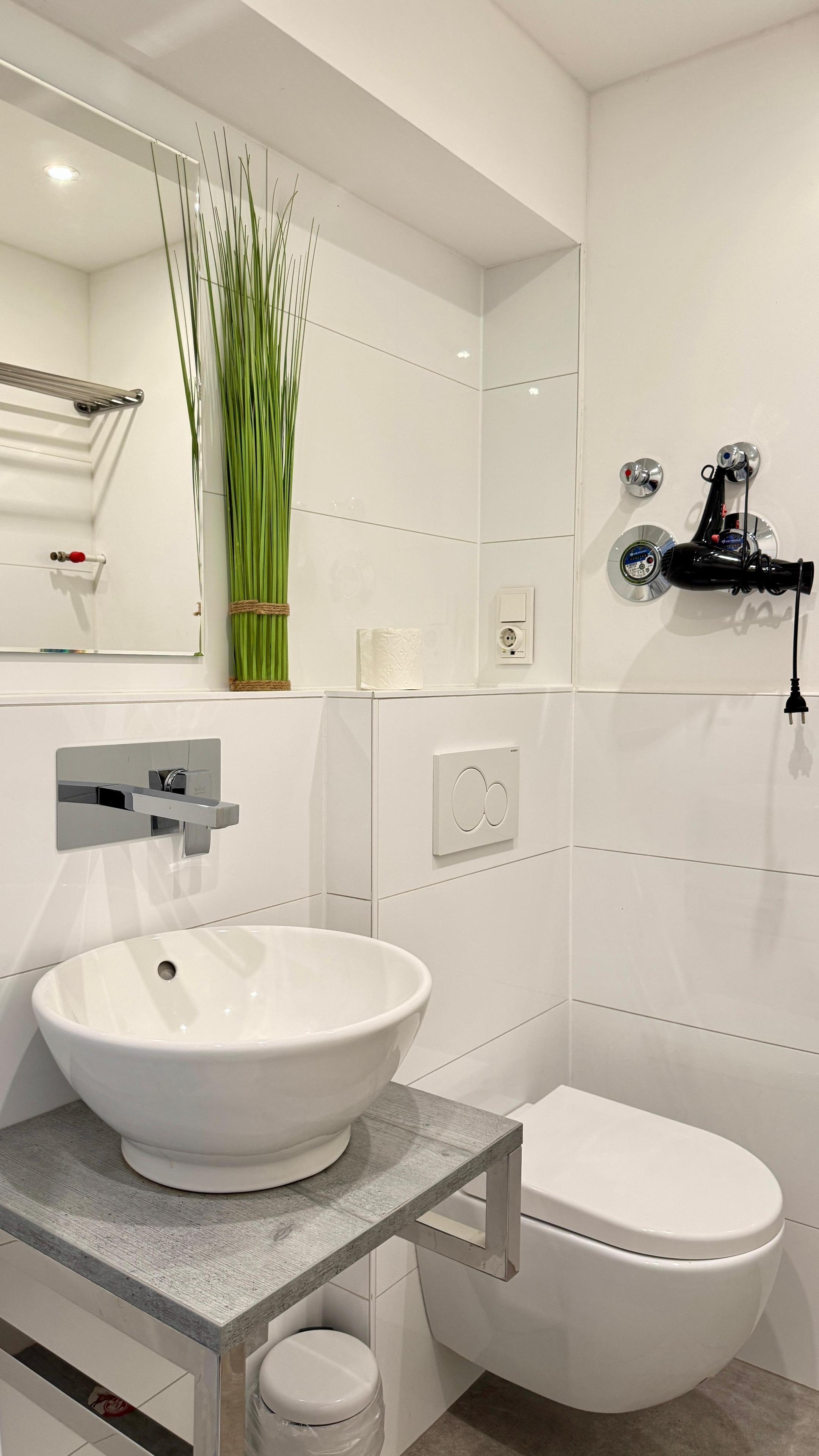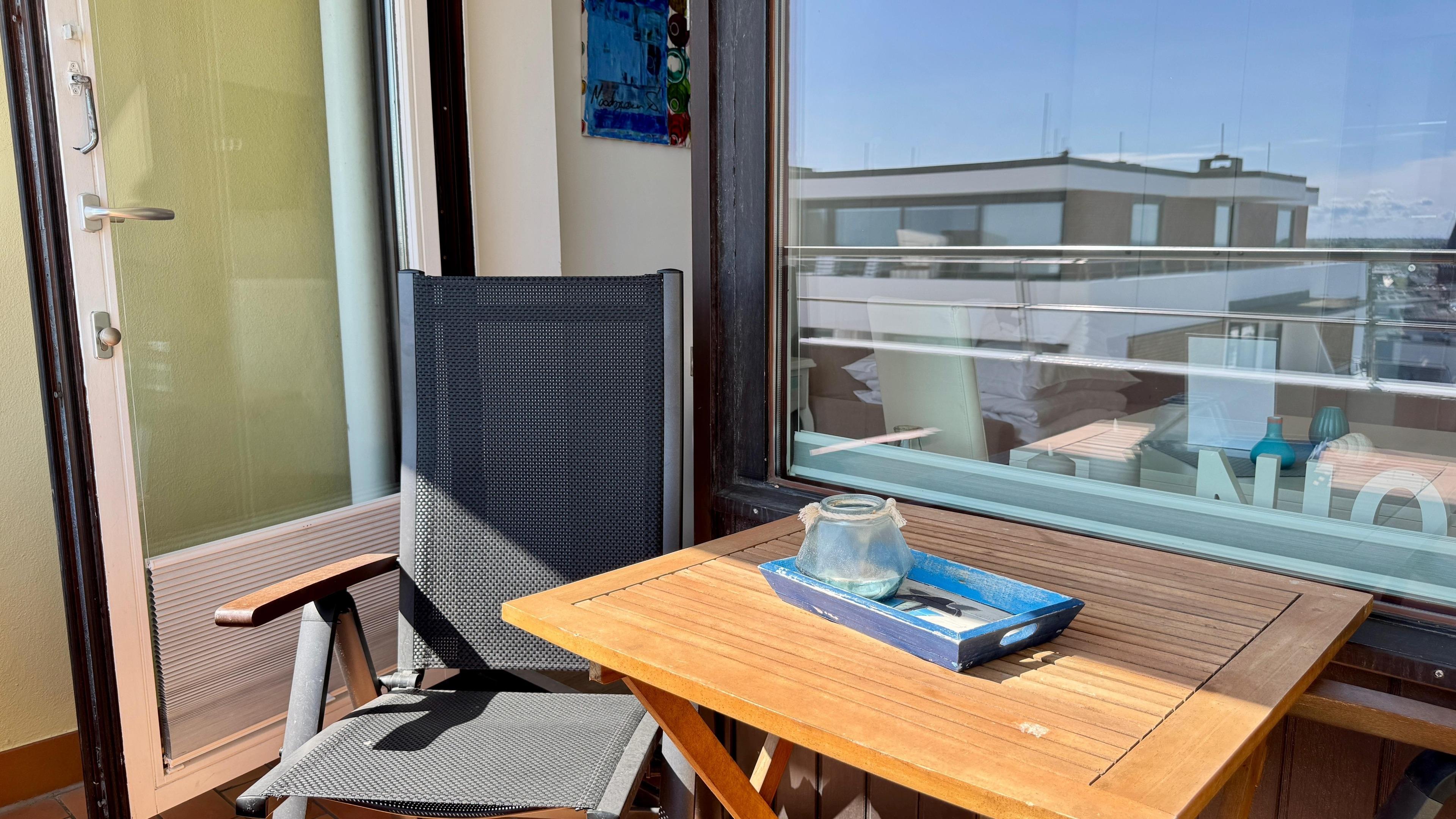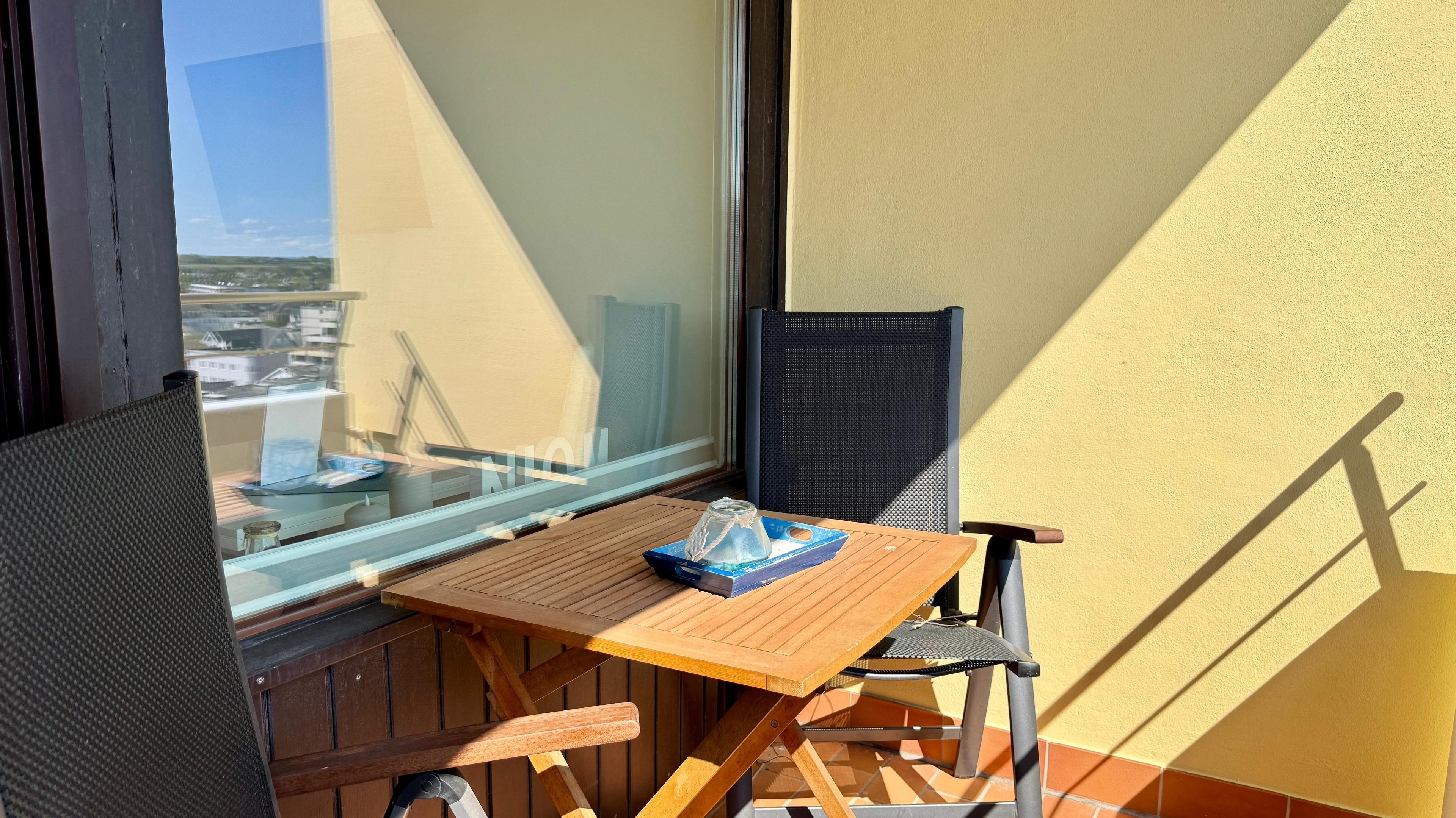 Der Ost-Balkon bietet einen herrlichen Blick über die Stadt und darüber hinaus. Im Flurbereich befindet sich eine helle Einbauküche mit einem Ceran Kochfeld und Kühlschrank. Das moderne Duschbad ist weiß gefliest. Die Dusche verfügt über einen Flacheinstieg und eine Regenwaldbrause, Handtuchheizung und Ablageflächen sind ebenfalls vorhanden. Es wurde ein hochwertiger Vinyl-Boden im Wohn- und Flurbereich verlegt. Neben einem Kleiderschrank, einer kleinen Kommode, einem Flachbild-TV (hängend) finden Sie im Wohnbereich eine Schlafcouch mit einer Breite von 160 cm. Diese sehr hochwertige Schlafcouch wird zum Bett, wie mit einem Lattenrost und Matratze, sehr einfach in der Handhabung und wirklich bequem.