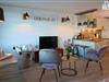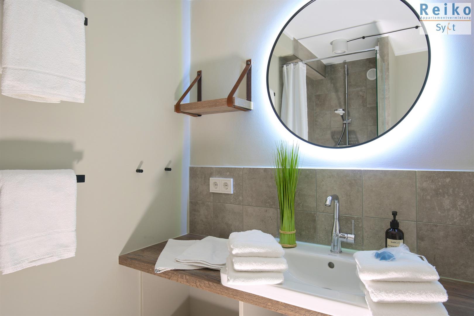 Im Wohn/Schlafraum befindet sich eine Sofa-Schlafkombination mit einzeln ausklappbaren Betten mit je 80x200 cm großen Matratzen sowie ein angeschlossener Essbreich mit zwei bequemen Sesseln am Fenster mit Nordseeblick. Ein Interentanschluss mit WLAN (ohne Gewähr) steht Ihnen zur Verfügung und ein 48 Zoll Flachbild-TV rundet das Bild ab. Die offene Wohnküche ist optisch durch einen Tresen vom Wohnbereich abgetrennt und sehr gut ausgestattet mit einer Mikrowelle, Geschirrspüler und einem 2-Platten-Cerankochfeld. Das Duschbad ist eine Kombination aus Holzelementen, grauen Fliesen und weißen Sanitärobjekten und sorgen für eine moderne Atmosphäre.