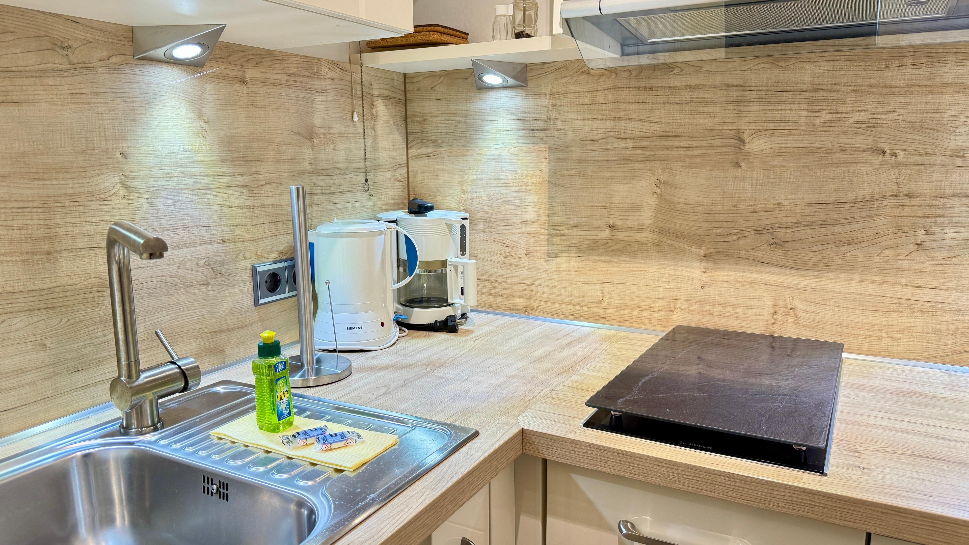 Die moderne Küche verfügt über einen Geschirrspüler, ein Cerankochfeld mit zwei Platten, eine Mikrowelle und einen Kühlschrank. Kaffeemaschine, Toaster und Wasserkocher sind ebenfalls vorhanden – so ist für alles gesorgt, was Sie für die Selbstversorgung benötigen.