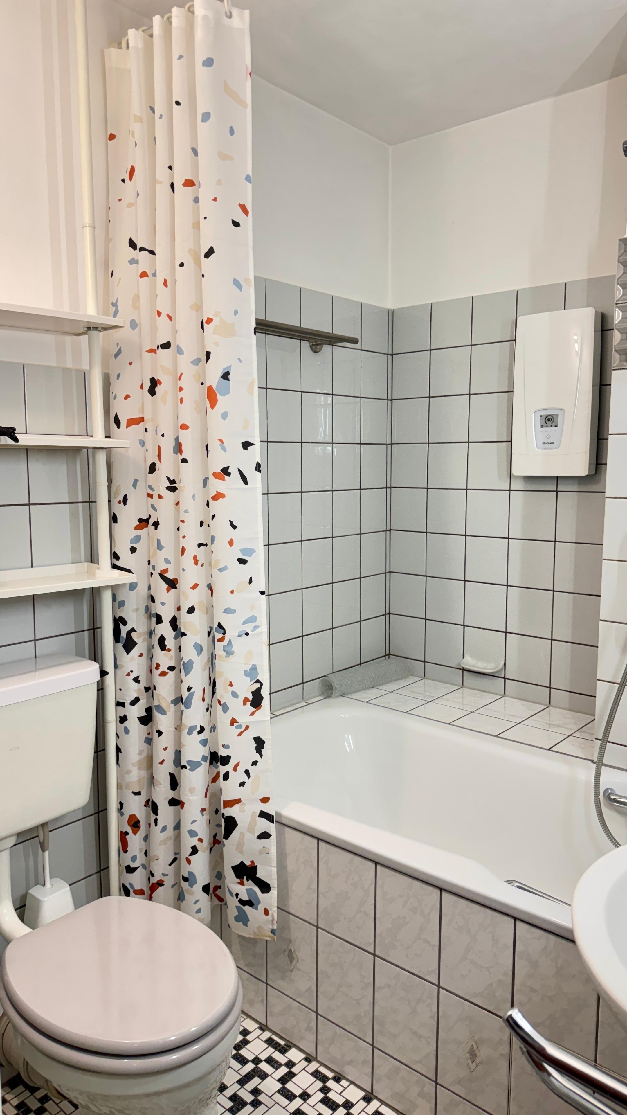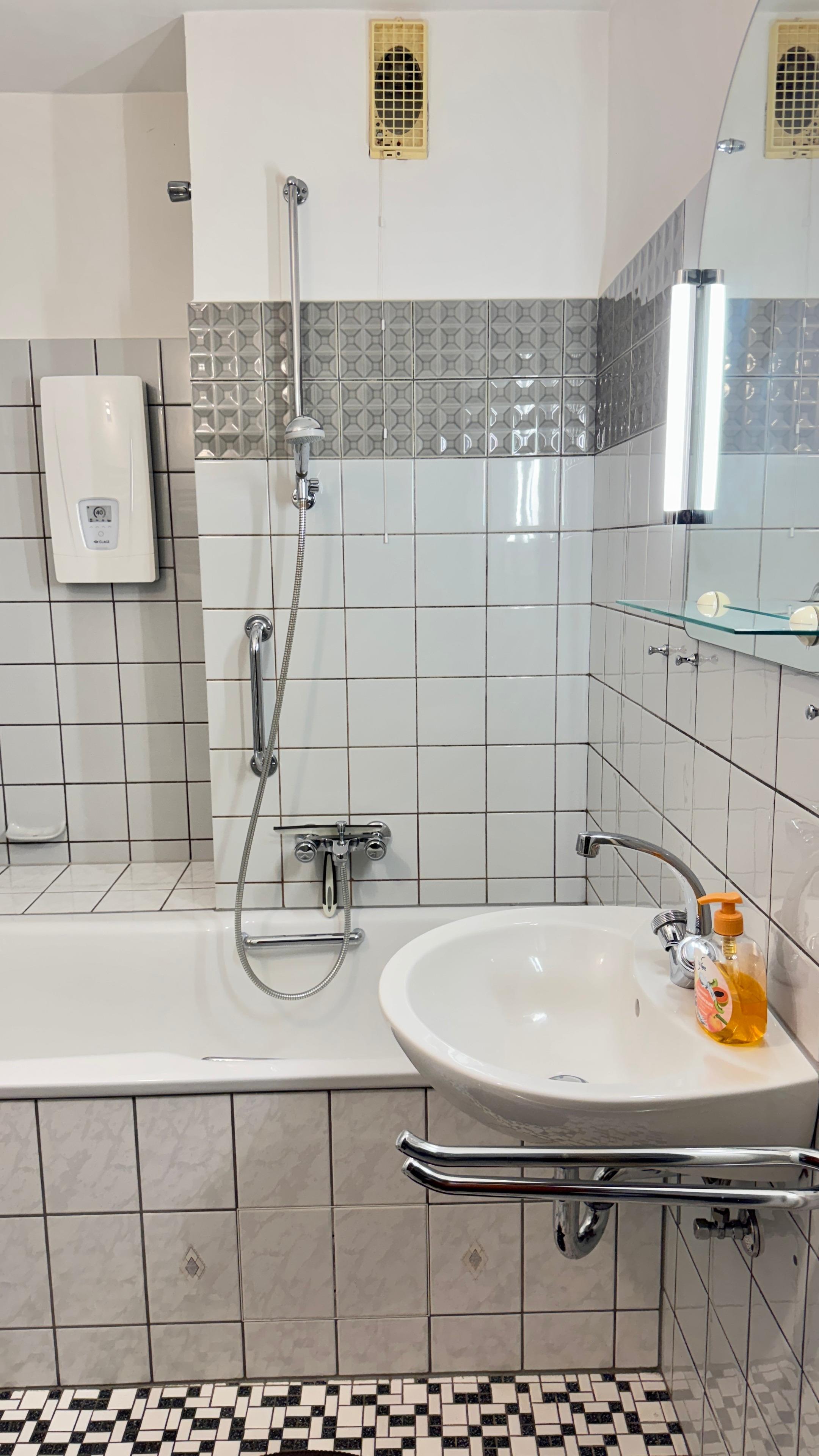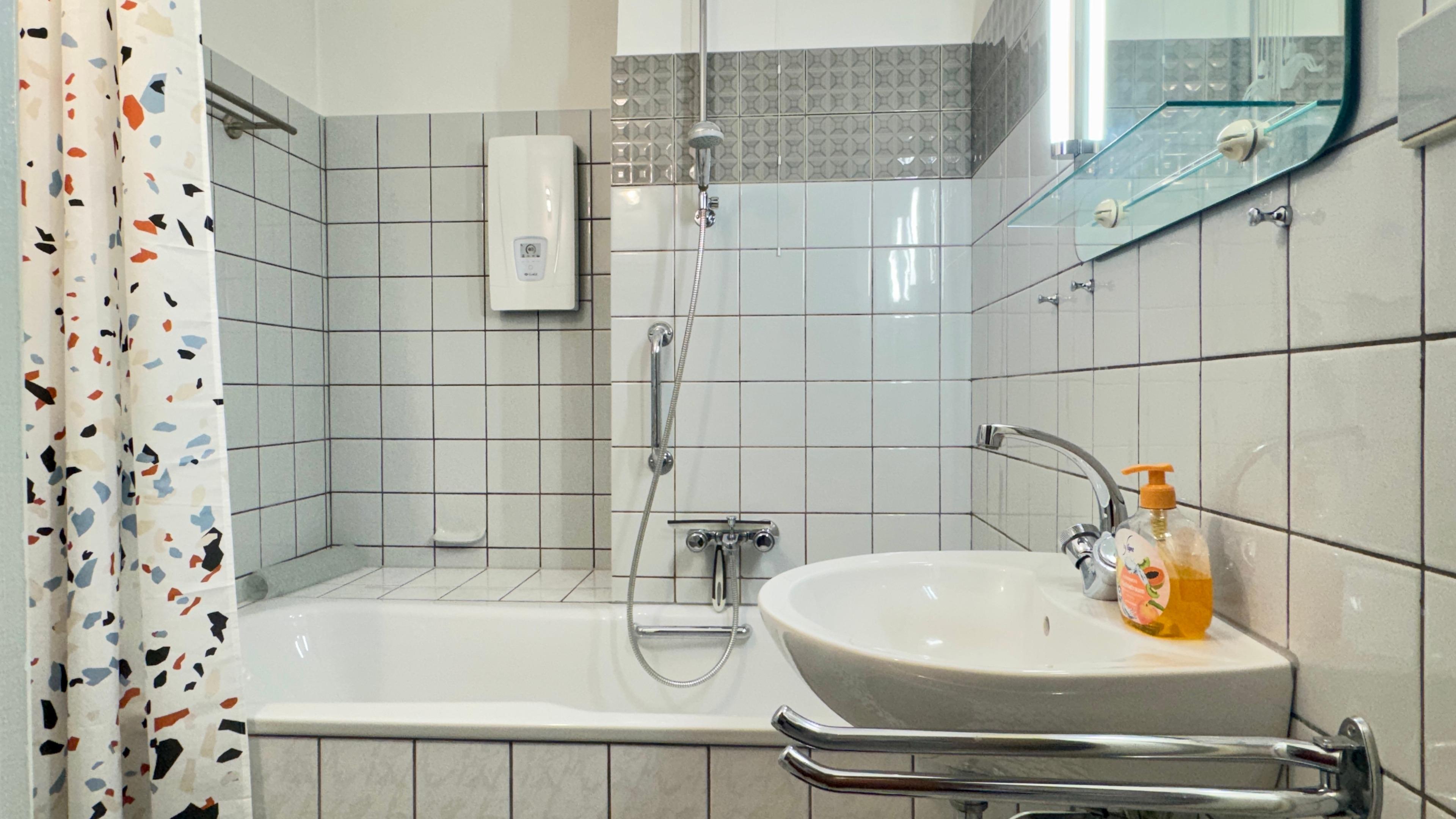 Das Badezimmer ist hell gefliest und bietet eine Badewanne, die sowohl zum Baden als auch zum Duschen geeignet ist – ganz nach Ihrem Geschmack.
