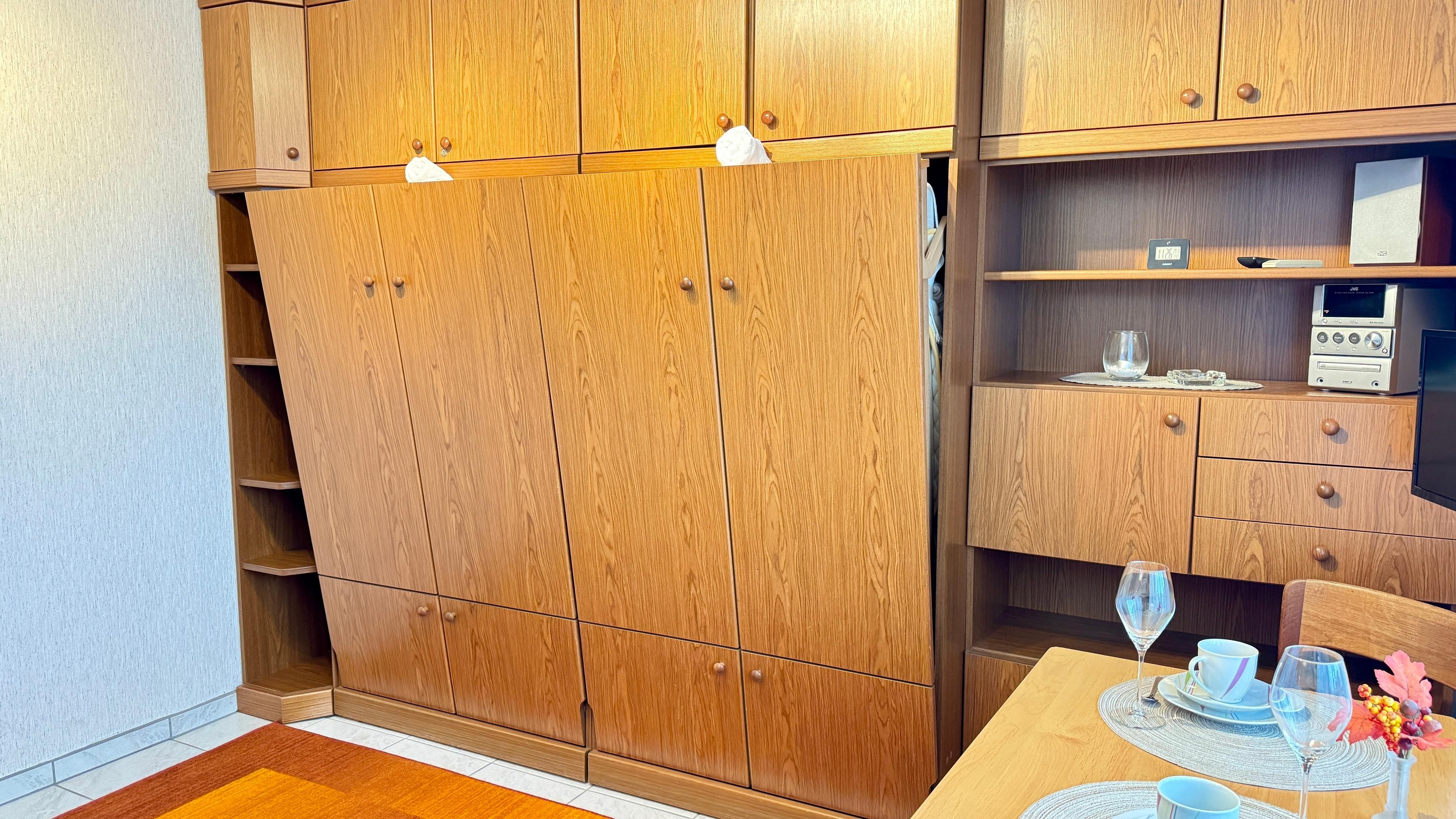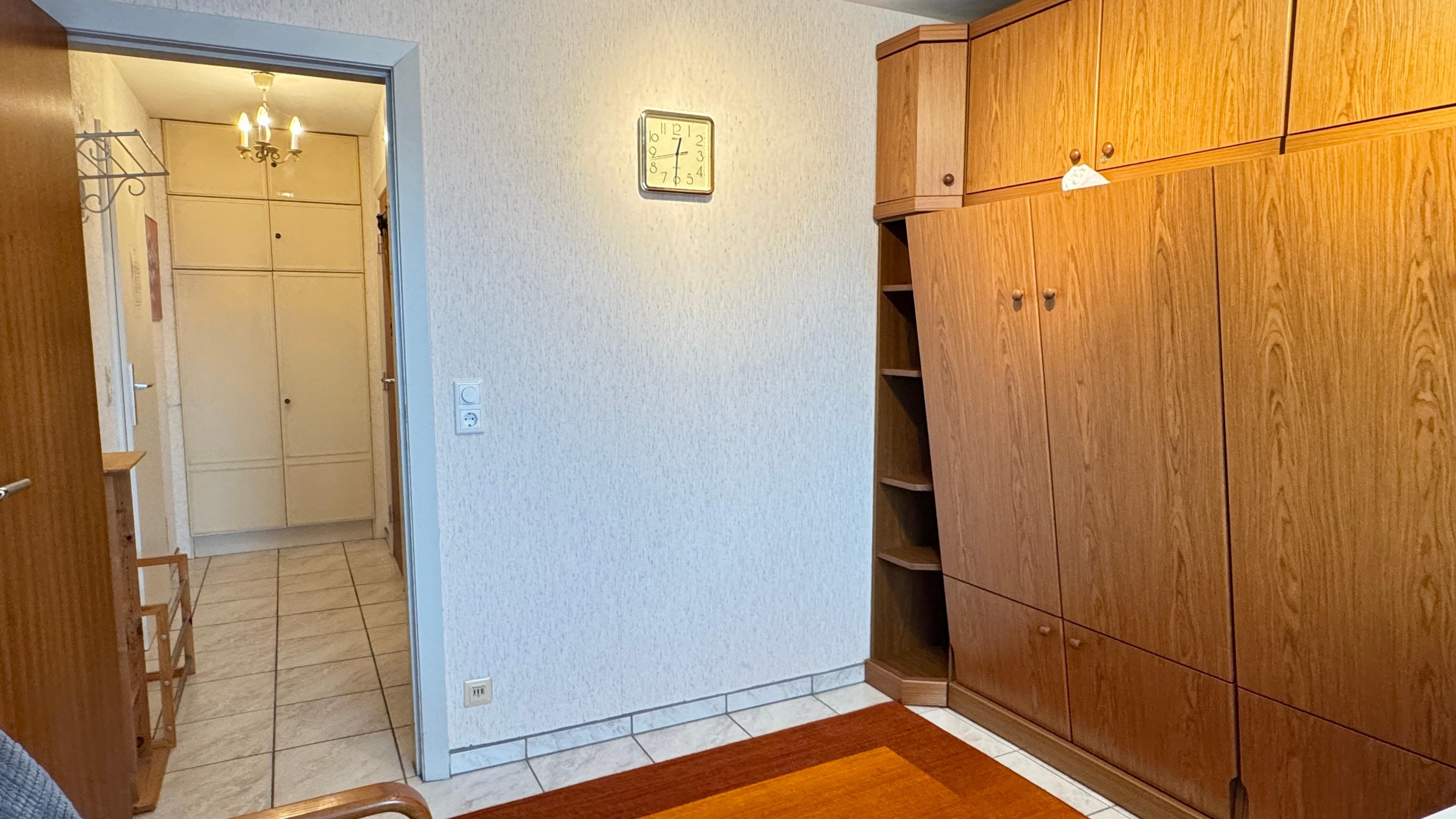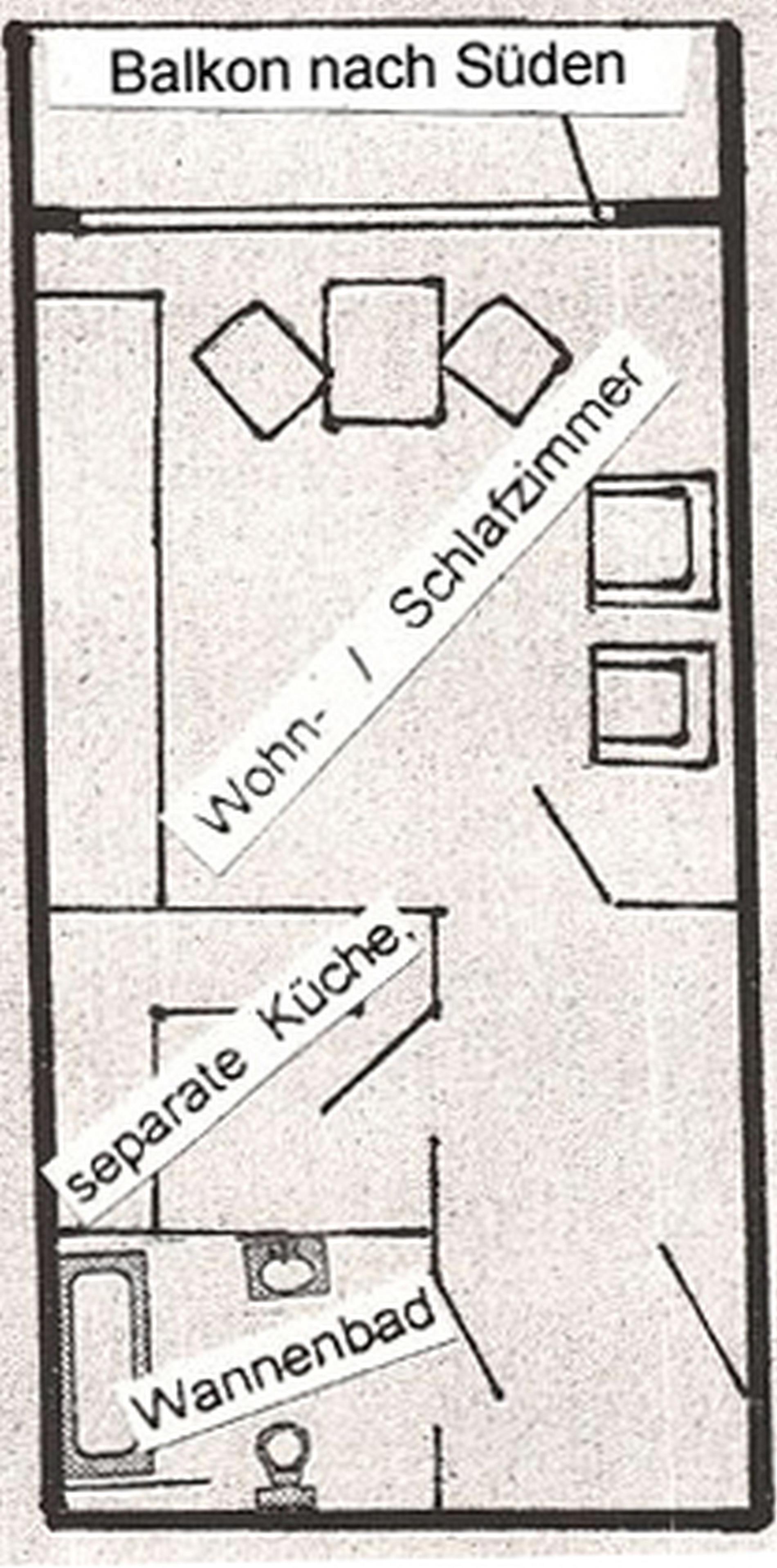 Der Wohn-Schlafraum ist mit einer funktionalen Appartementwand samt zwei einzeln ausklappbaren Schrankbetten ausgestattet. Zwei bequeme Sessel laden zum Entspannen und Fernsehen am Flachbild-TV ein. WLAN steht zur Verfügung (ohne Gewähr), und ein Essbereich am Südfenster sorgt für eine angenehme Atmosphäre. Helle Bodenfliesen unterstreichen das freundliche Ambiente.