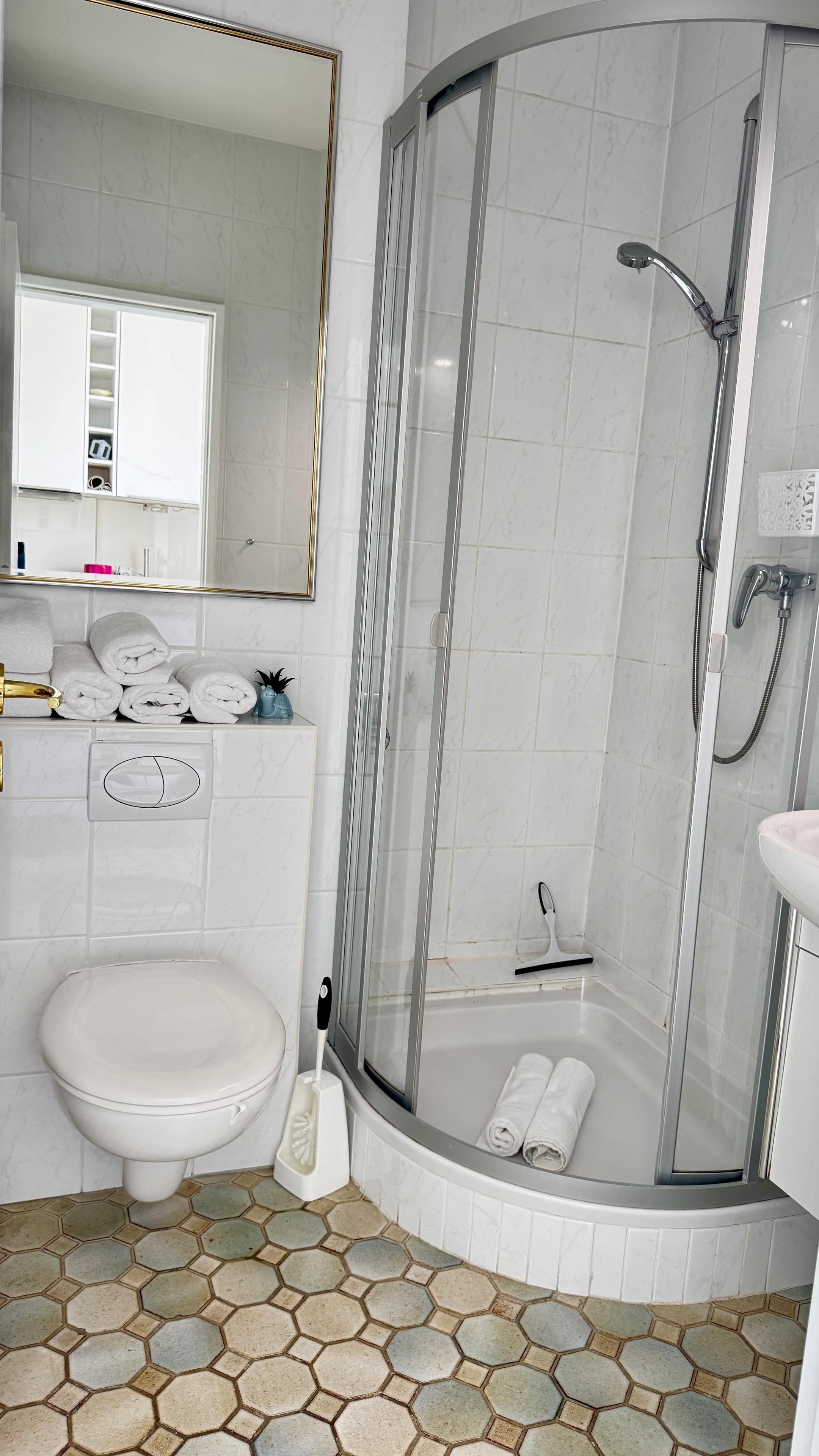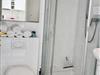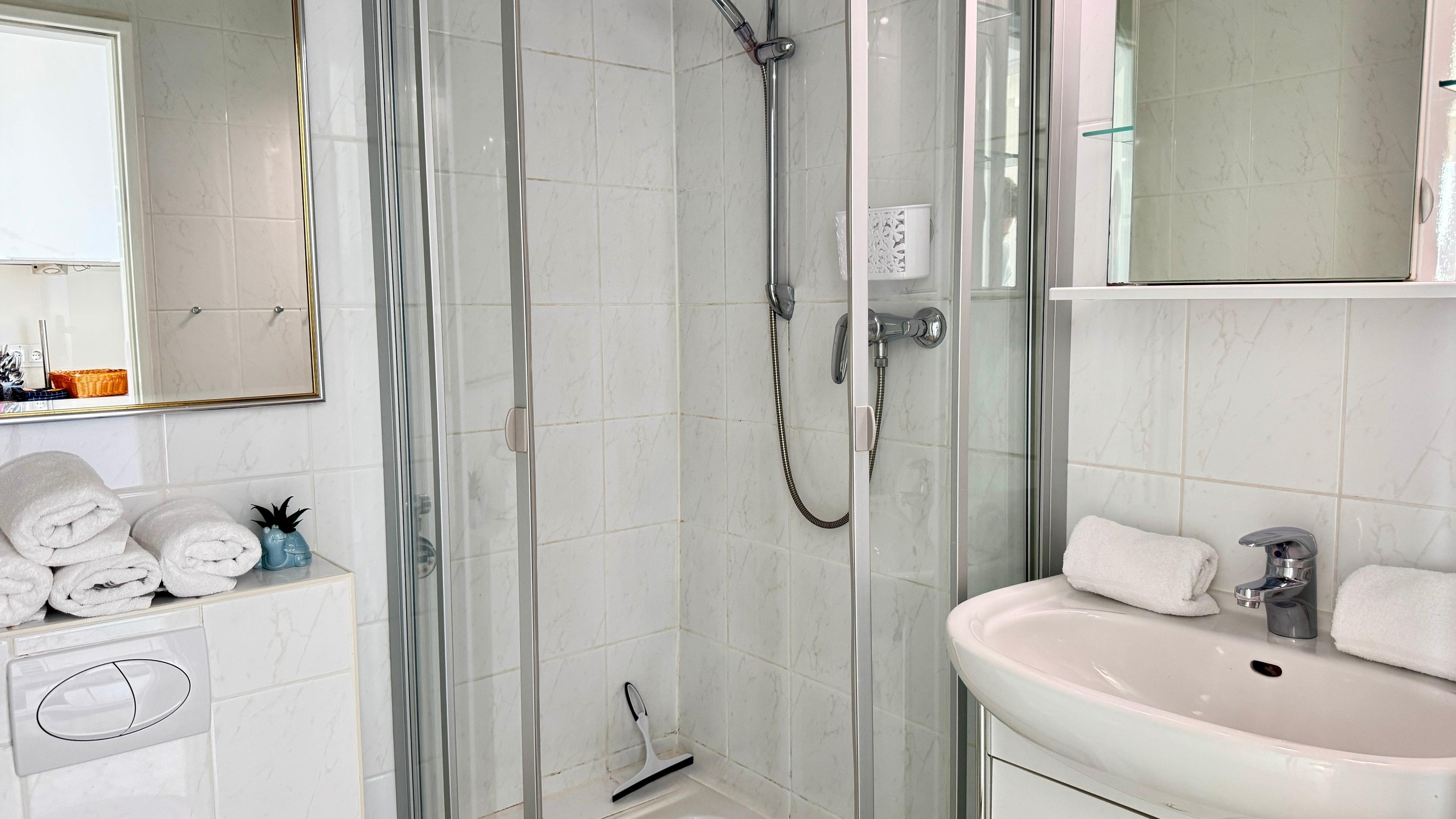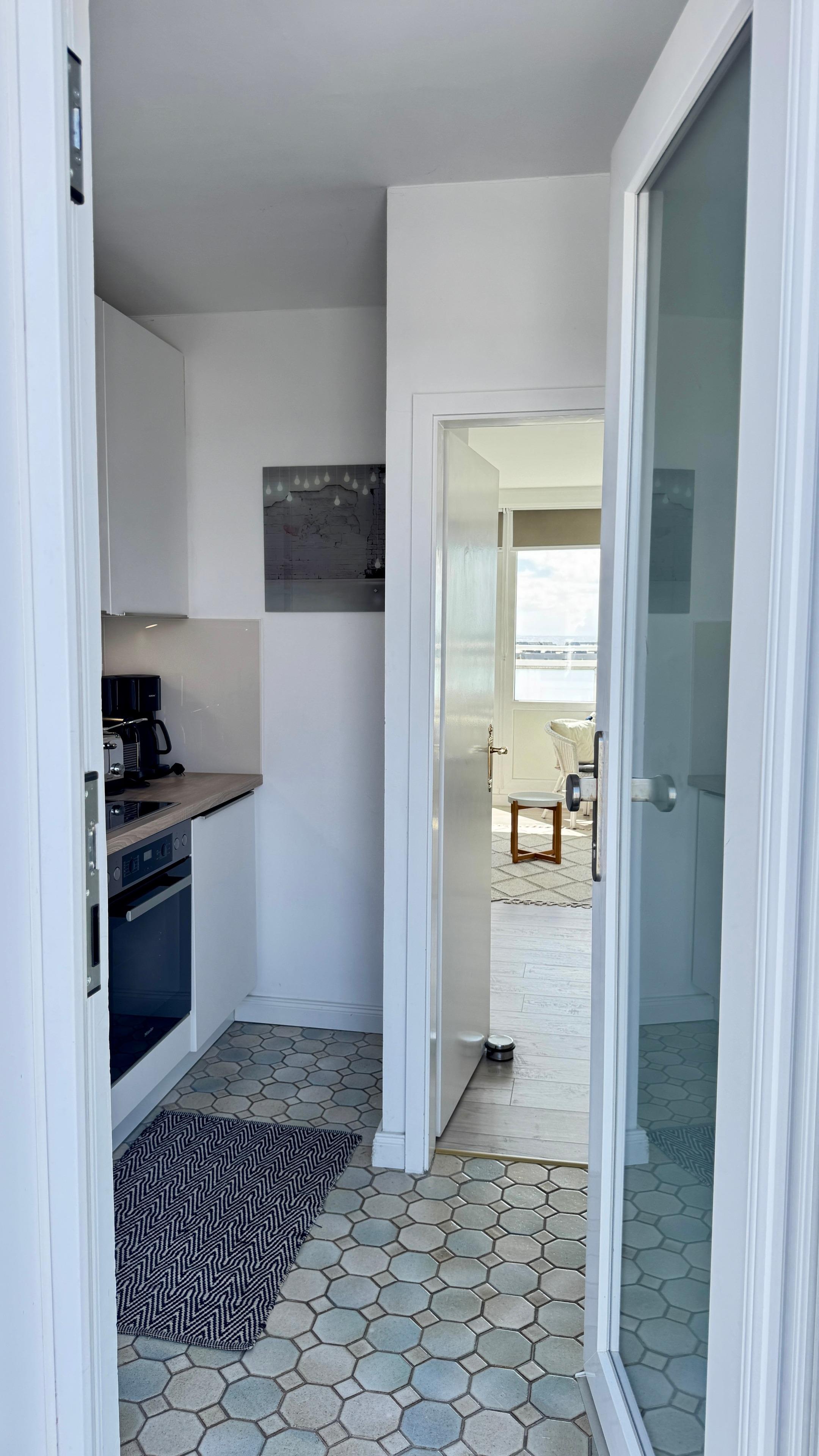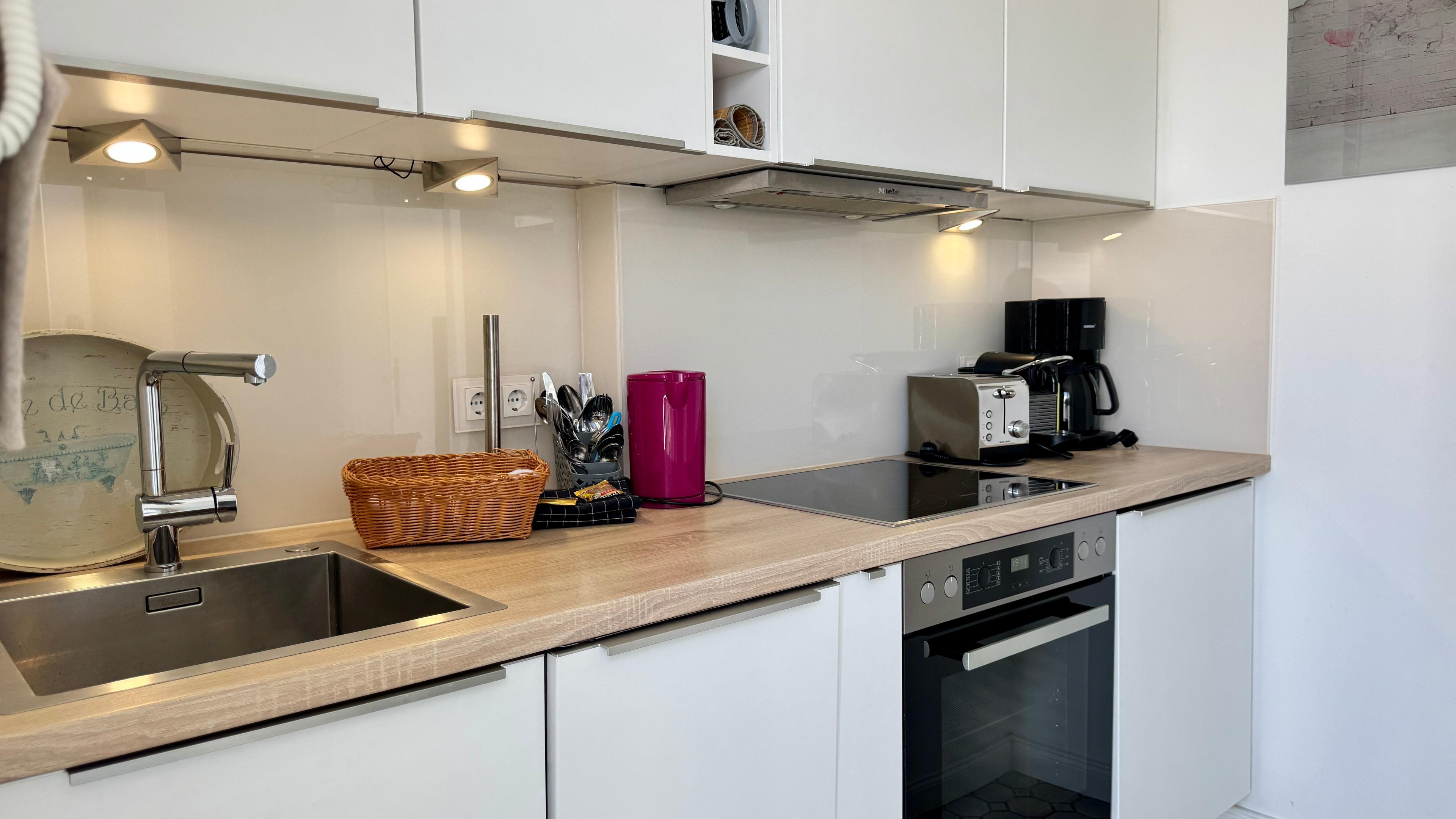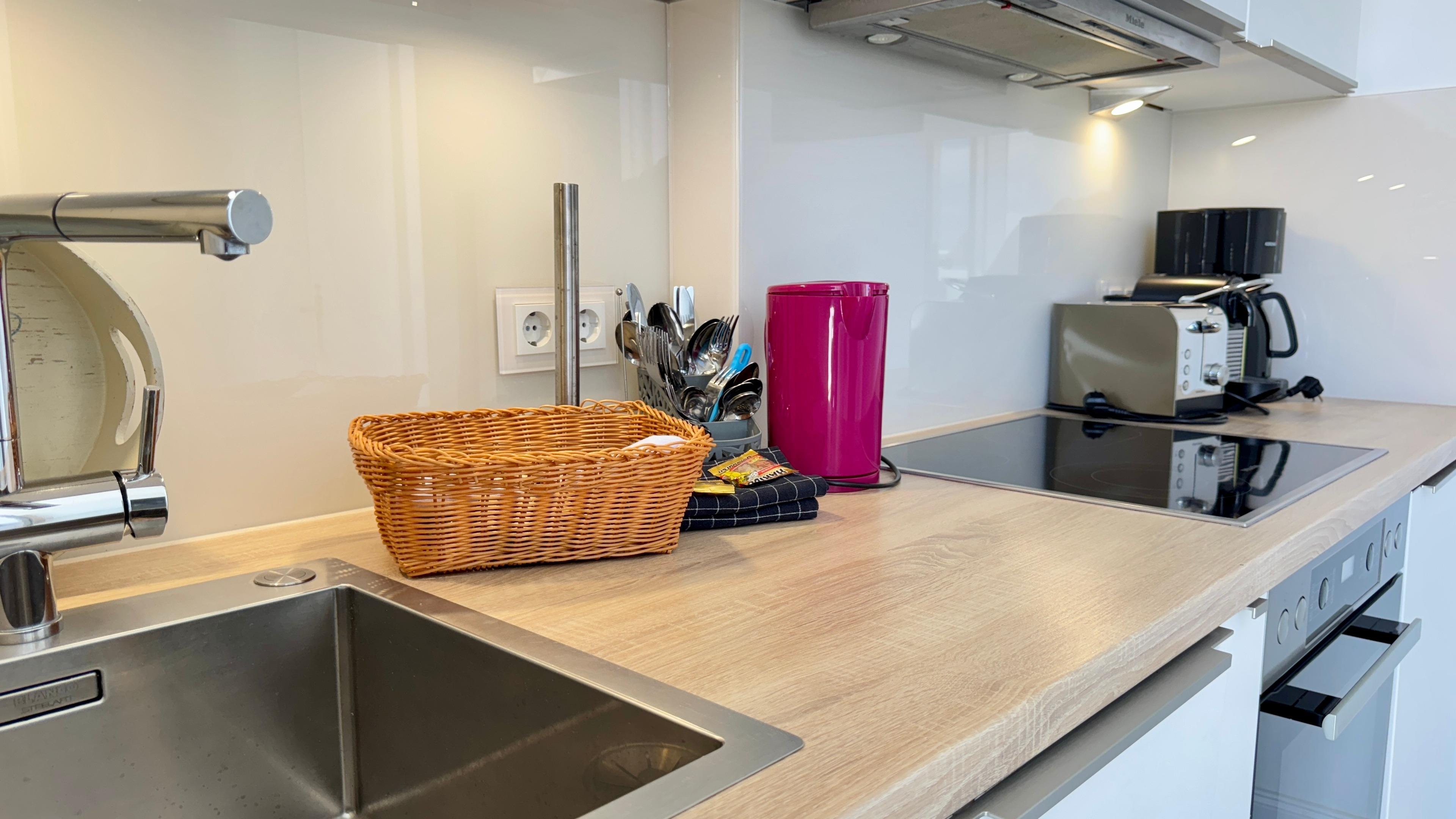 Im Eingangsbereich befindet sich die Küche und der Zugang zum Duschbad mit Runddusche. Die Küche ist unter anderem ausgestattet mit: einem Herd mit 4 Ceranfeldern und Backofen, Geschirrspüler, Kühlschrank, Kaffeemaschine, Toaster und Wasserkocher.