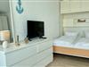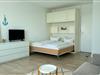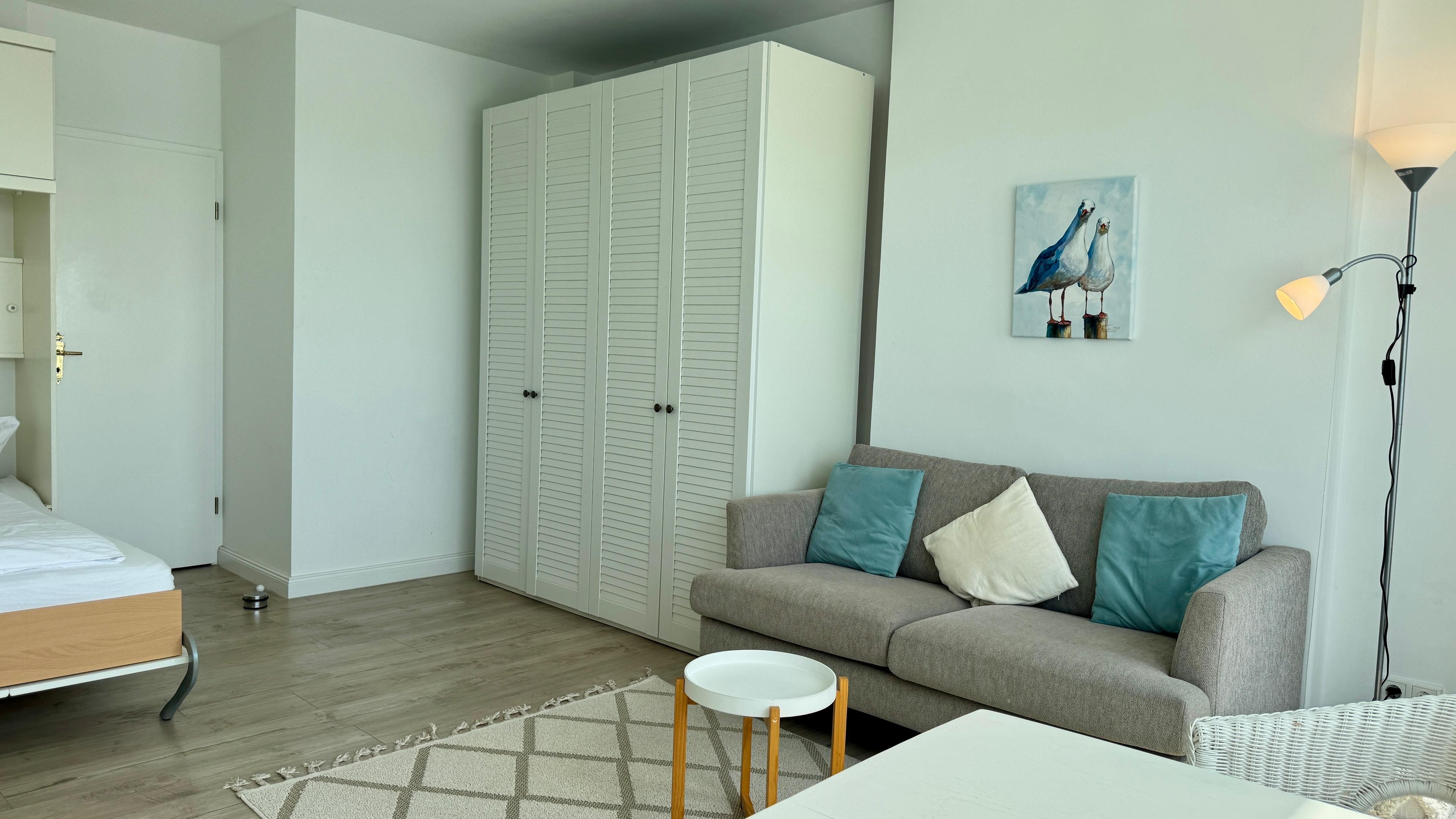Im Wohn-/Schlafraum befindet sich eine Appartementwand mit einem ausklappbaren Doppelbett, ein Kleiderschrank, ein TV und ein Sofa, sowie ein Eßtisch mit zwei gemütlichen Korbstühlen direk am Fenster mit Blick über die Stadt zur Nordsee. Ein Internetzugang via WLAN (ohne Gewähr) ist ebenso vorhanden.