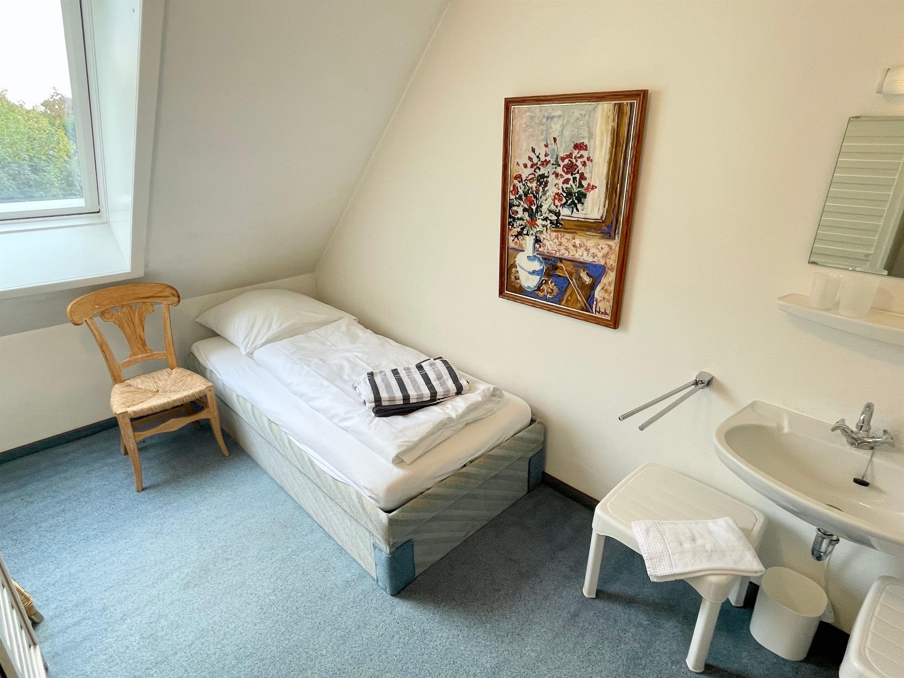 Im oberen Appartement finden Sie in der ersten Etage einen gemütlichen Wohnraum mit einem 2-er Sofa, zwei Sesseln und einem TV, ideal für entspannte Abende. Ebenfalls auf dieser Etage: eine gut ausgestattete Küche und ein Badezimmer mit Badewanne. Ein Schlafzimmer mit zwei Einzelbetten bietet eine ruhige Rückzugsoase. Im Dachgeschoss finden Sie ein weiteres Schlafzimmer mit zwei Einzelbetten – ideal für Kinder oder Freunde.