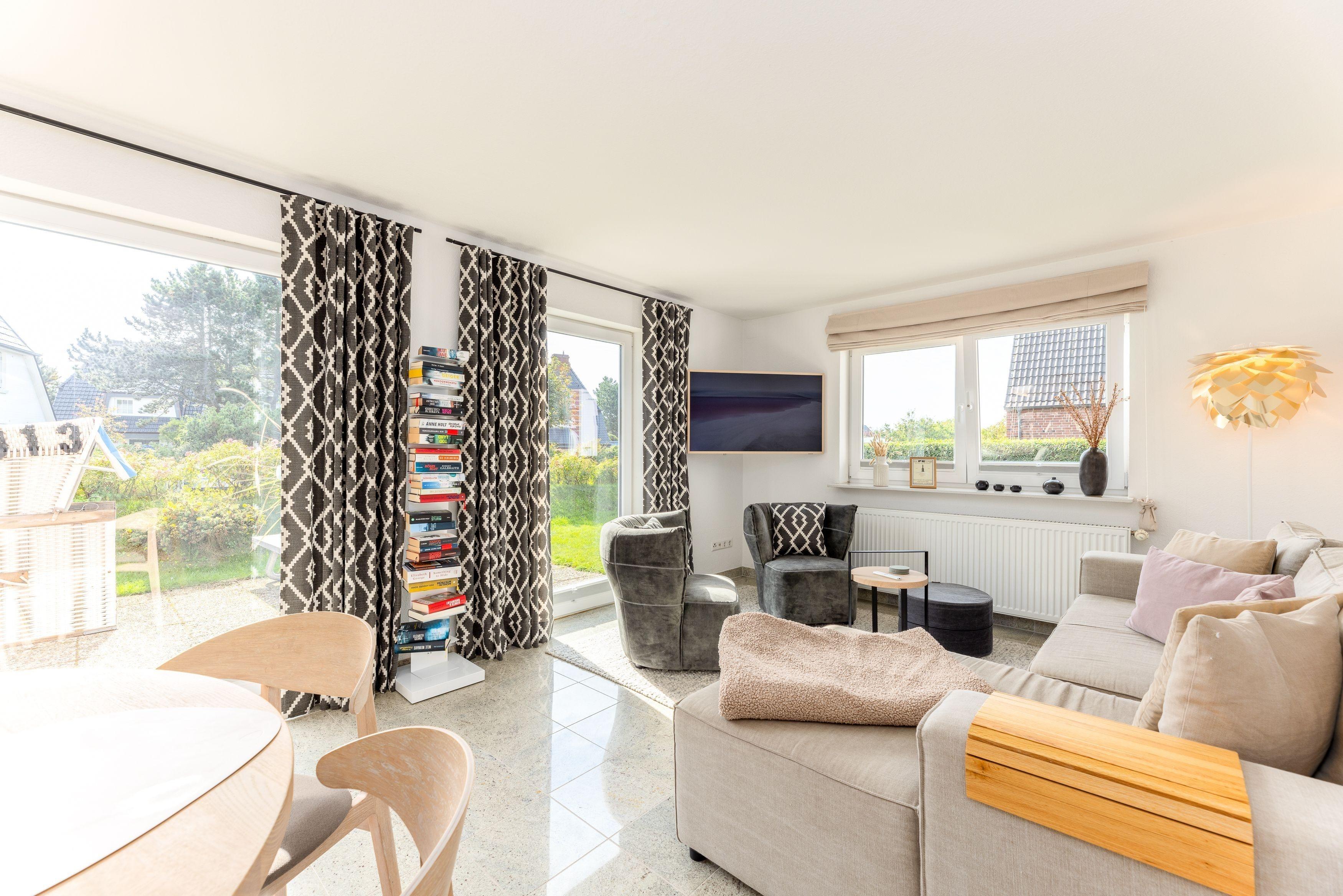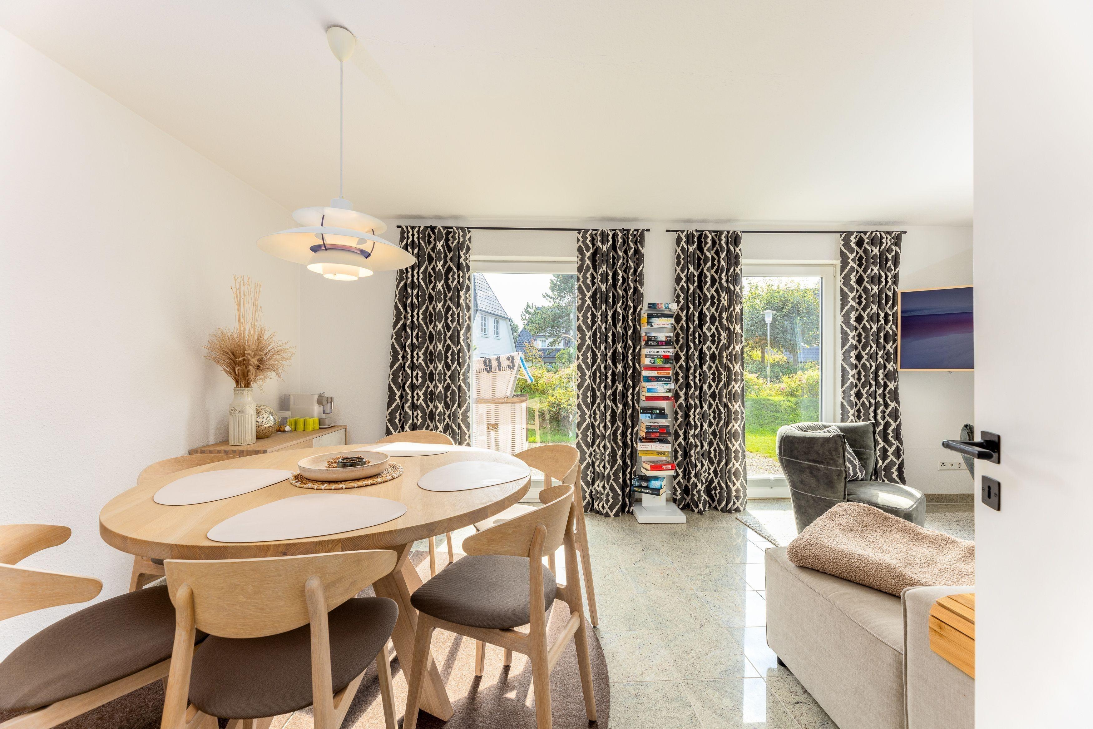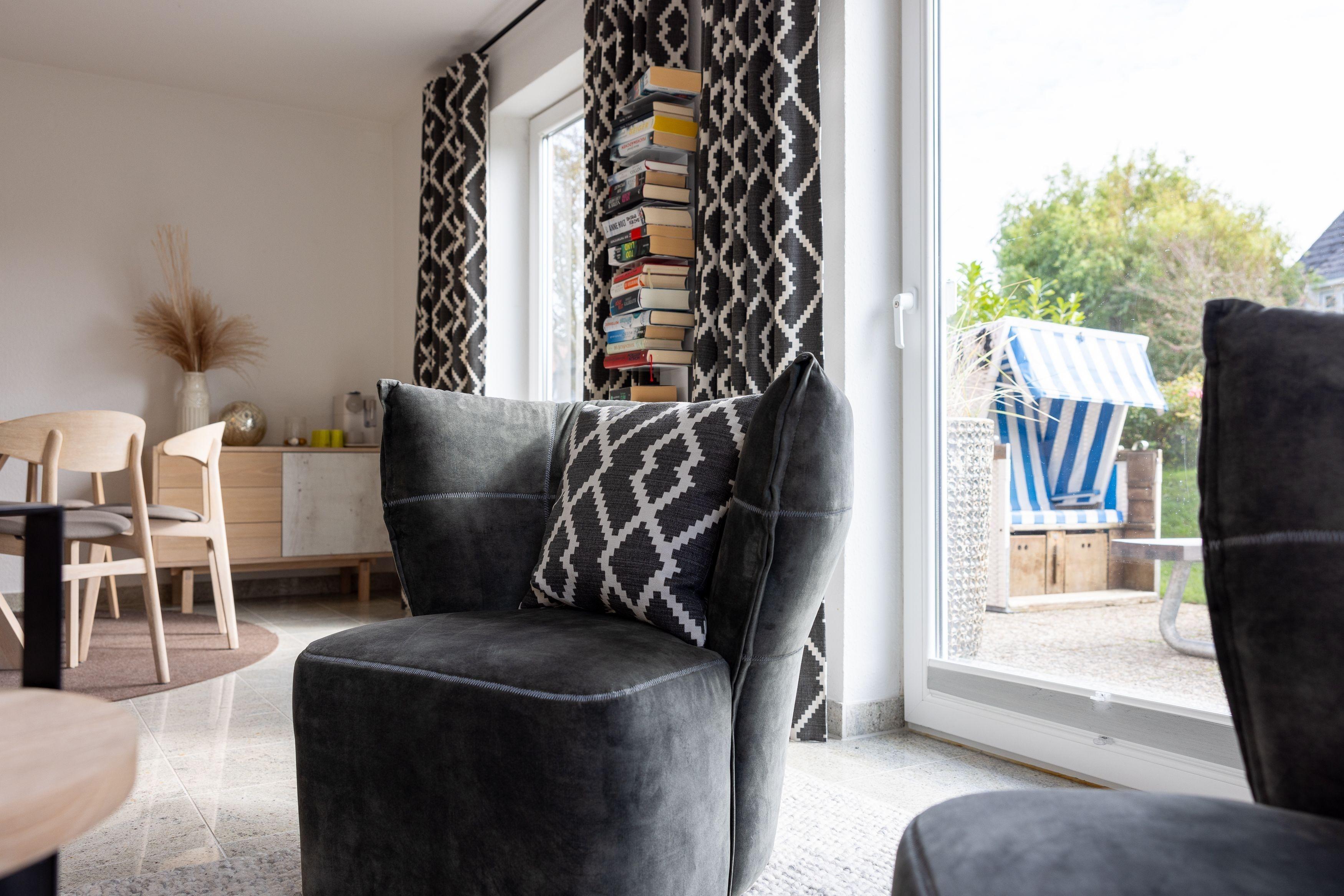 Nach der Hauseingangstür führt die Treppe nach oben zu den beiden Schlafzimmern und dem Bad mit Badewanne im Obergeschoß - weiter im Erdgeschoß folgt das Gästezimmer mit Doppelschrankbett, Küche sowie WC und Dusche separiert. Am modern eingerichteten Wohnzimmer mit Schlafsofa angeschlossen befindet sich die Süd-Terrasse mit einem Strandkorb.