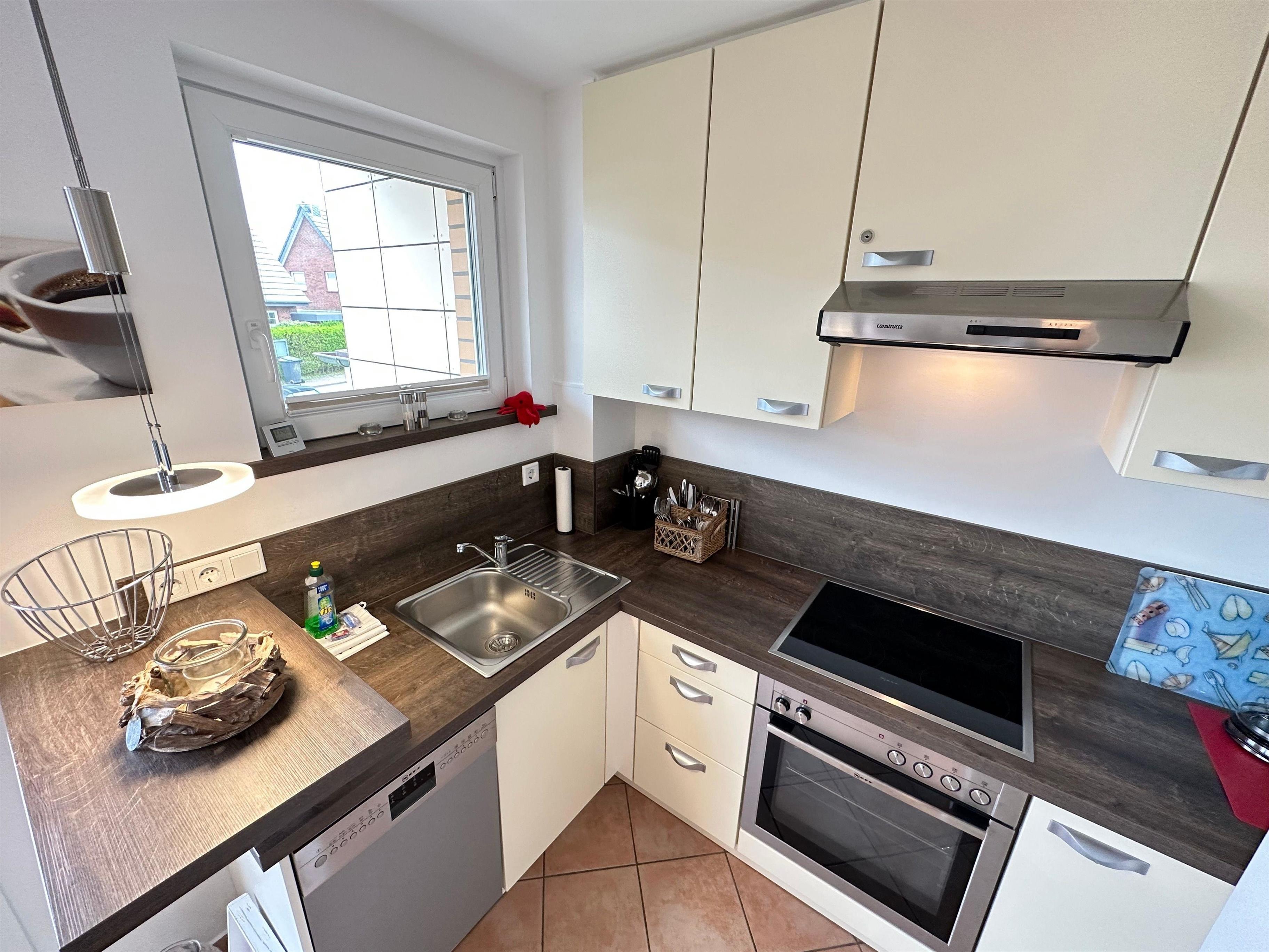 In der neuen Küche befindet sich ein E-Herd mit Cerankochfeld, Backofen, Dunstabzughaube und Geschirrspüler, eine Filterkaffeemaschine, Toaster, Wasserkocher, Mixer und Bügeleisen. Eine ausreichende Menge an Geschirr und Besteck, Töpfe und Pfannen ist vorhanden.