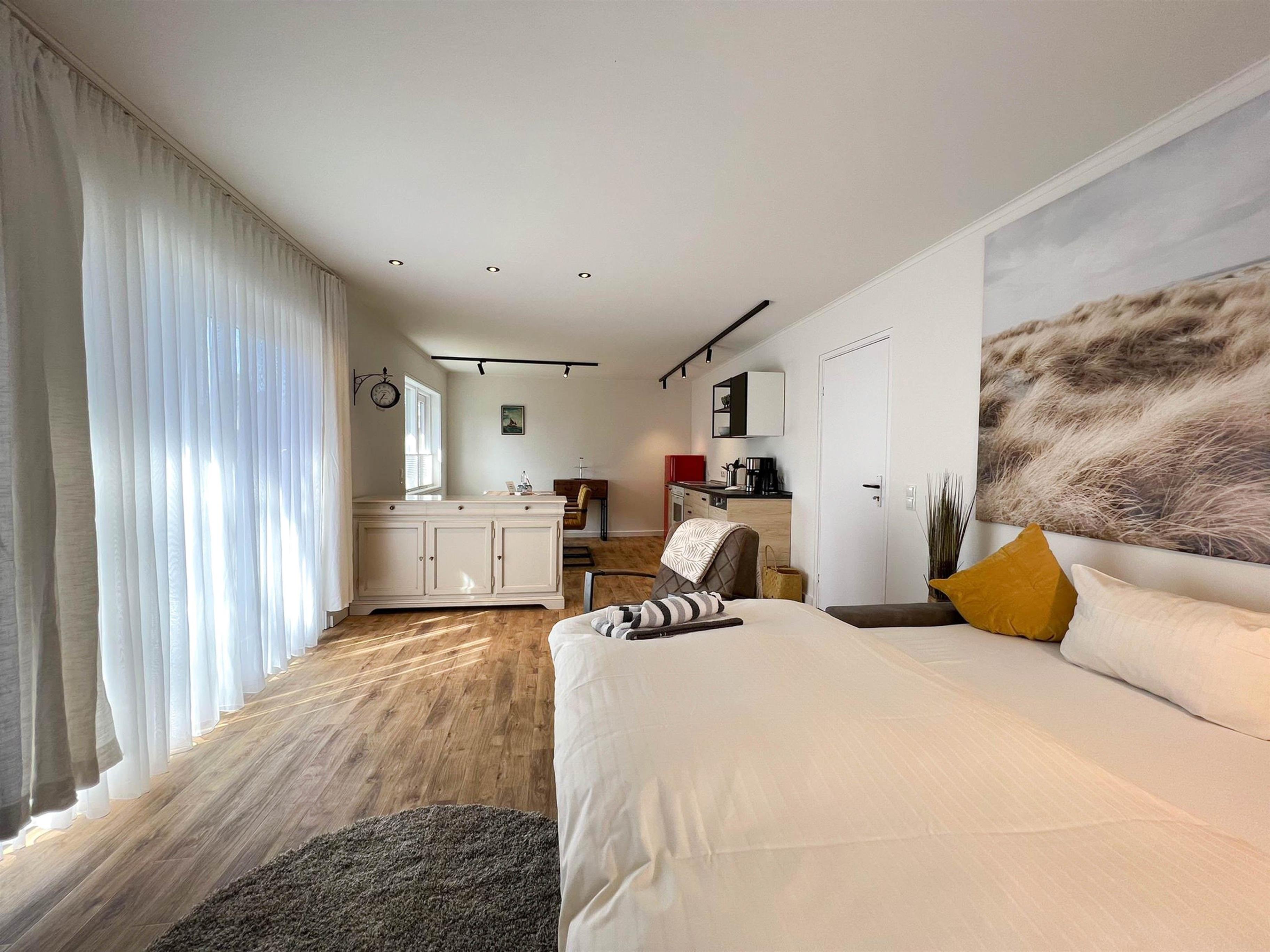 Das große helle Wohnzimmer, besitzt eine Schlafcouch für weitere Personen. Sowie Kabel-TV, Radio.