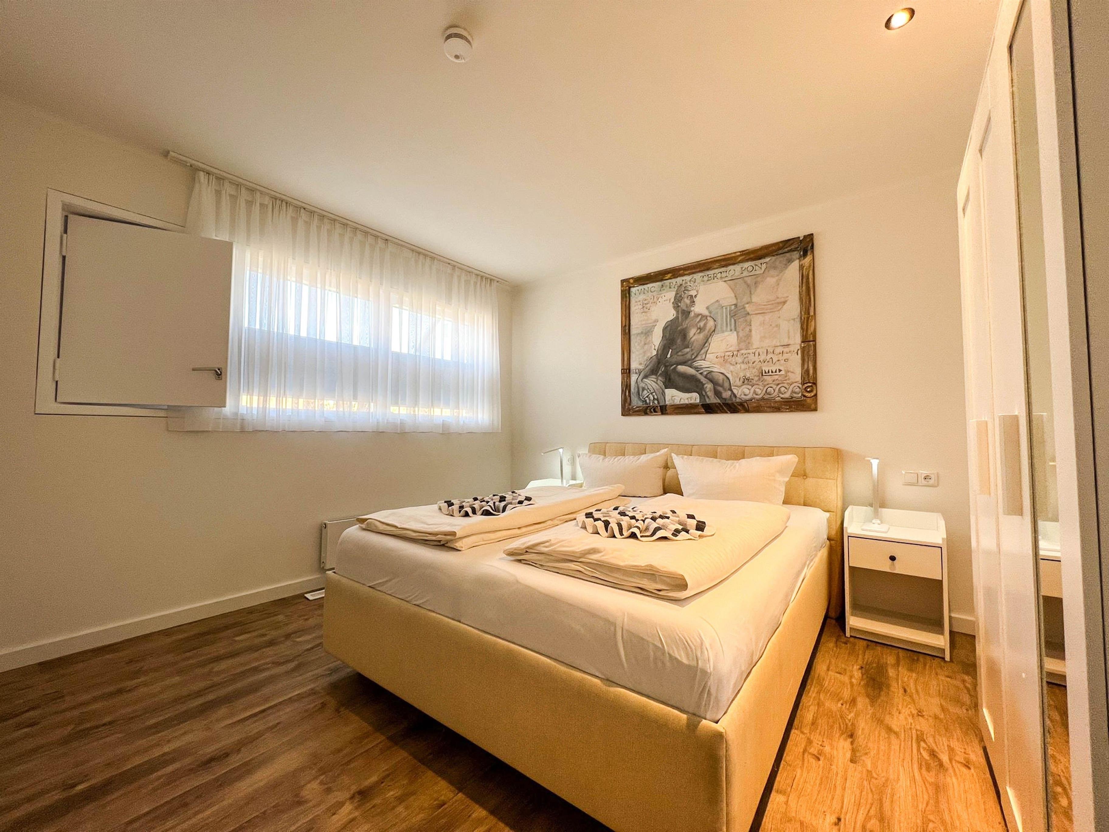 Im Schlafzimmer befindet sich ein 2 x 2 Meter Bett sowie ein Kleiderschrank.