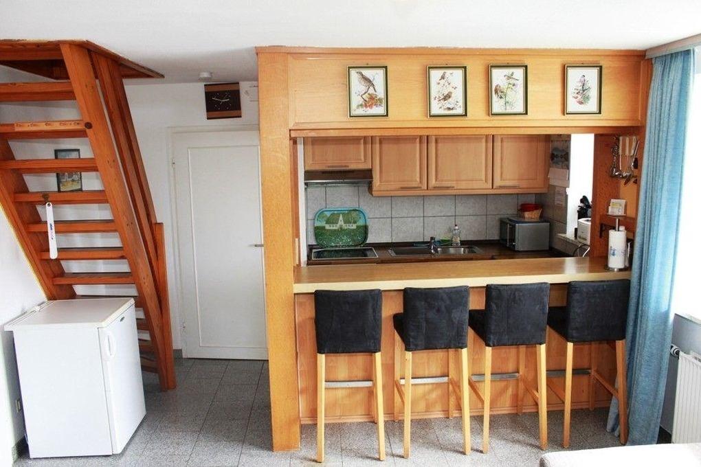 Im Wohnraum ist eine Küchenbar eingebaut.