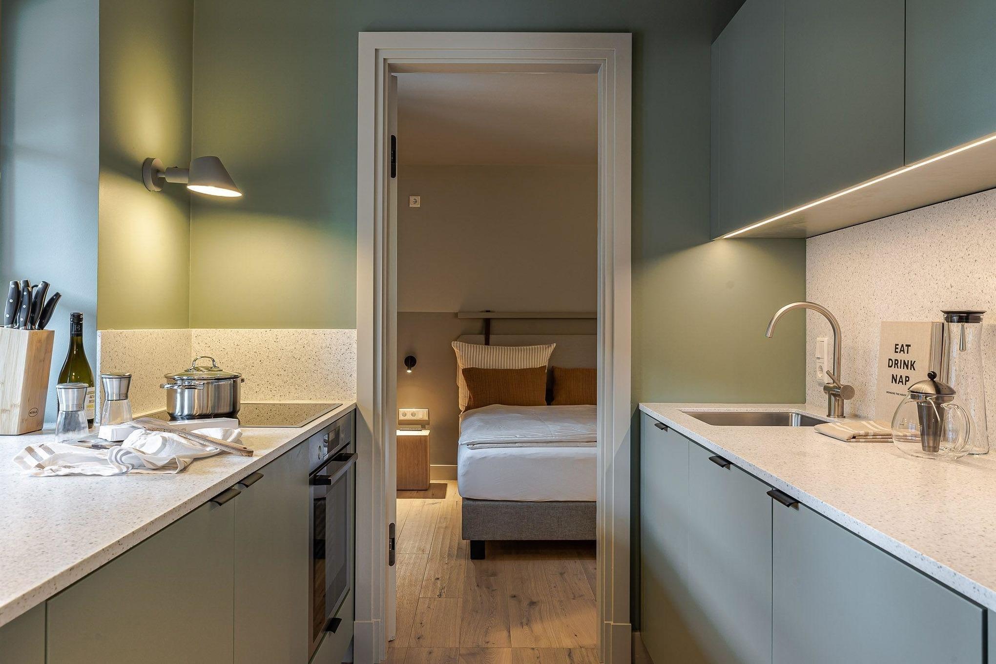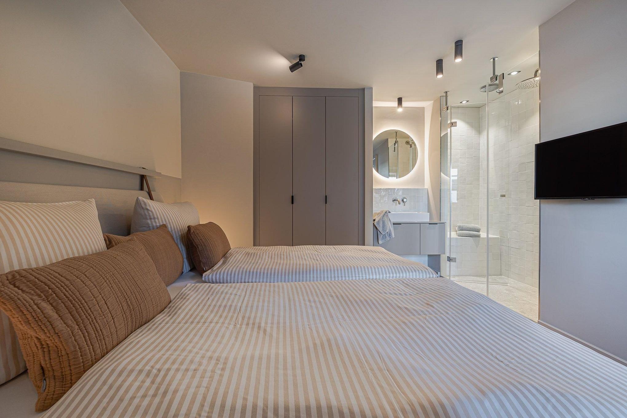 MEDIUM Die Ideale Wohneinheit für das Reisen zu Zweit. Schlafzimmer mit Dusche en Suite. Wohnzimmer mit offener, voll ausgestatteter Küchenzeile und einem Südbalkon.