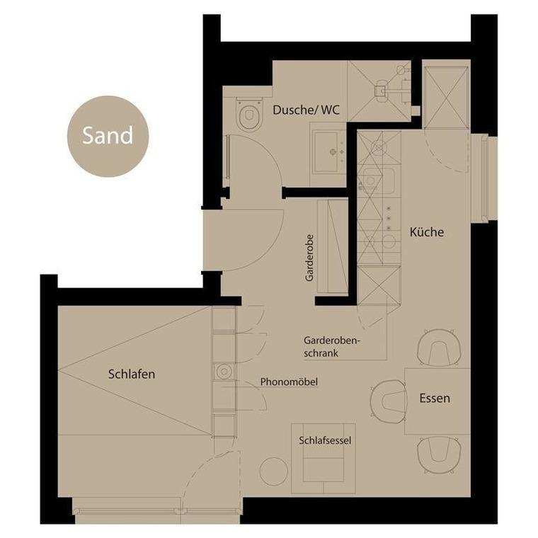 Das Appartement Sand verfügt über einen individuell gestalteten Wohn-, Schlaf- und Essbereich mit offener Küchenzeile.