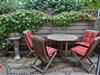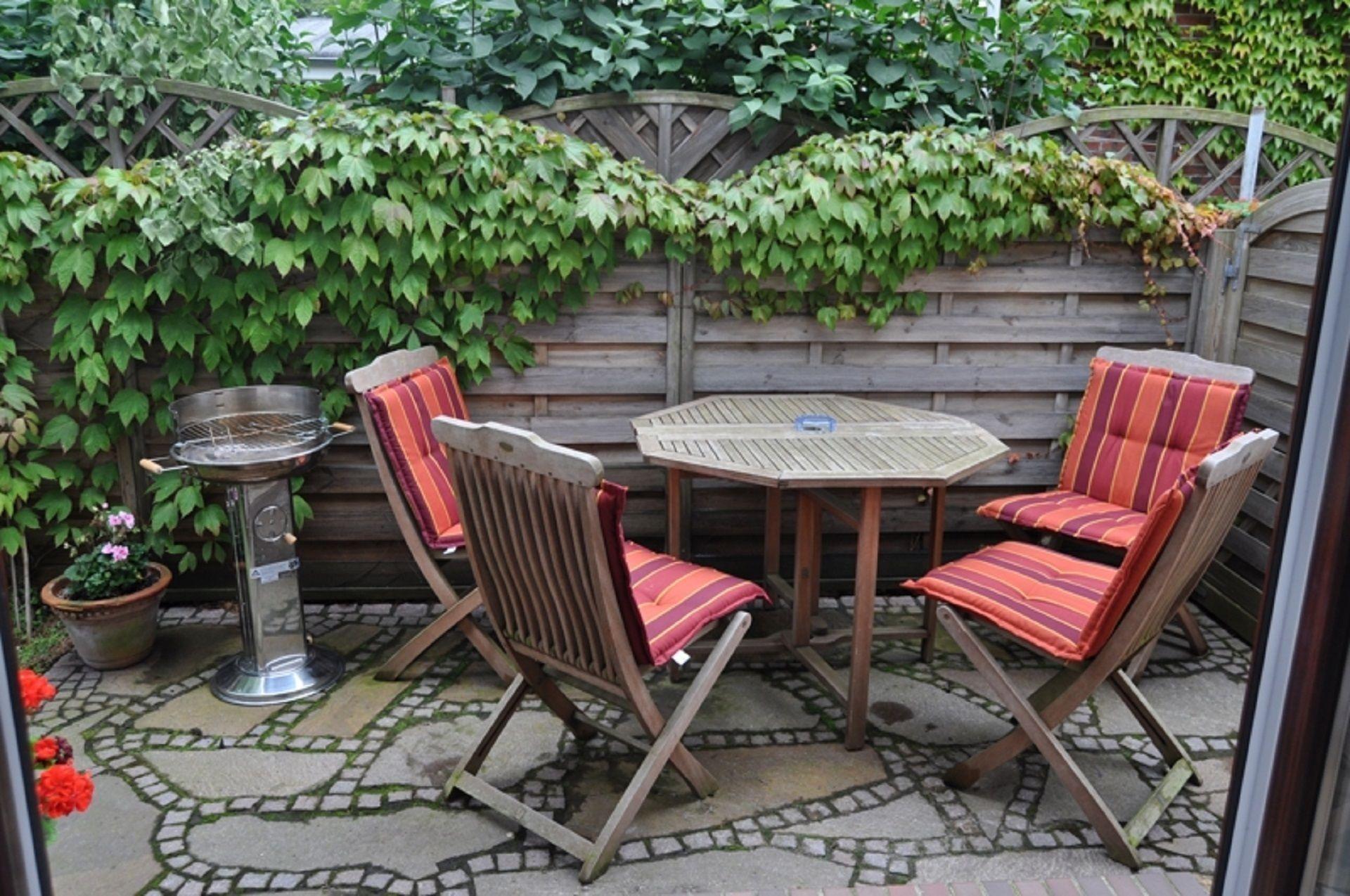 Die Terrasse ist mit Holzmöbeln und Grill bestückt.