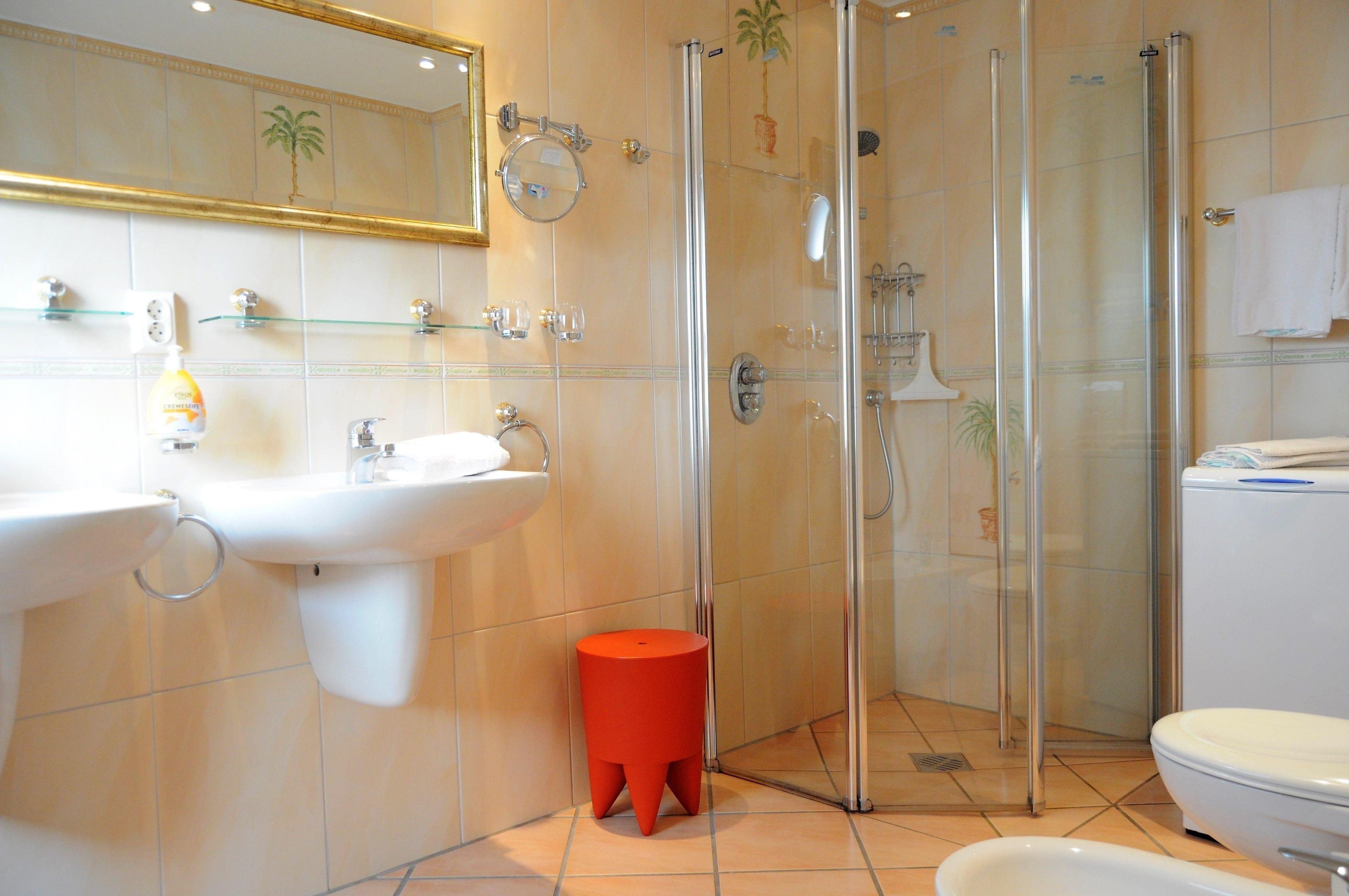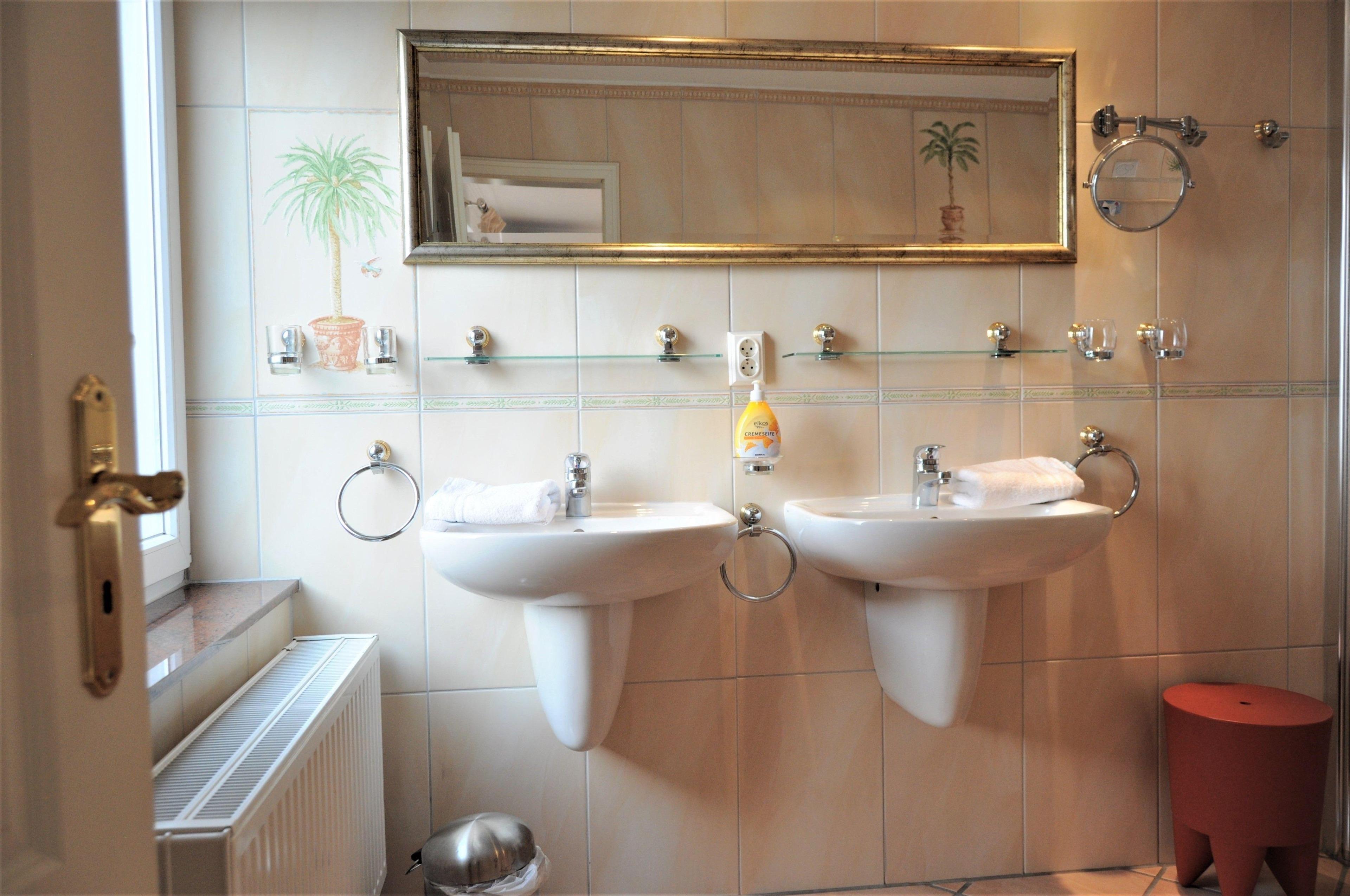 Im Duschbad gibt es 2 Waschtische, Bidet, WC, Kosmetikspiegel, Fön und Waschmaschine.