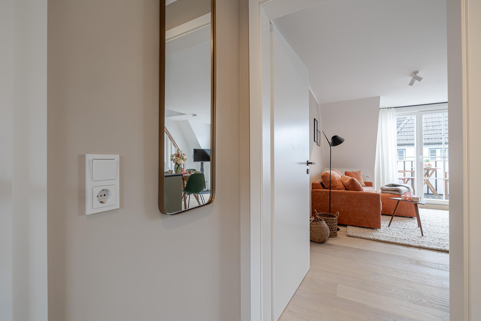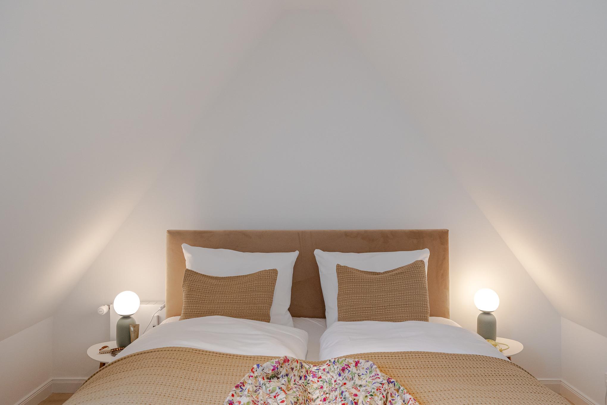 Über eine Treppe erreichen Sie das gemütliche Schlafzimmer. Dort erwartet Sie ein hochwertiges Boxspringbett der Marke Schramm, das erholsame Nächte und süße Träume verspricht.