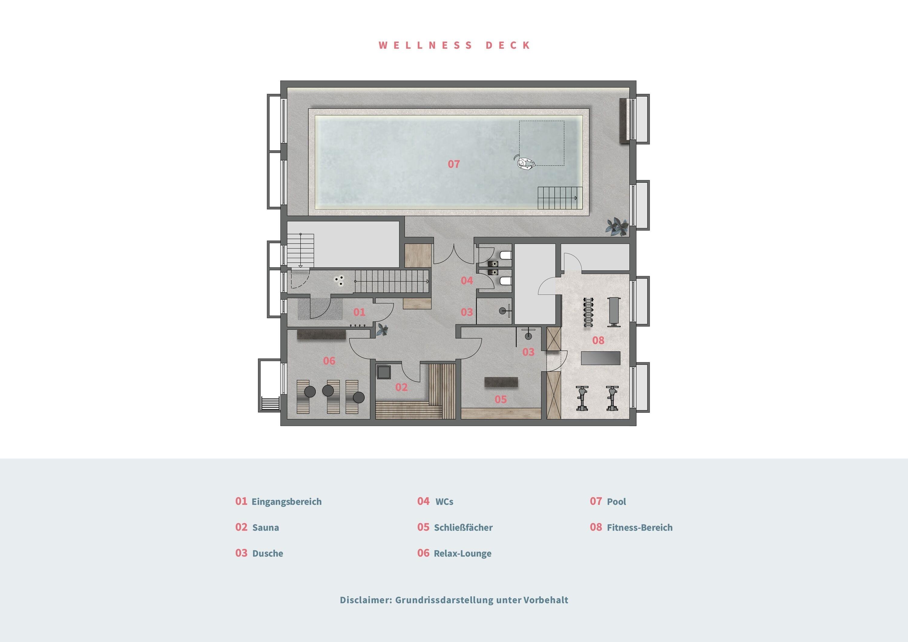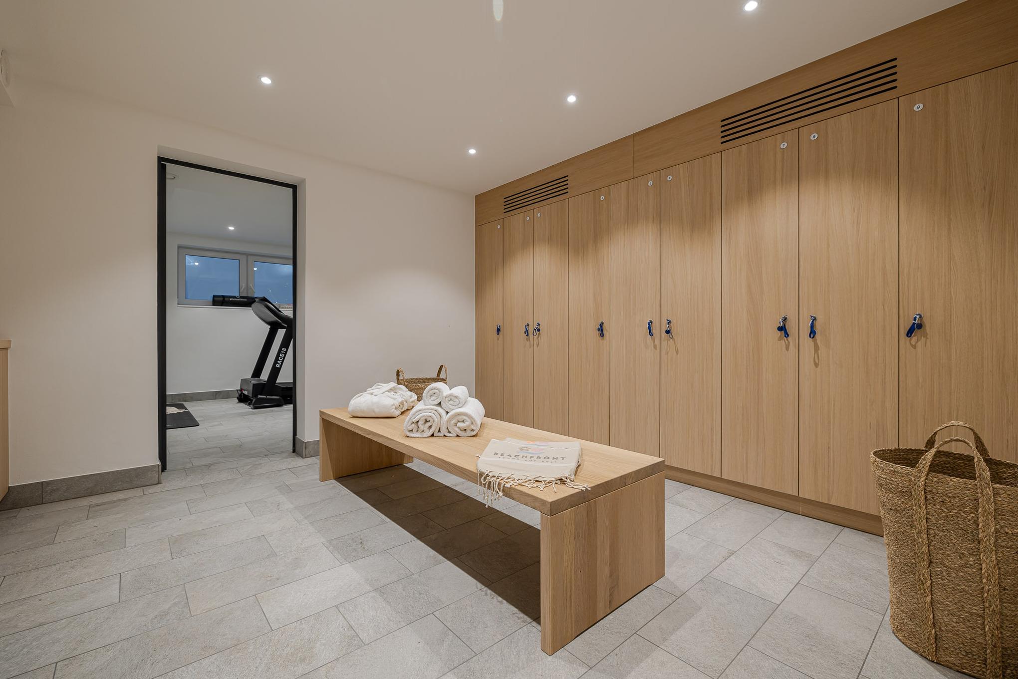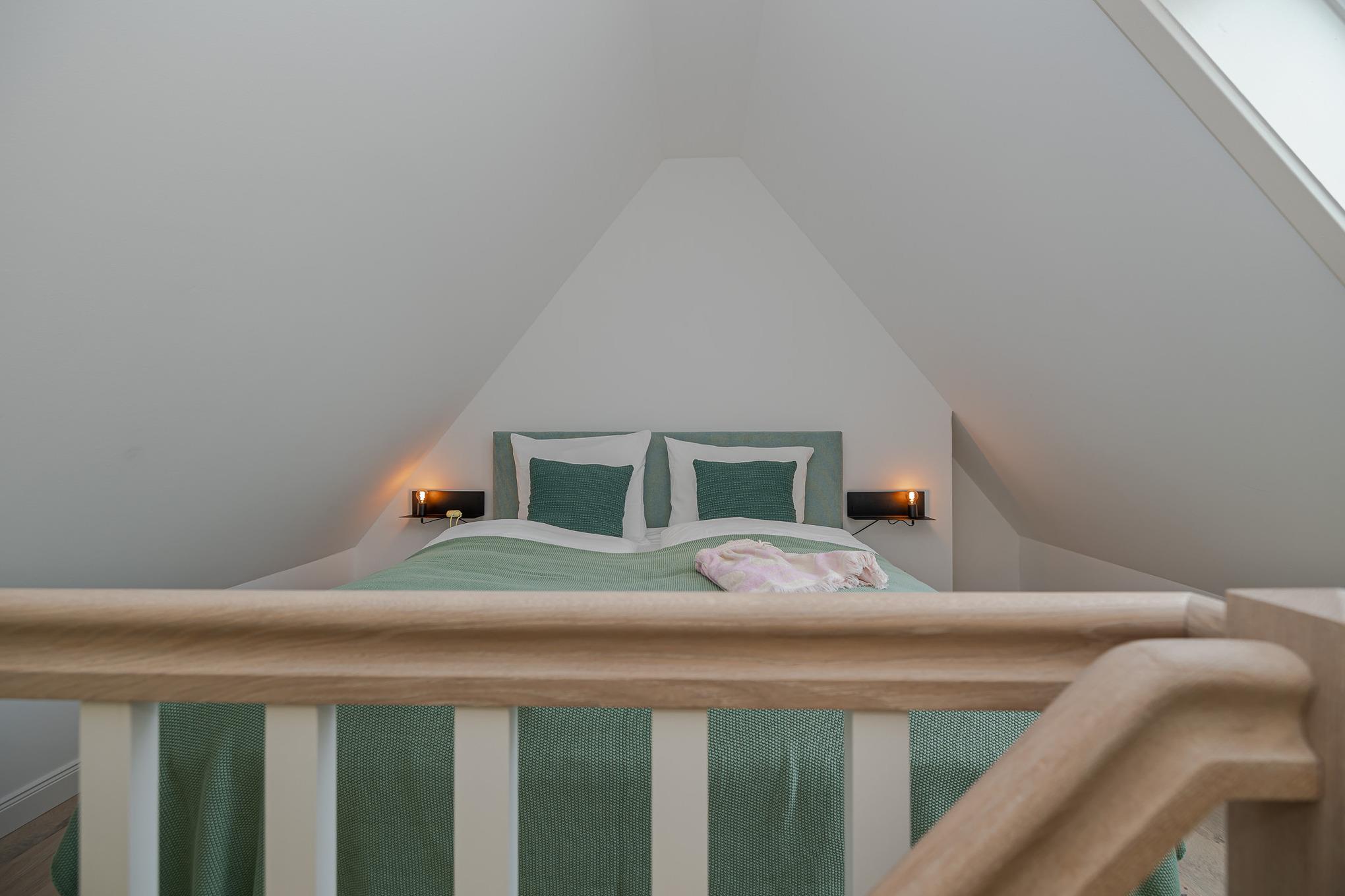 Über eine Treppe gelangen Sie in den Schlafbereich auf dem Oberdeck. Ein komfortables Schramm-Boxspringbett und maßgefertigte Einbauschränke sorgen hier für ruhige Nächte und viel Stauraum. Ein echtes Highlight ist der Balkon, auf dem von Mai bis Oktober bequeme Möbel bereitstehen – perfekt, um die frische Nordseeluft zu genießen oder den Tag bei einem Glas Wein ausklingen zu lassen. Als Gast nutzen Sie kostenfrei den 200 m² großen Pool- und Saunabereich im Dock 6d mit 12 × 4 m Pool, moderner Sauna und Fitnessbereich (Laufband, Bike, Rudergerät, Gewichte).