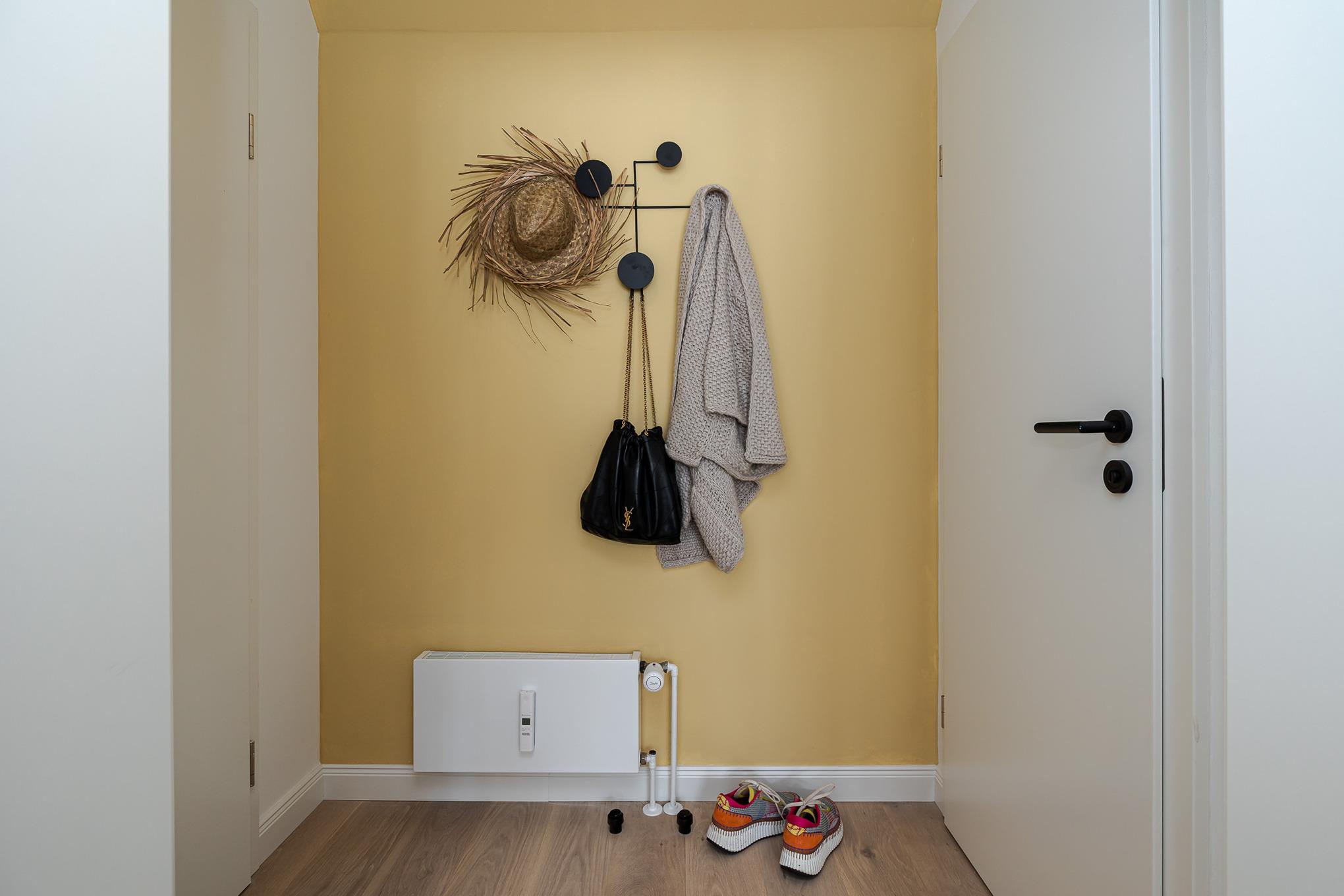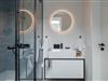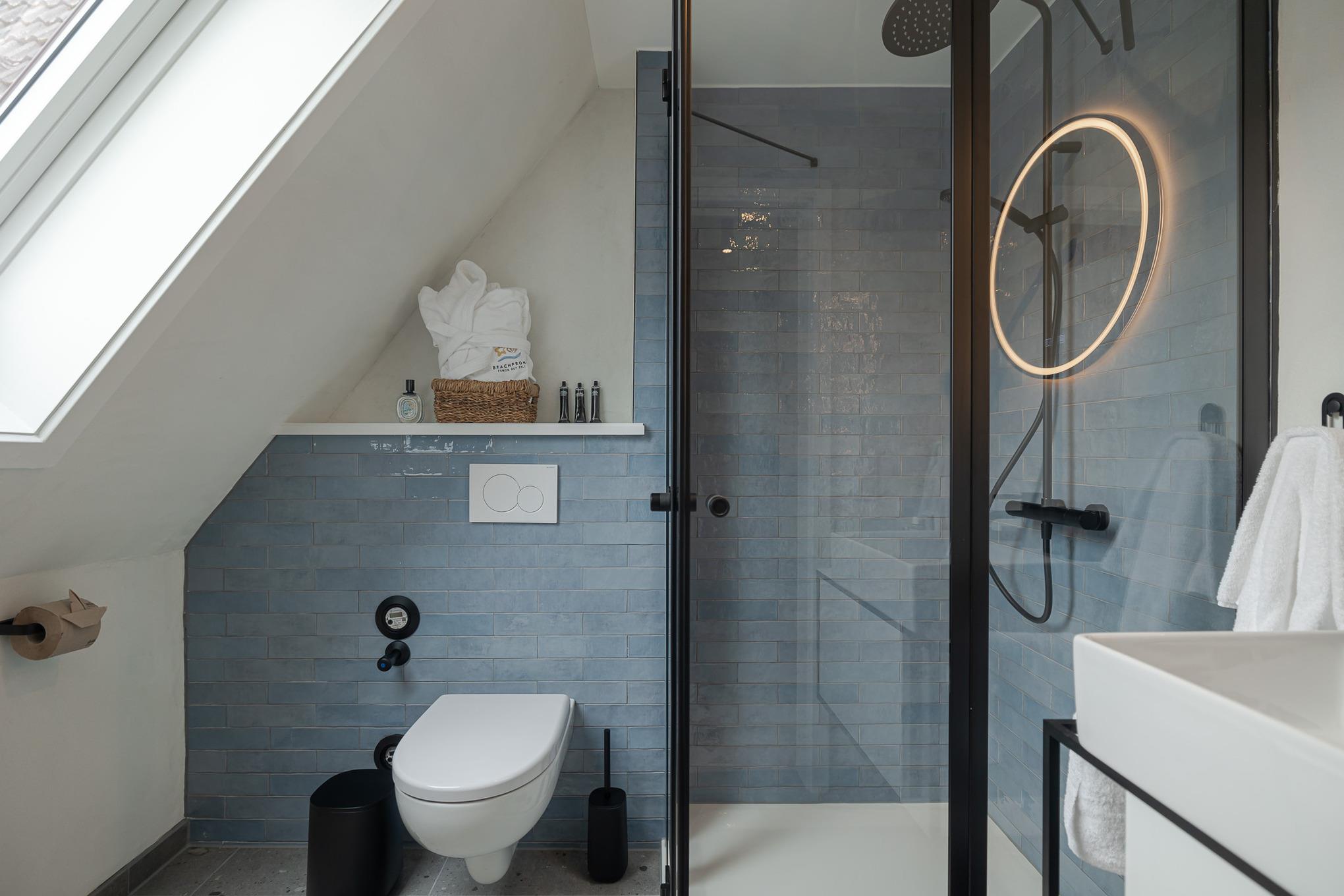 Im stilvollen Badezimmer in Meerblau- und Sandtönen erwartet Sie eine großzügige Regendusche, ergänzt durch Fußbodenheizung und Handtuchwärmer – Ihre kleine private Wellnessoase.