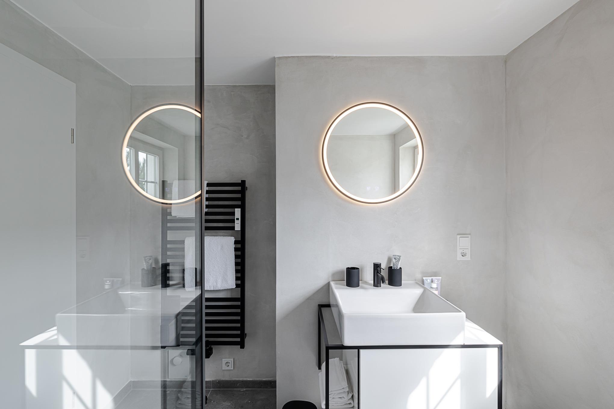 Im stilvollen Bad treffen Meerblau und Sand auf eine großzügige Regendusche, Fußbodenheizung und Handtuchwärmer – Ihre private kleine Wellnessoase nach einem langen Strandtag.