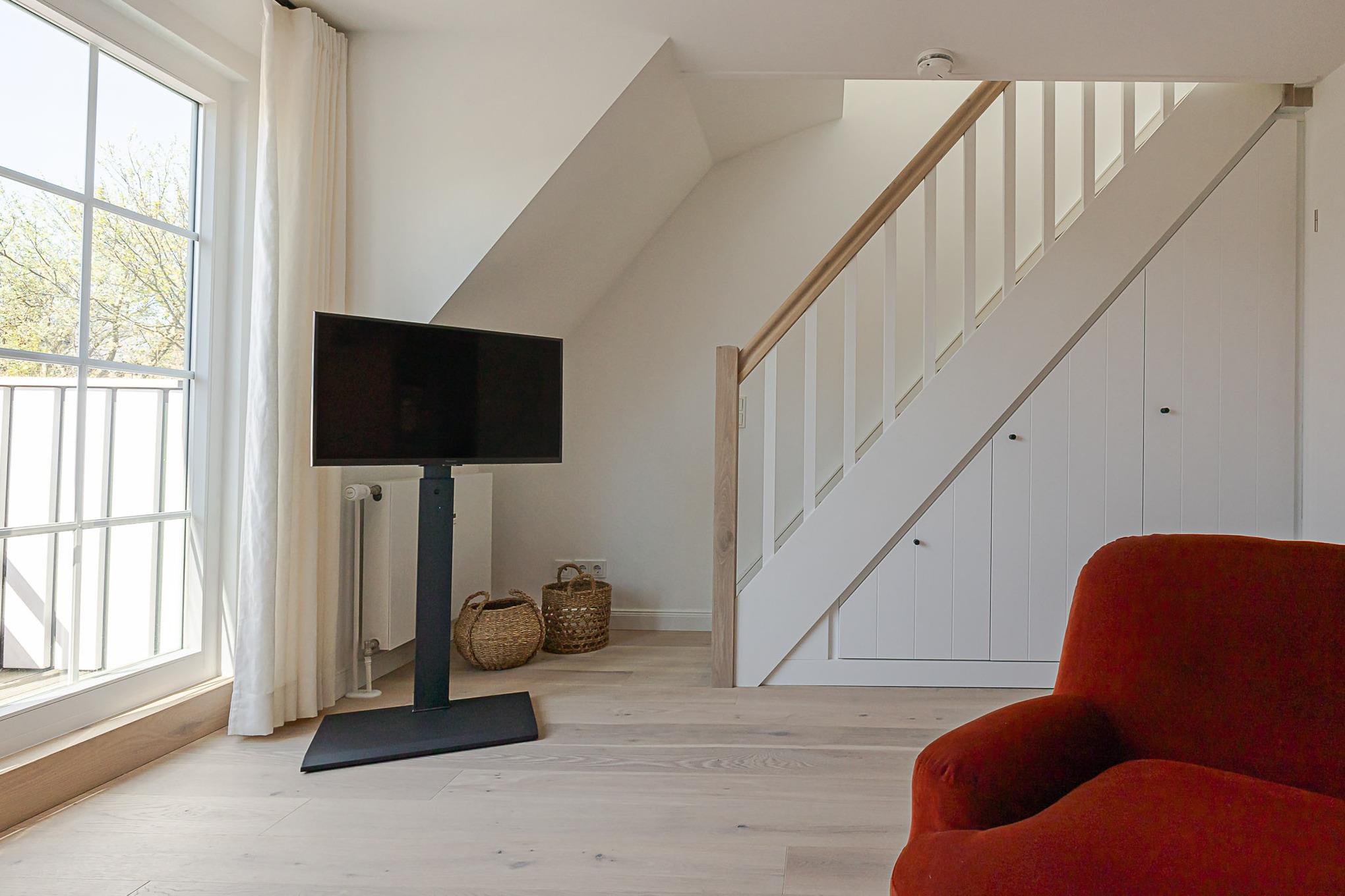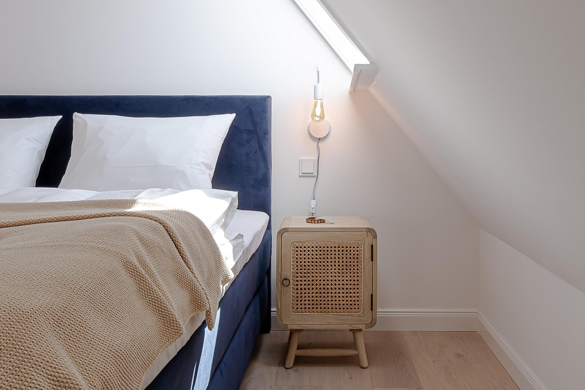 Über eine Treppe gelangen Sie in den Schlafbereich, wo ein komfortables Boxspringbett für ruhige Nächte und erholsamen Schlaf sorgt.