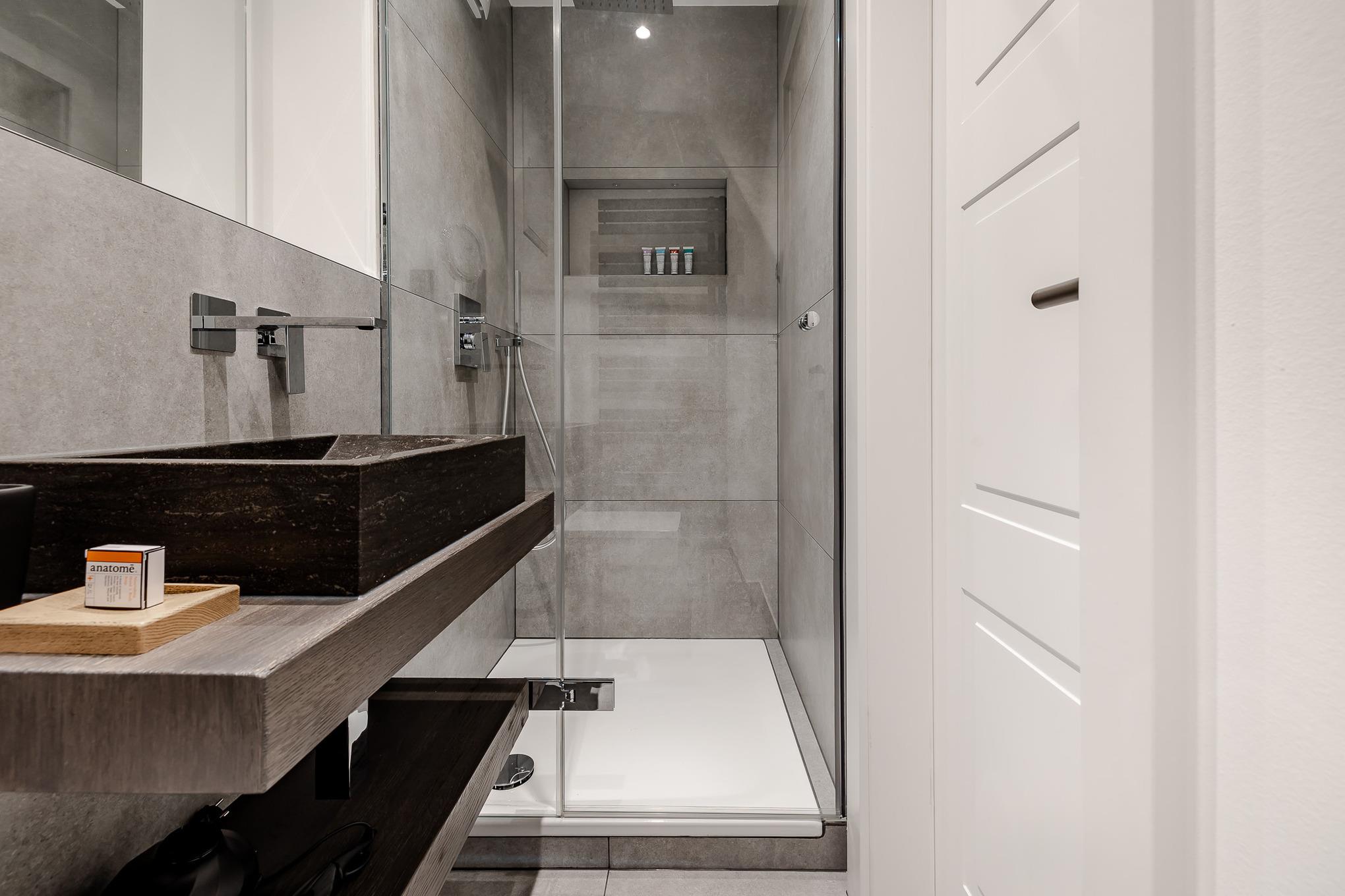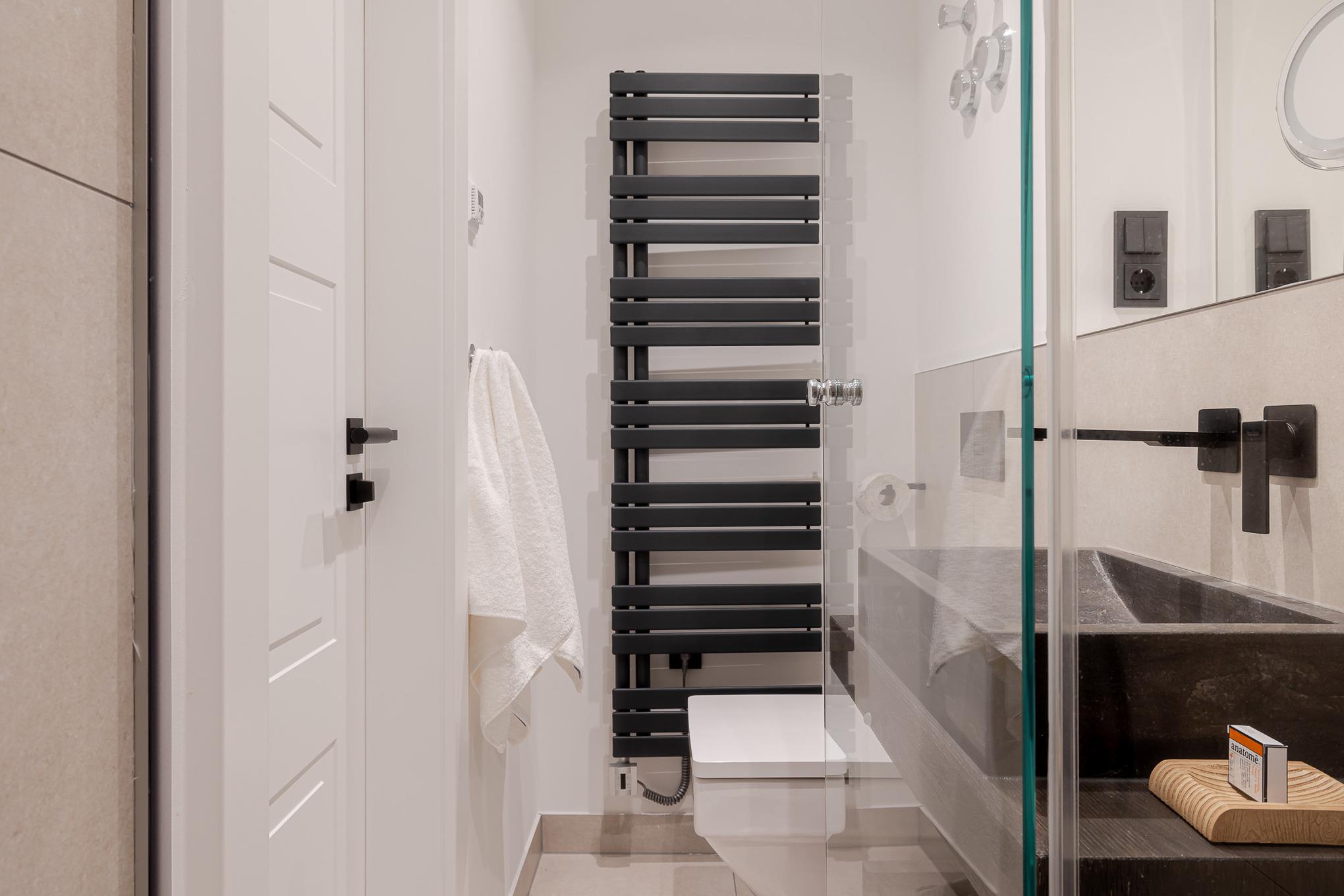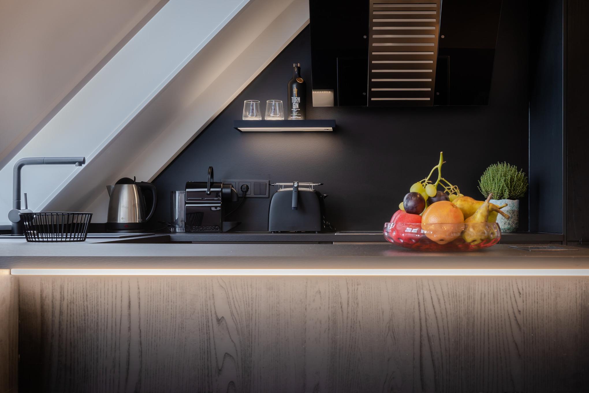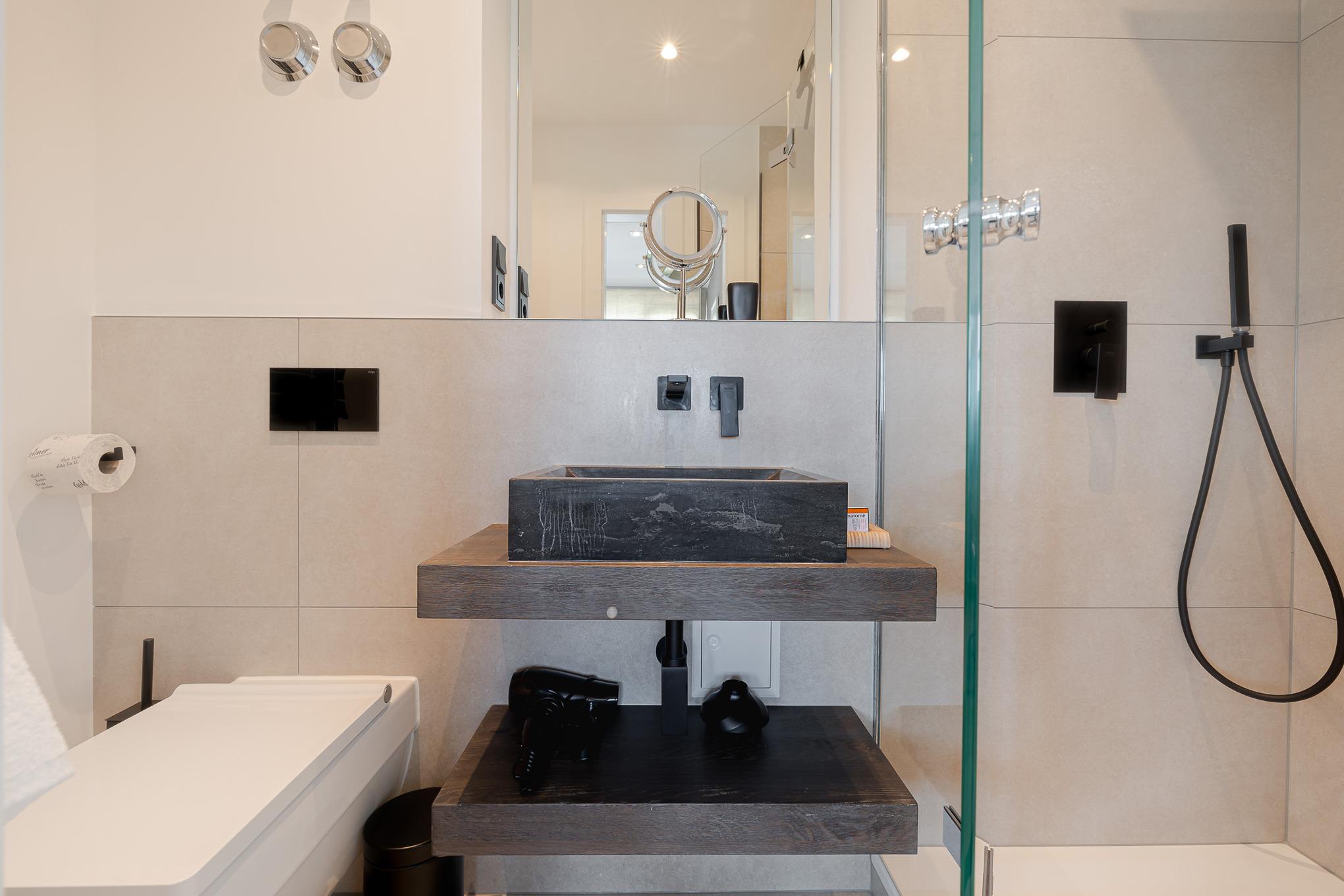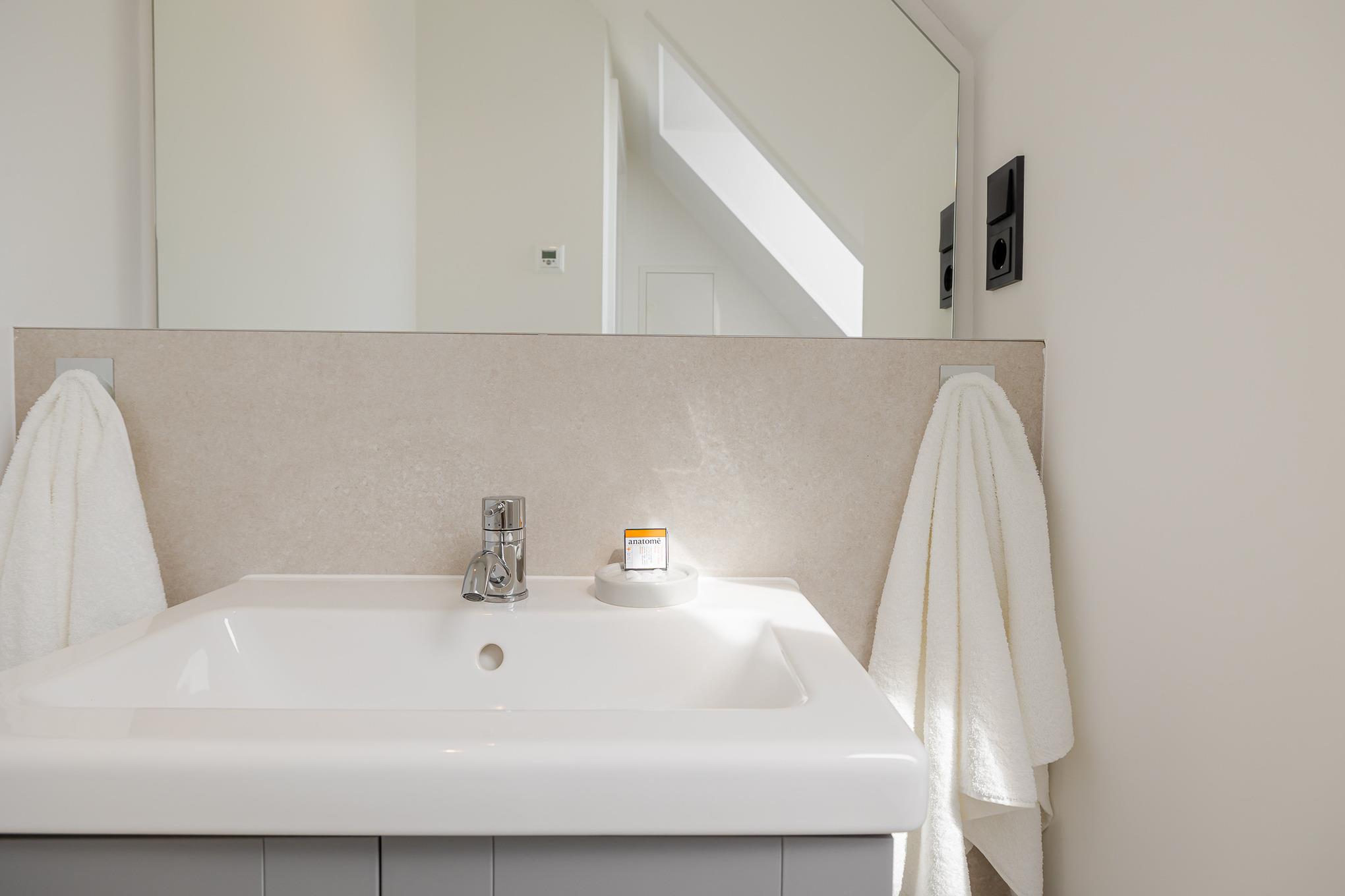 Im unteren Wohnbereich befinden sich das gemütliche Wohnzimmer mit vollwertigem Schlafsofa, der Essbereich und die hochwertige Küche. Ausgestattet mit Geräten von Miele lädt sie dazu ein, den Tag mit einem entspannten Frühstück zu beginnen oder abends gemeinsam zu kochen. Das moderne Bad in sanften Farben von Meer und Sand mit großzügiger Regendusche wird schnell zu Ihrer kleinen Wellnessoase.