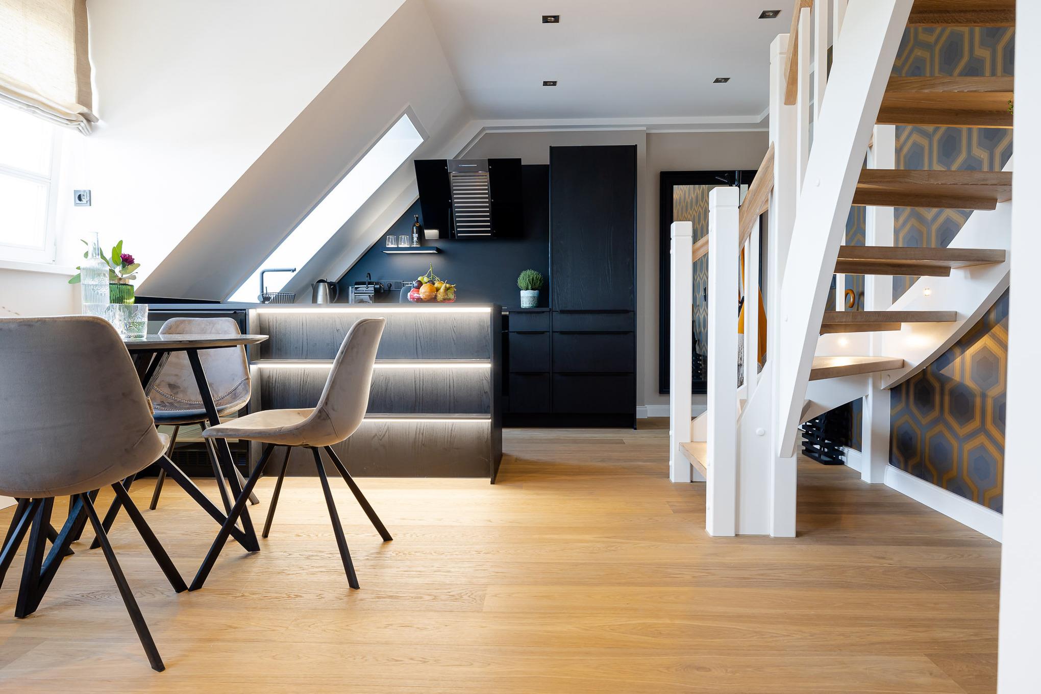 Auf zwei Etagen bietet die Drei Zimmer Wohnung Platz für bis zu vier Personen und empfängt Sie mit hohen, lichtdurchfluteten Räumen, in denen sich Altbaucharme und moderne Gestaltung harmonisch verbinden. Hier fühlt sich Urlaub sofort nach Ankommen an.