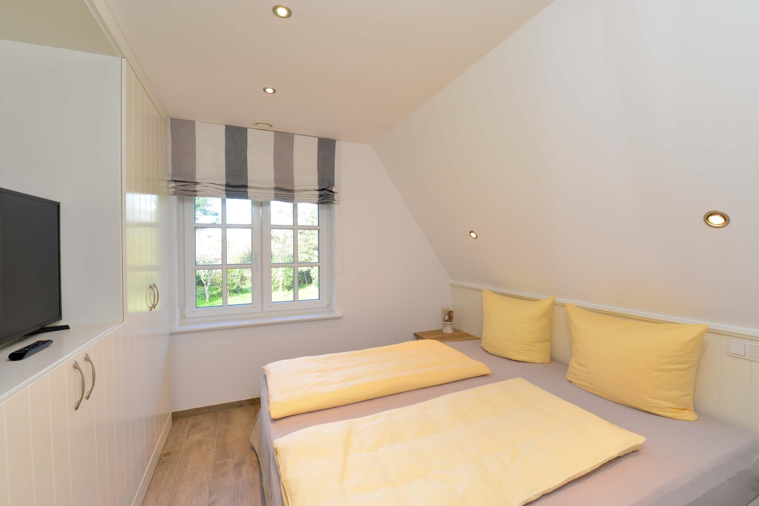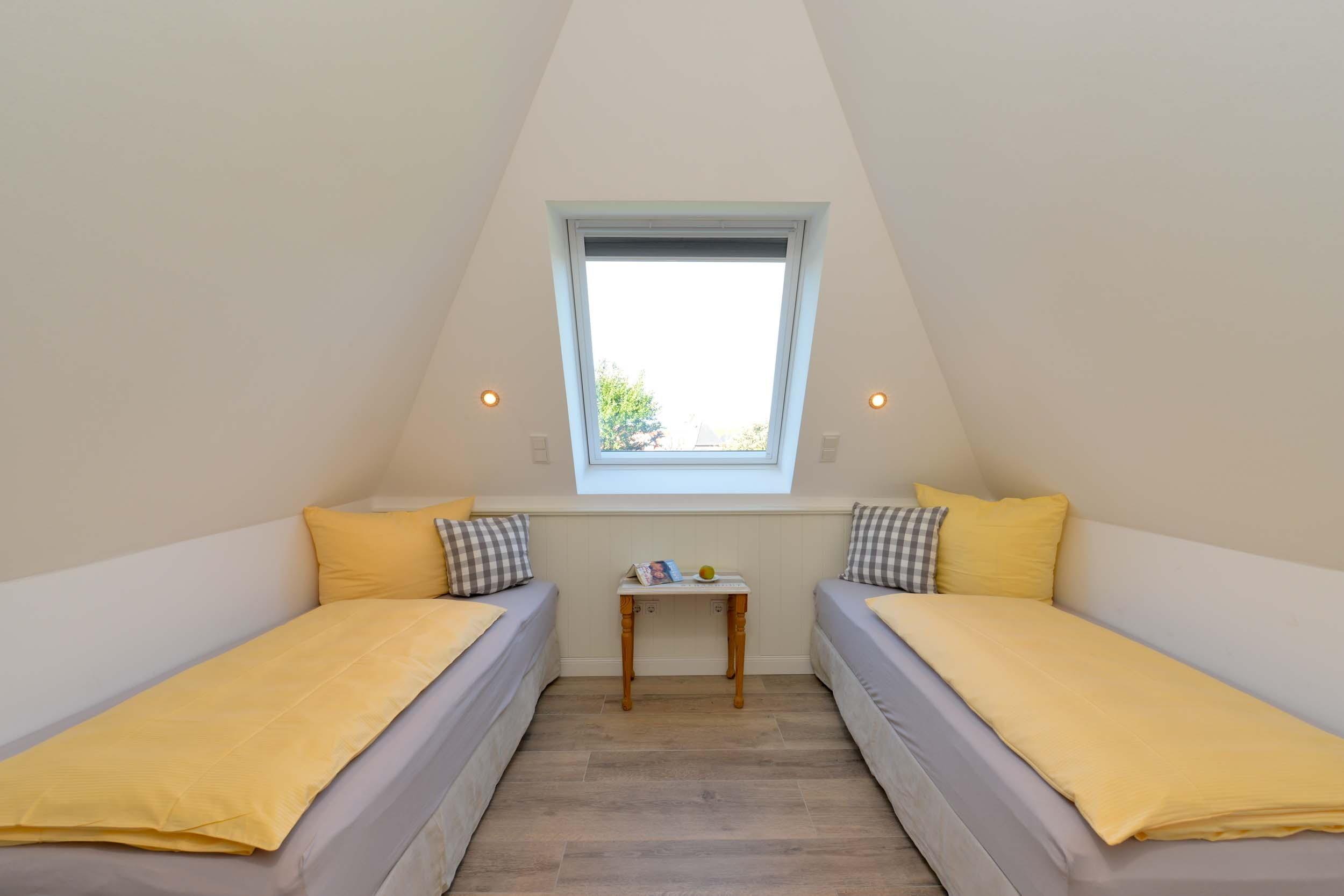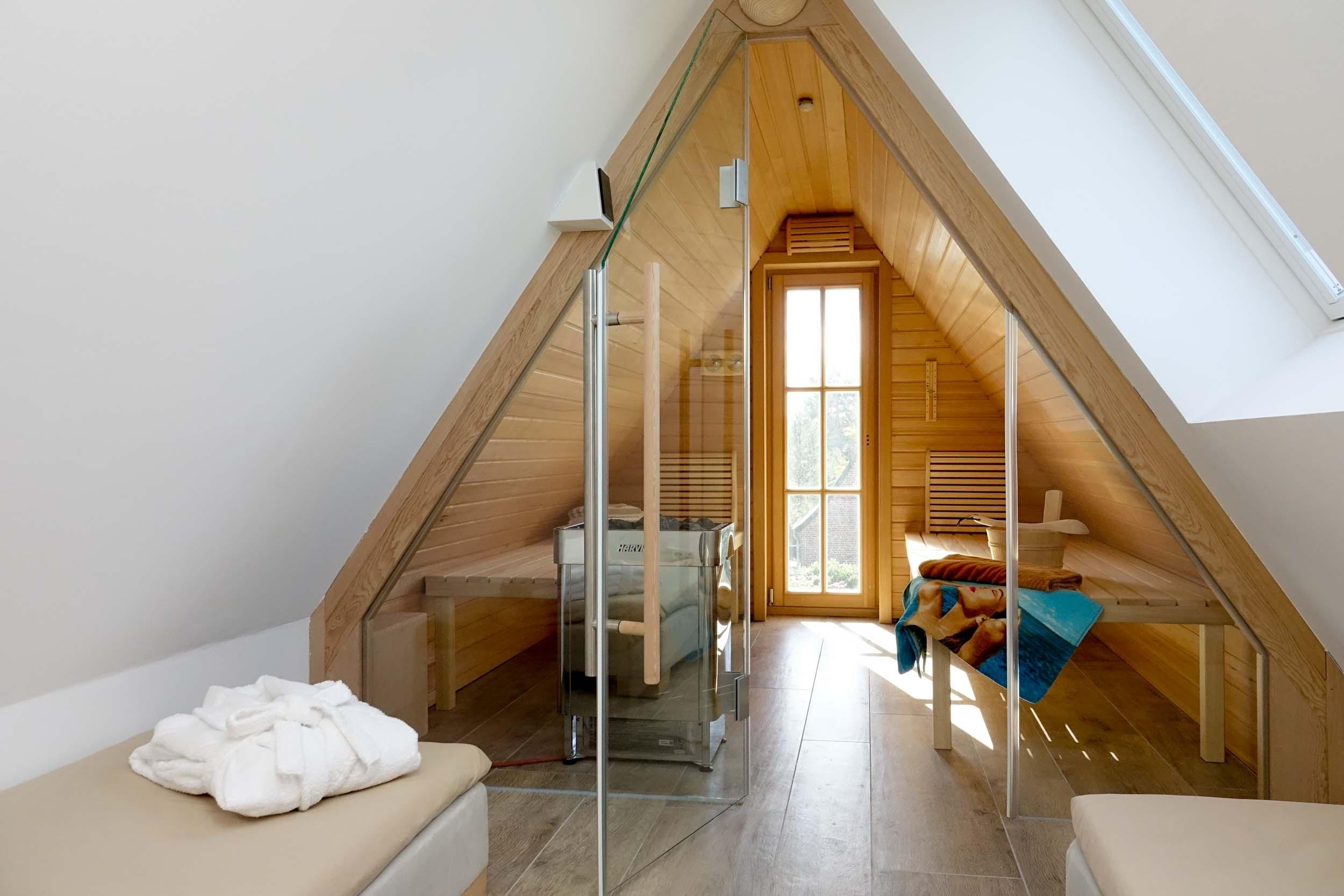Im Spitzboden gibt es ein weiteres Schlafzimmer mit zwei Einzel-Boxspringbetten, die auf Wunsch zusammengestellt werden können. Auch hier gibt es ein Duschbad sowie eine Sauna.