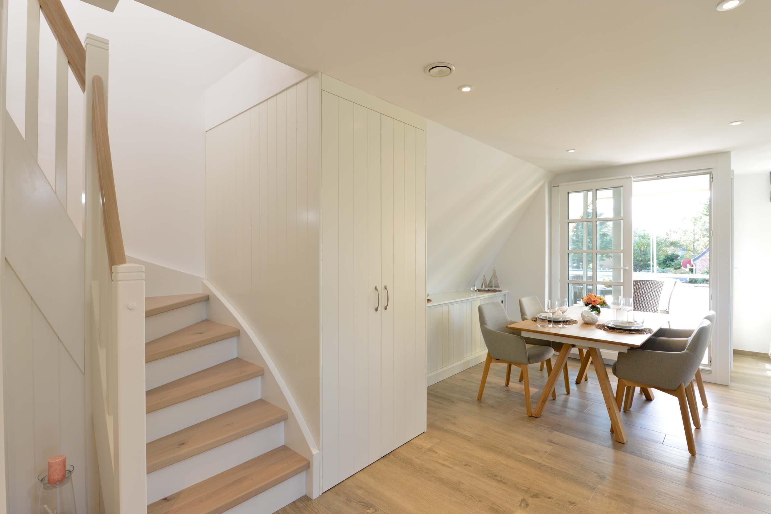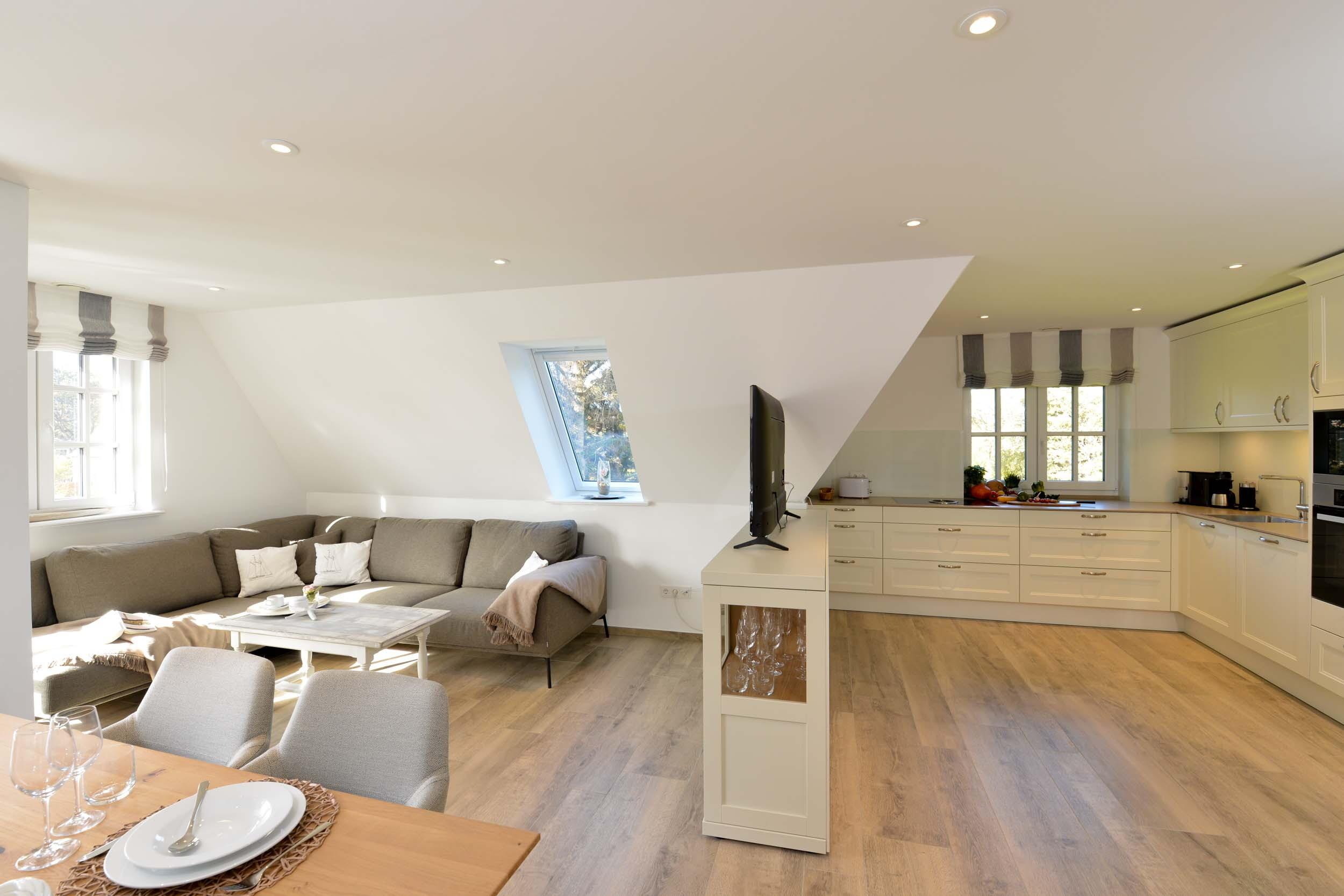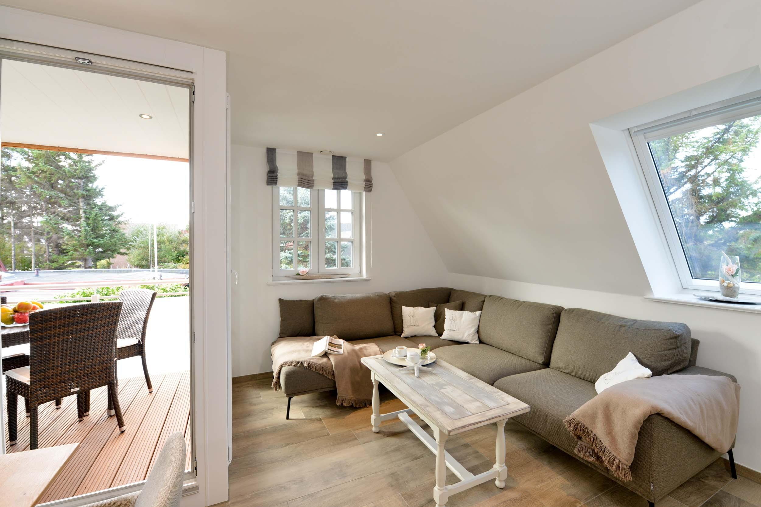 Im ersten Obergeschoss befindet sich ein Schlafzimmer mit einem komfortablen Boxspringdoppelbett und Morgensonne. Zudem gibt es ein Duschbad und einen hellen Wohnbereich mit integrierter Küche und Zugang zum überdachten und windgeschützten Südbalkon.
