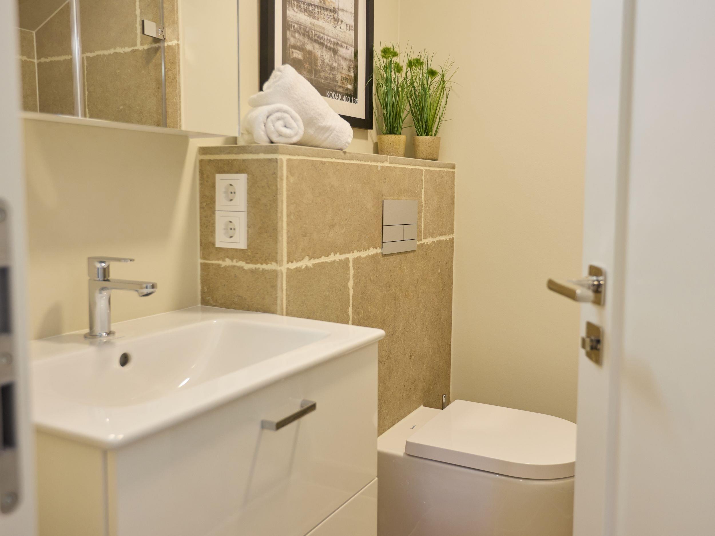 Das hell gehaltene Duschbad inkl. WC überzeugt durch wertigen Naturstein und moderne Ausstattung.