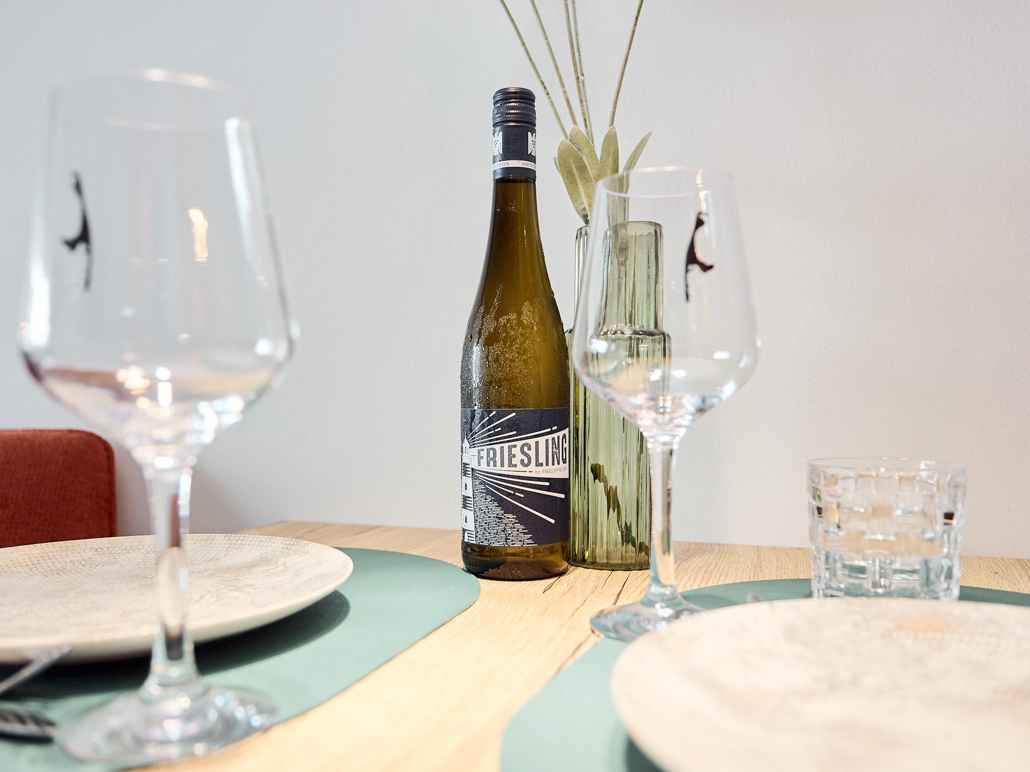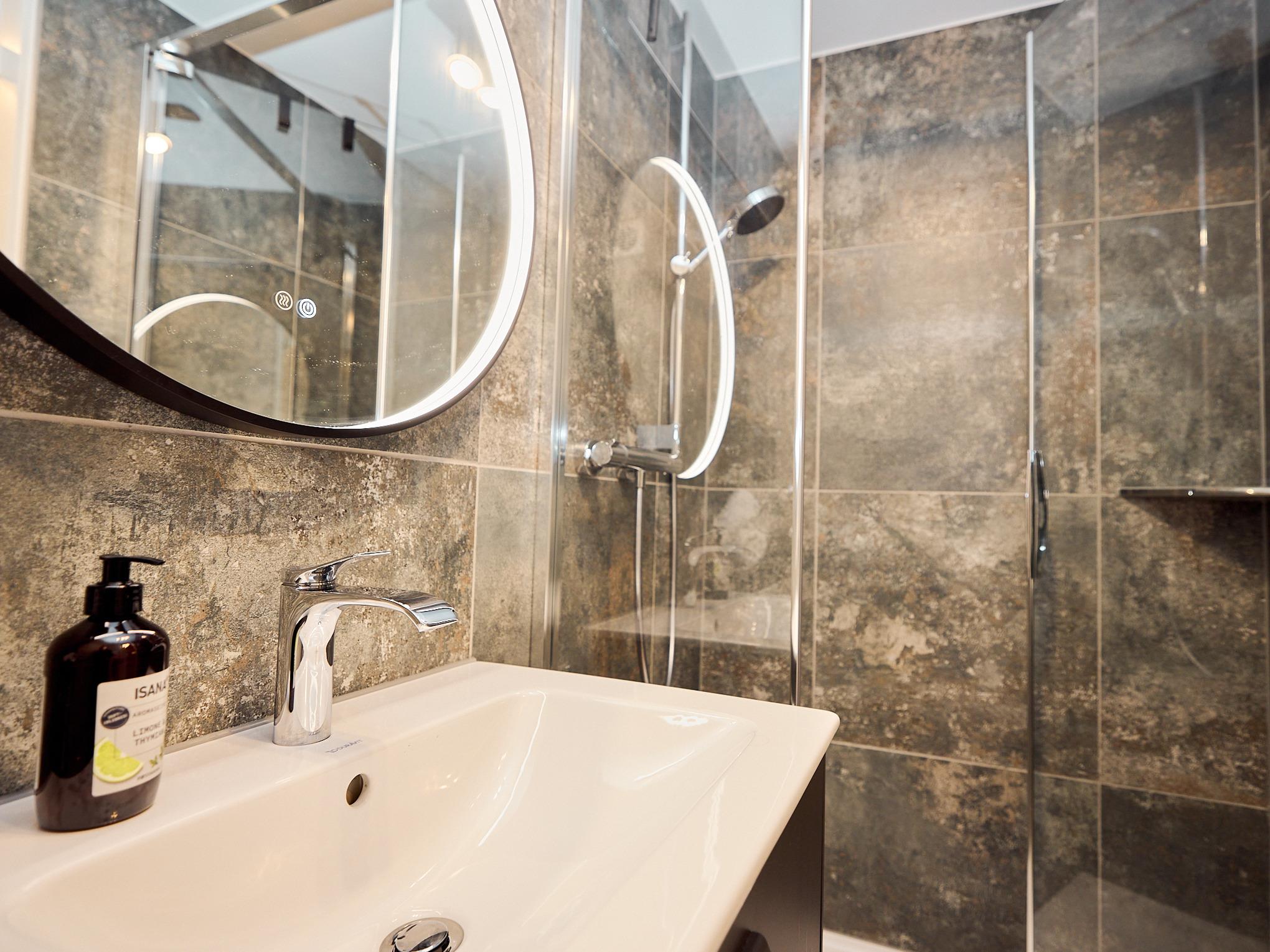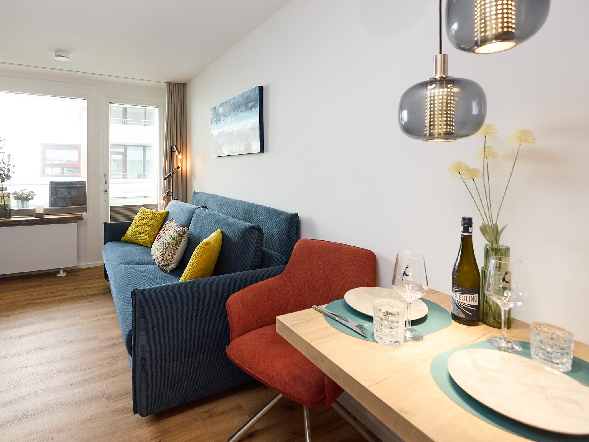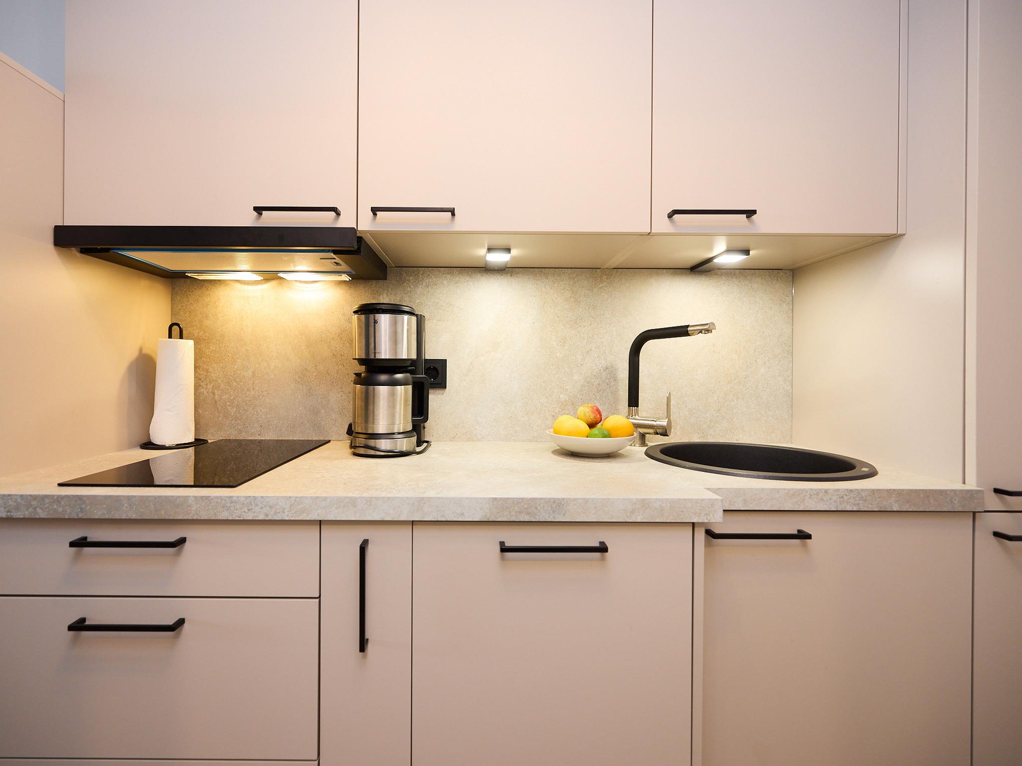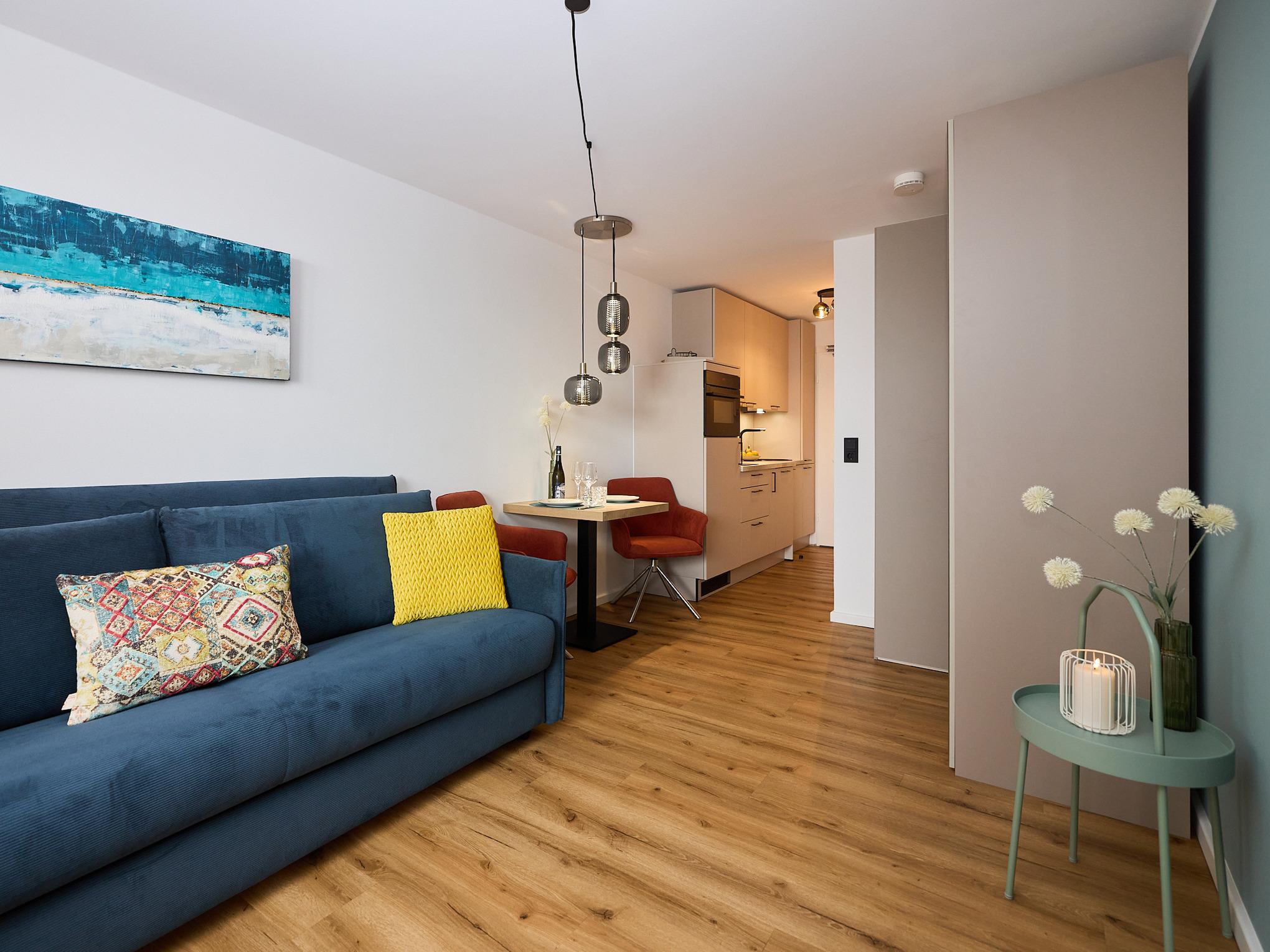 Die Wohnung ist frisch und stilvoll eingerichtet – alles perfekt aufeinander abgestimmt. Sie bietet einen Eingangsbereich mit voll ausgestatteter Küche und einem kleinen Esstisch für zwei Personen. Das moderne Duschbad wurde ebenfalls vollständig erneuert. Im Wohnbereich lädt ein bequemes Sofa ein, das sich zu einem vollwertigen Bett umbauen lässt – ideal für bis zu zwei Personen.