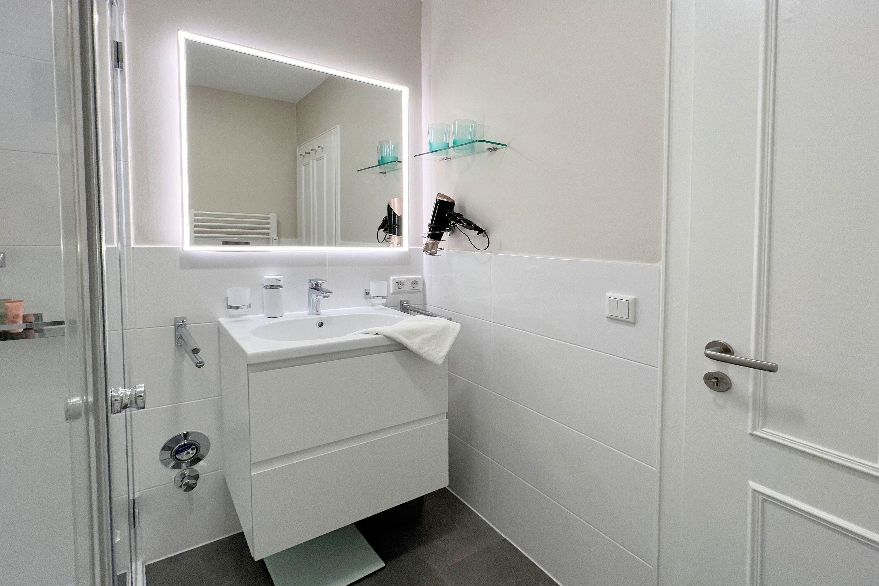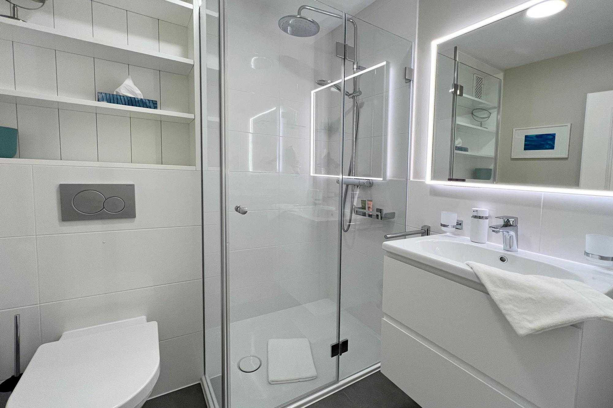 Das innen liegende Duschbad bietet eine großzügige Dusche mit Regen- und Massagefunktionen und einem nahezu ebenerdigen Einstieg. Die Beleuchtung an Decke und Spiegel ist individuell adaptierbar. Handtuchtrockner, Föhn, Vergrößerungsspiegel und viel Stauraum in Regal und den Schubladen runden den Komfort ab.