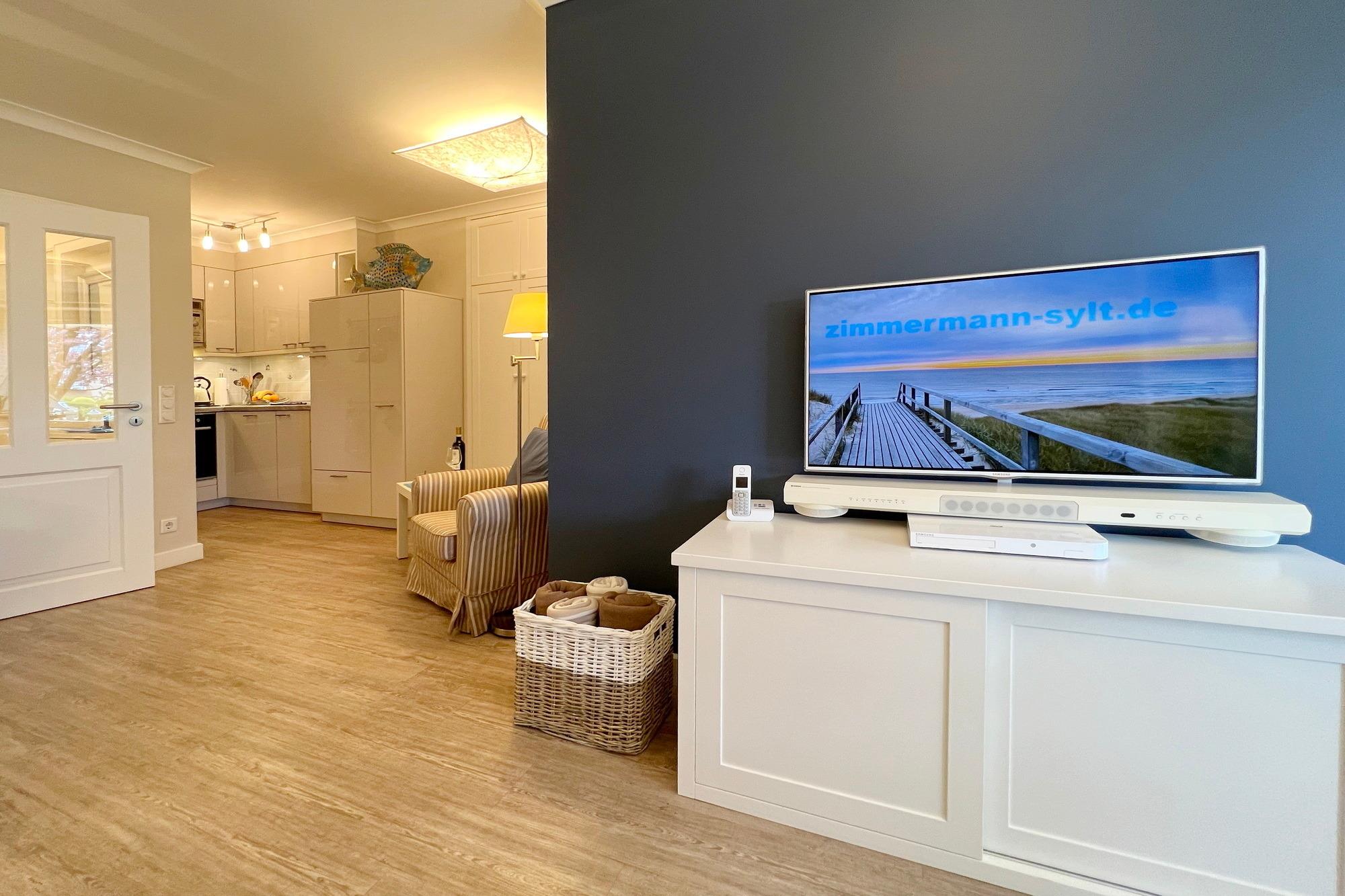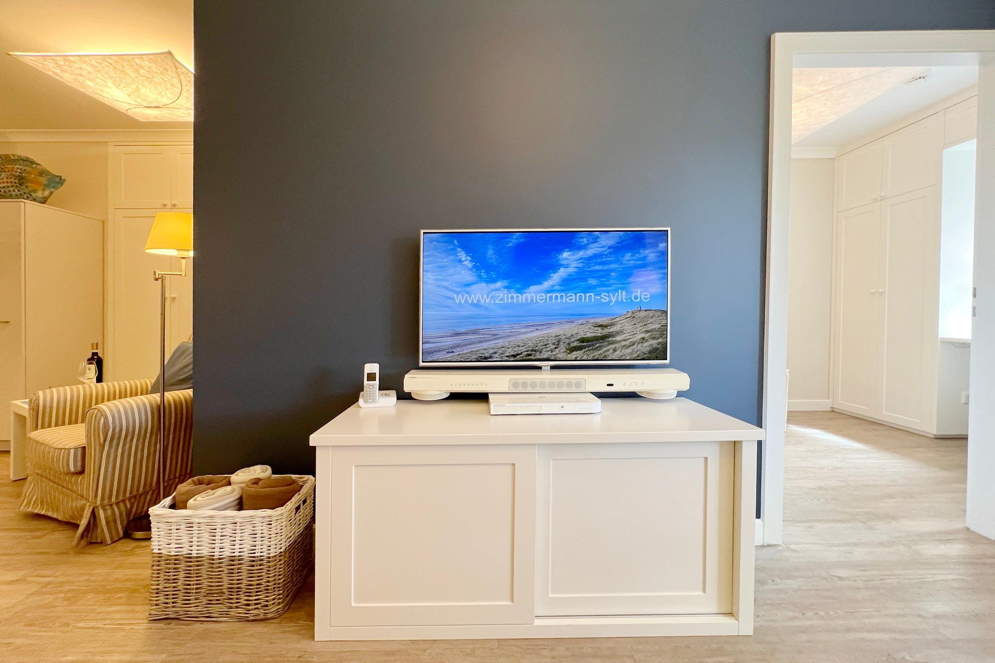 W-LAN sowie Telefon zur Erreichbarkeit und zum kostenfreien Telefonieren ins deutsche Mobil- und Festnetz stehen Ihnen zur Verfügung. Für weitere Unterhaltung ist mit Kabelanschluss, Smart TV/ inkl. Mediatheken, Digitalradio und Soundbar gesorgt. Ein Blu-ray/ CD/ DVD-Gerät und üblicherweise eine kleine Auswahl an DVDs, verschiedene Bücher, Reiseführer und der Gästeordner mit Infos über Insel und Wohnung runden das Angebot ab.