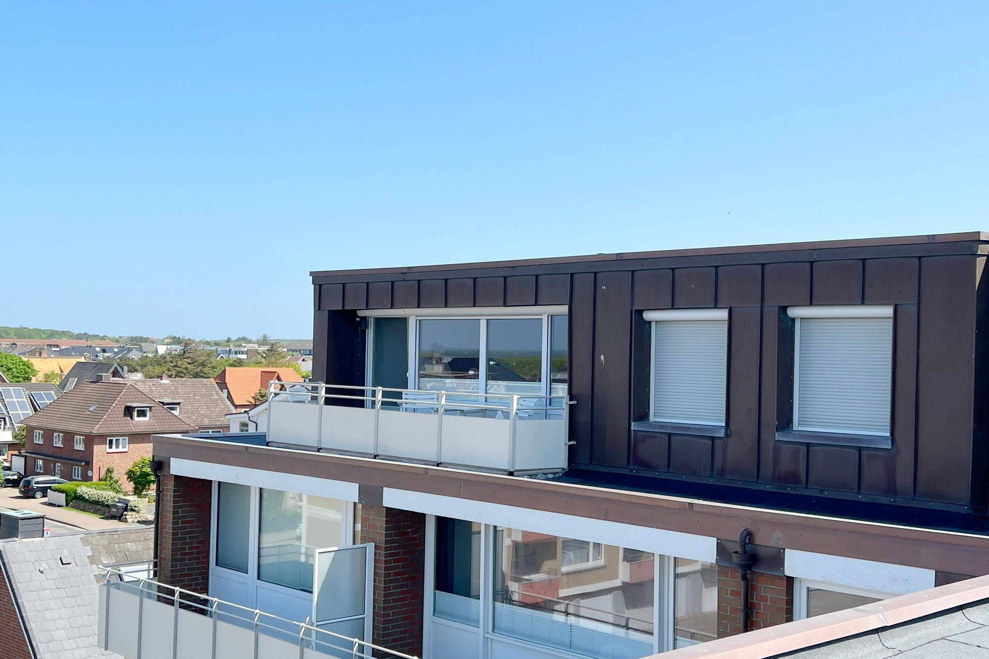 Penthouse-Ferienwohnung im Haus Germania. Modernes Wohnzimmer mit offener Küchezeile, Essecke, Couch zum Relaxen und West-Balkon mit kleinem Meerblick. Schlafzimmer mit Doppelbett und zweitem Balkon nach Osten. Zweites Schlafzimmer mit 2 Einzelbetten, Flur und Duschbad ( mit Oberlicht ) mit WC und Waschbecken. Alle Räume befinden sich auf einer Ebene. Es steht Ihnen ein Fahrstuhl und ein eigener PKW-Stellplatz ( Nr. 35 ) zur Verfügung.