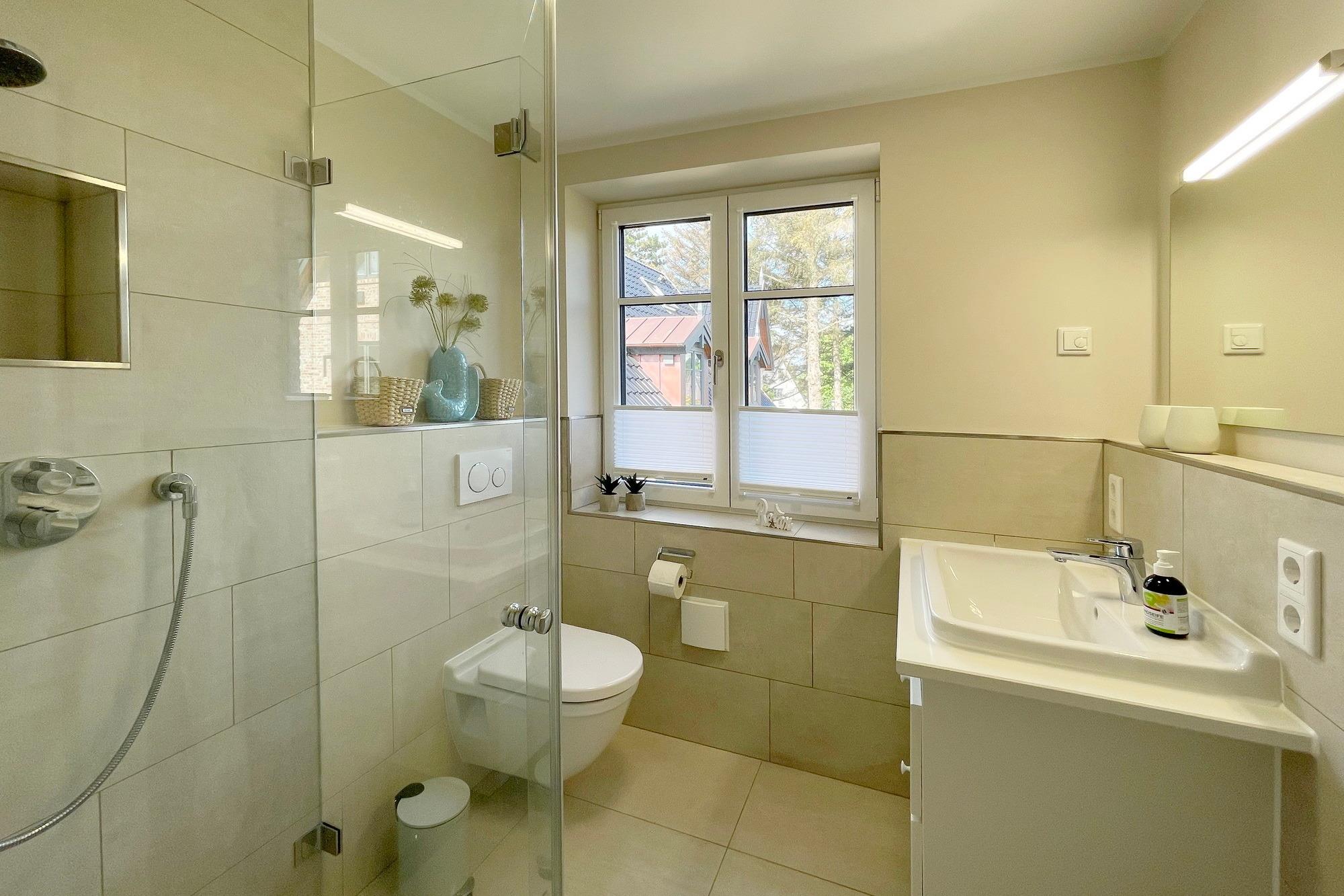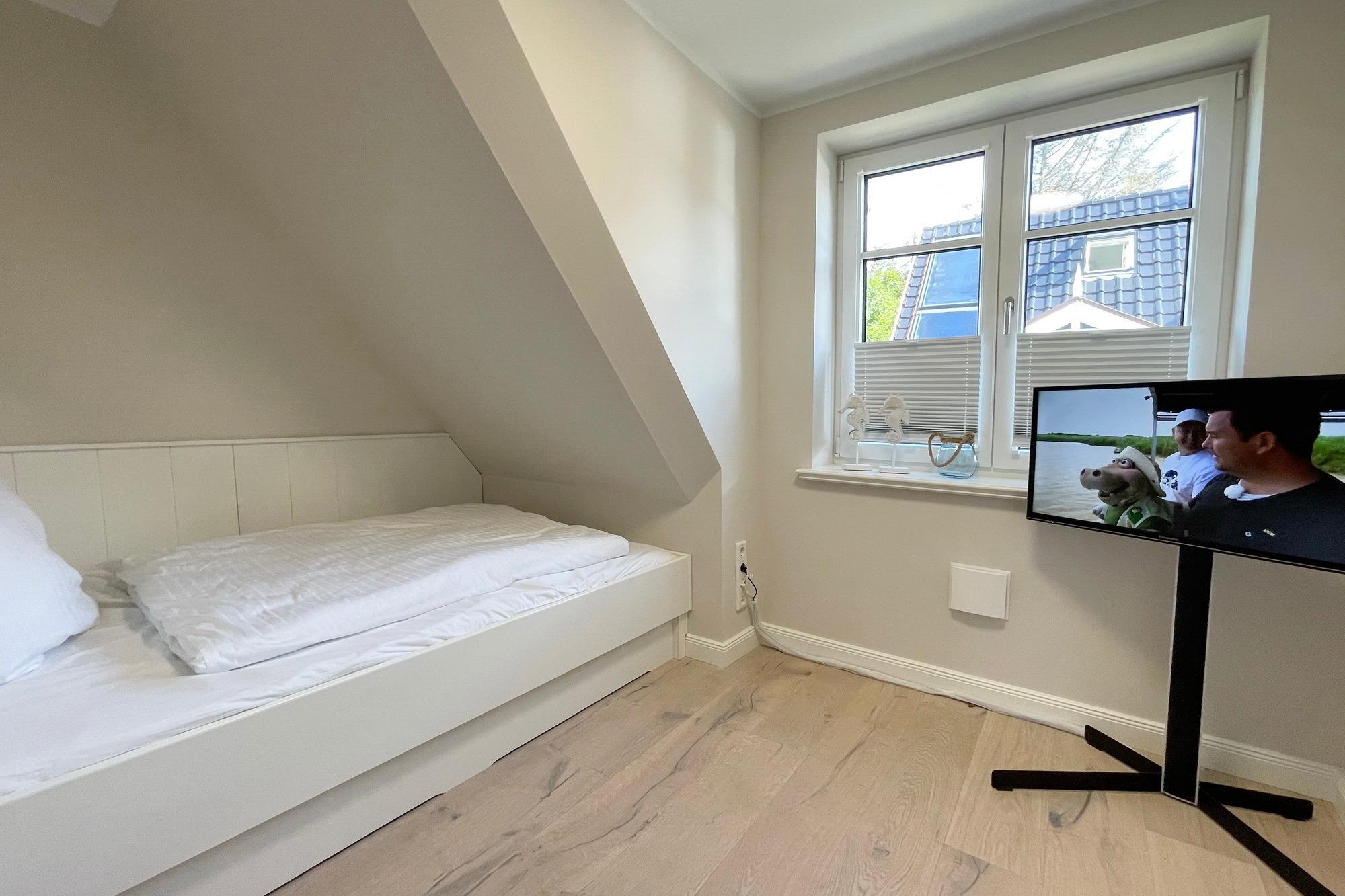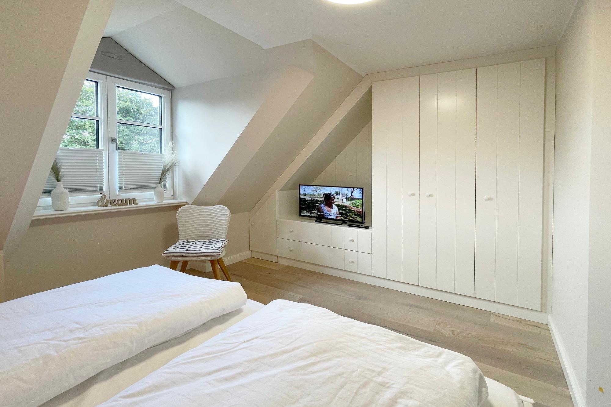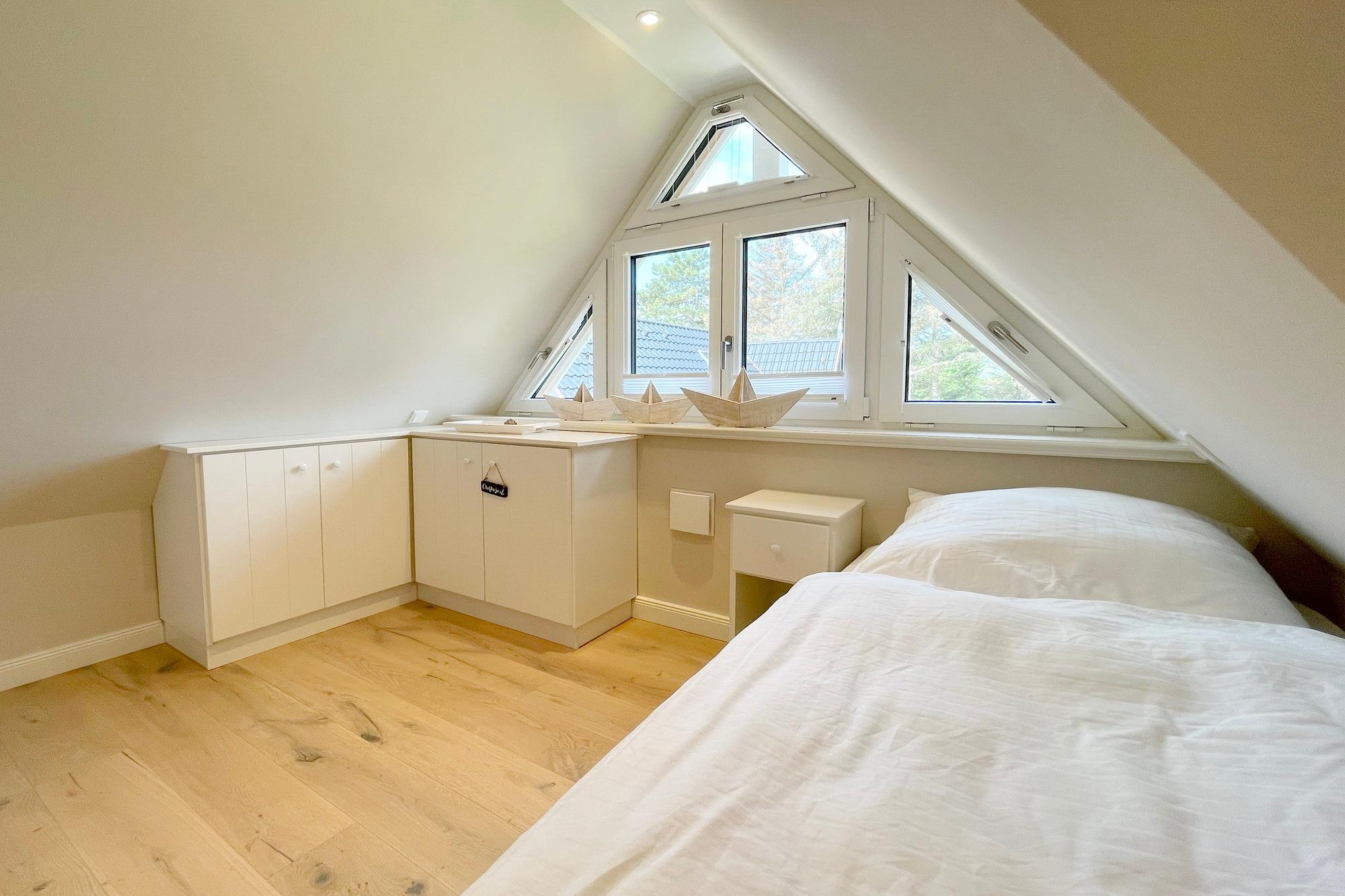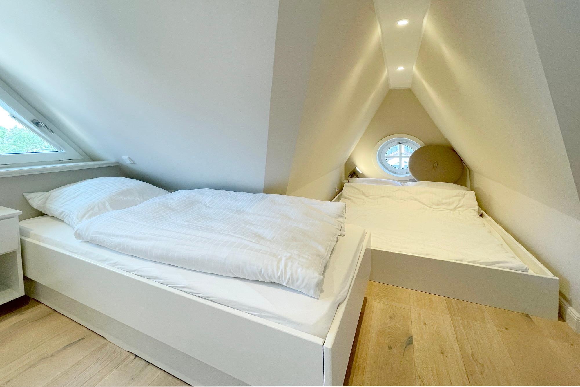 OG: 1 Schlafzimmer mit Doppelbett, 1 Schlafzimmer mit Einzelbett und ein modernes Duschbad. Zusätzlicher Raum im SB mit weiterer Schlafmöglichkeit.