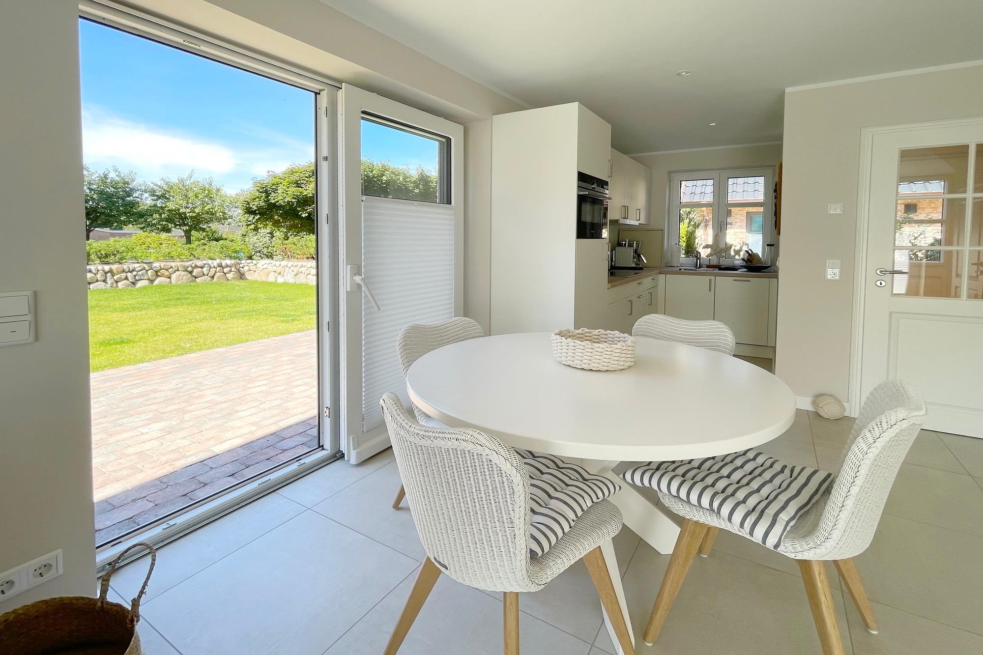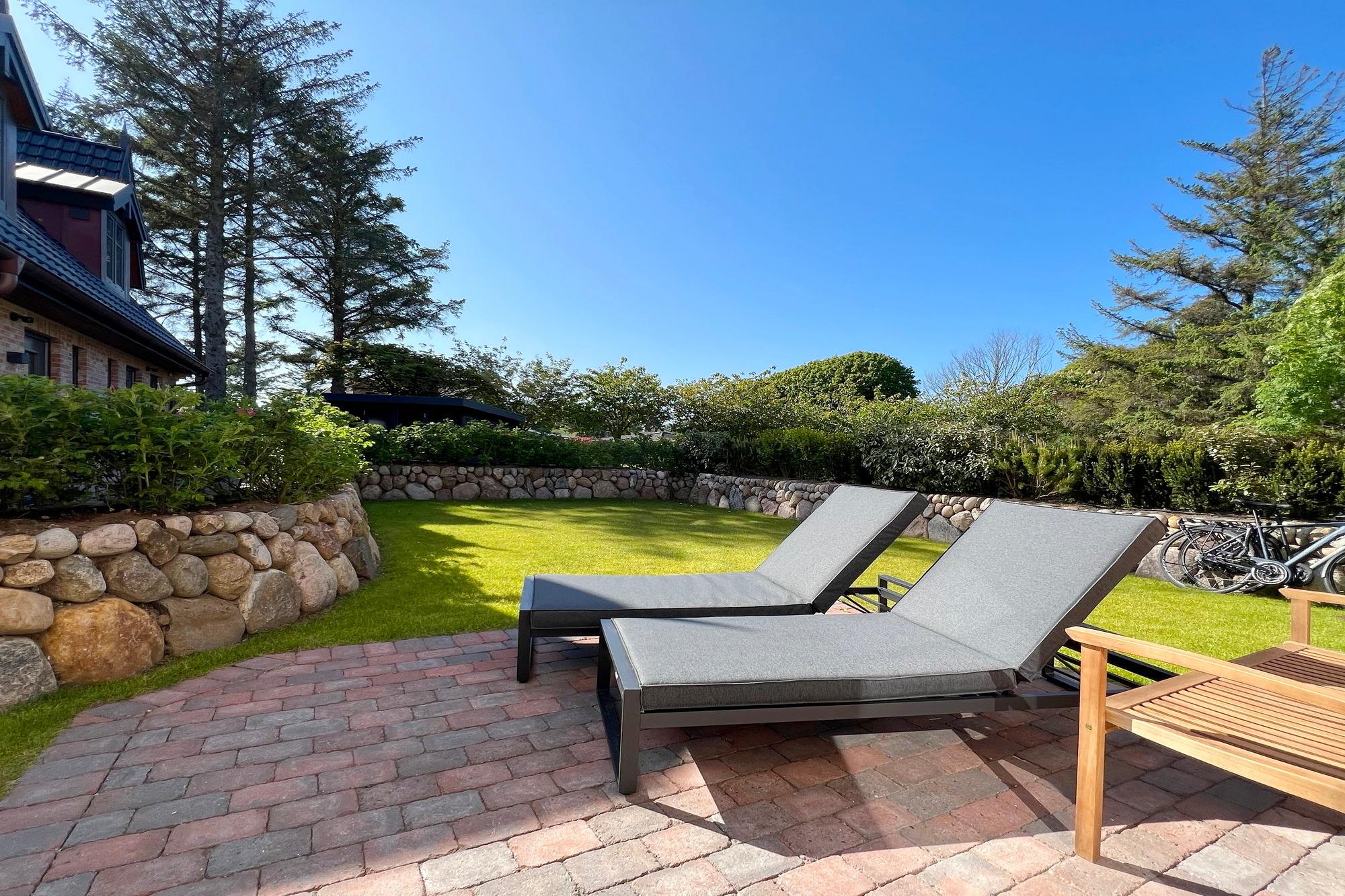Zwei Terrassen ( Süden und Westen ) mit bequemen Gartenmöbeln und Saisonstrandkorb bieten an sonnigen warmen Tagen genug Platz, um den Urlaub auch im Garten zu genießen.