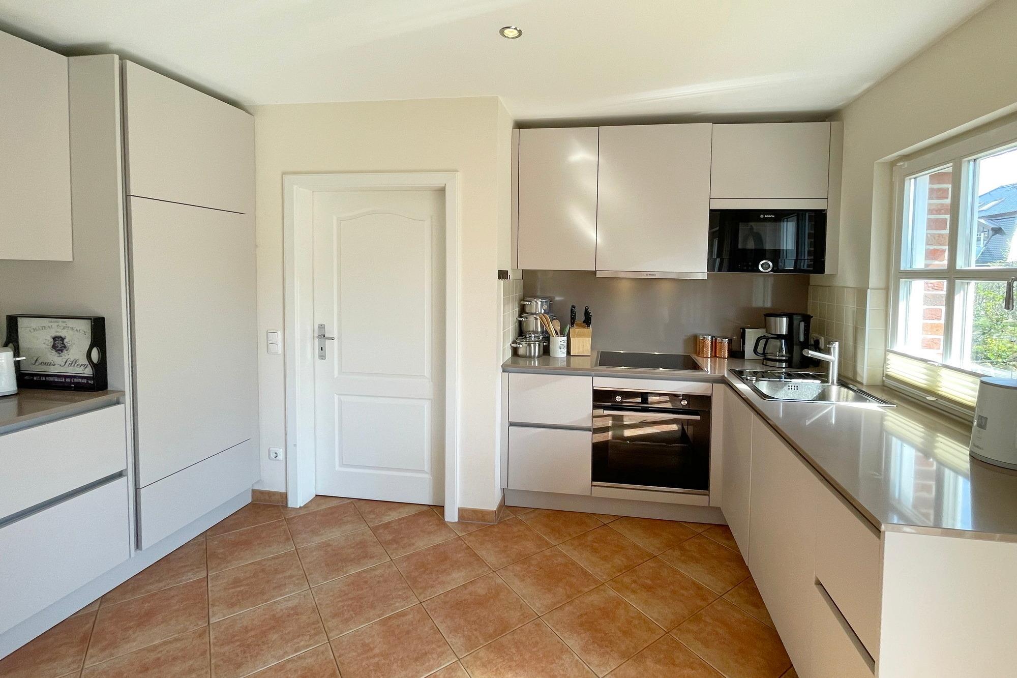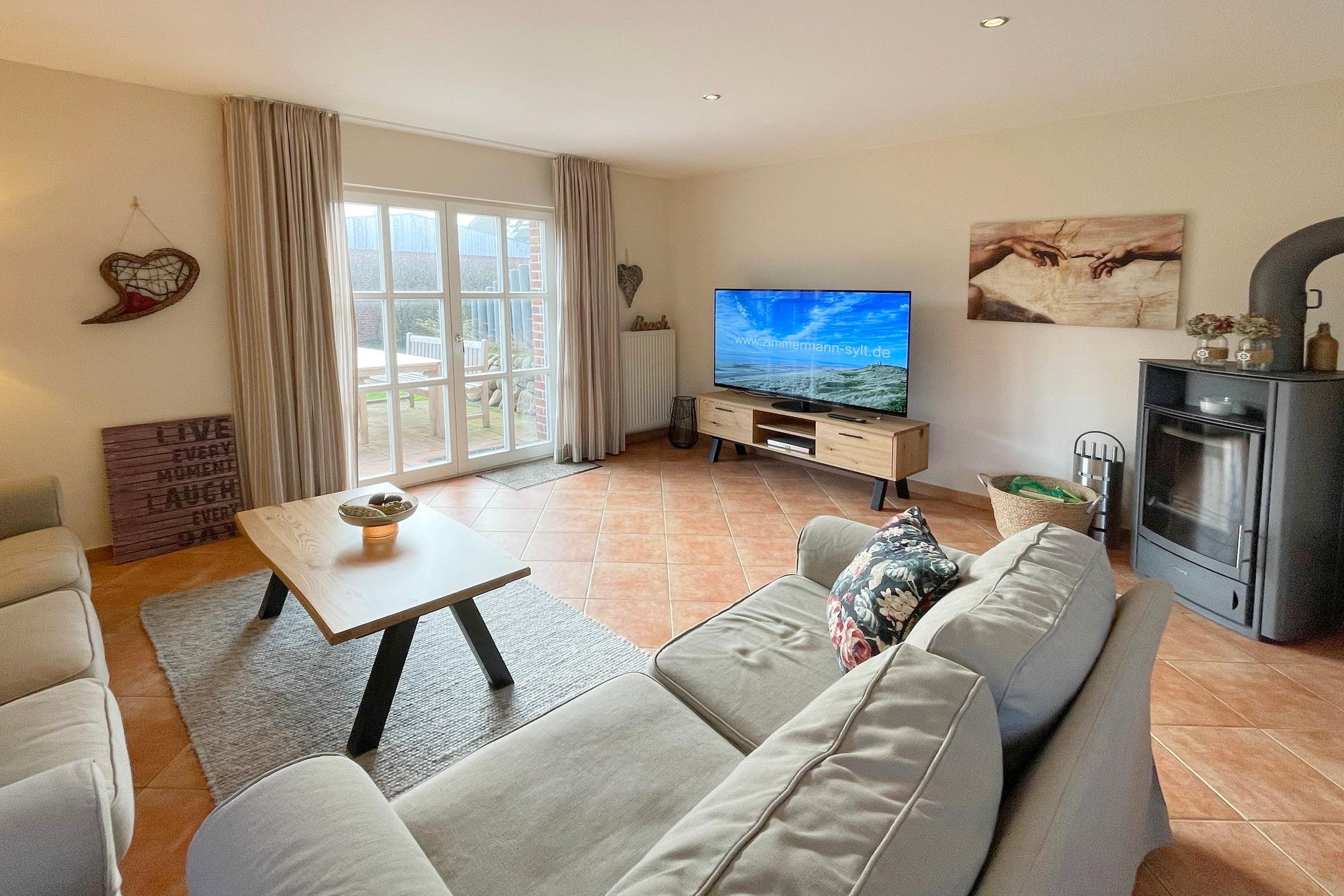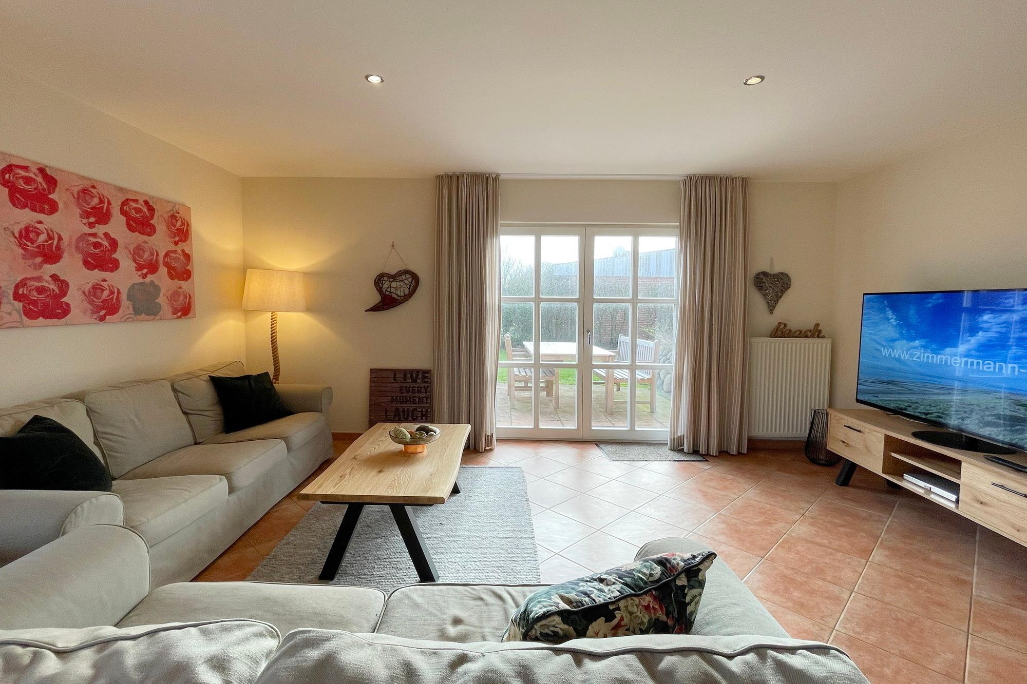 Reihenendhausteil mit 2 Terrassen in zentraler, strandnaher Lage, Wohnzimmer mit Sitzgruppe und Eßecke, Kaminofen, Fernseher (Smart-TV[nbsp] offene Küche mit Geschirrspüler und Backofen, 2 Bäder mit Waschbecken und WC, 2 Schlafzimmer mit Doppelbett für je 2 Personen, Waschmaschine und Trockner