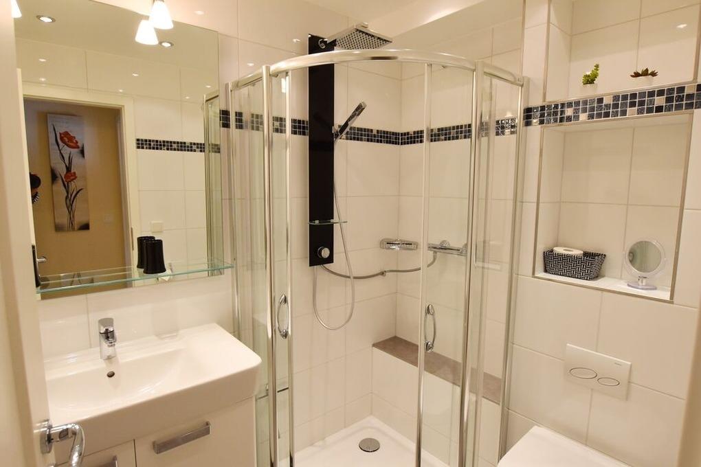 Moderne Ferienwohnung im Erdgeschoss mit Terrasse in südlicher Ausrichtung. Wohnzimmer mit gemütlicher Couch, Essecke für 2 Personen und offener Küchenzeile mit Geschirrspüler und Mikrowelle. Smart-TV und WLAN gehören hier zur Ausstattung. Schlafzimmer mit Doppelbett und zweitem TV. Duschbad mit WC und Waschbecken. Zur Ferienwohnung gehört ein PKW-Stellplatz ( Nr. 4 ) auf dem Grundstück. Im UG befinden sich für die Gäste des Hauses Waschmaschine und Trockner, Nutzung gegen geringe Gebühr. Gerne dürfen Sie hier ein gut erzogenes Haustier mitbringen. Dafür wird dann eine einmalige Haustiergebühr berechnet.