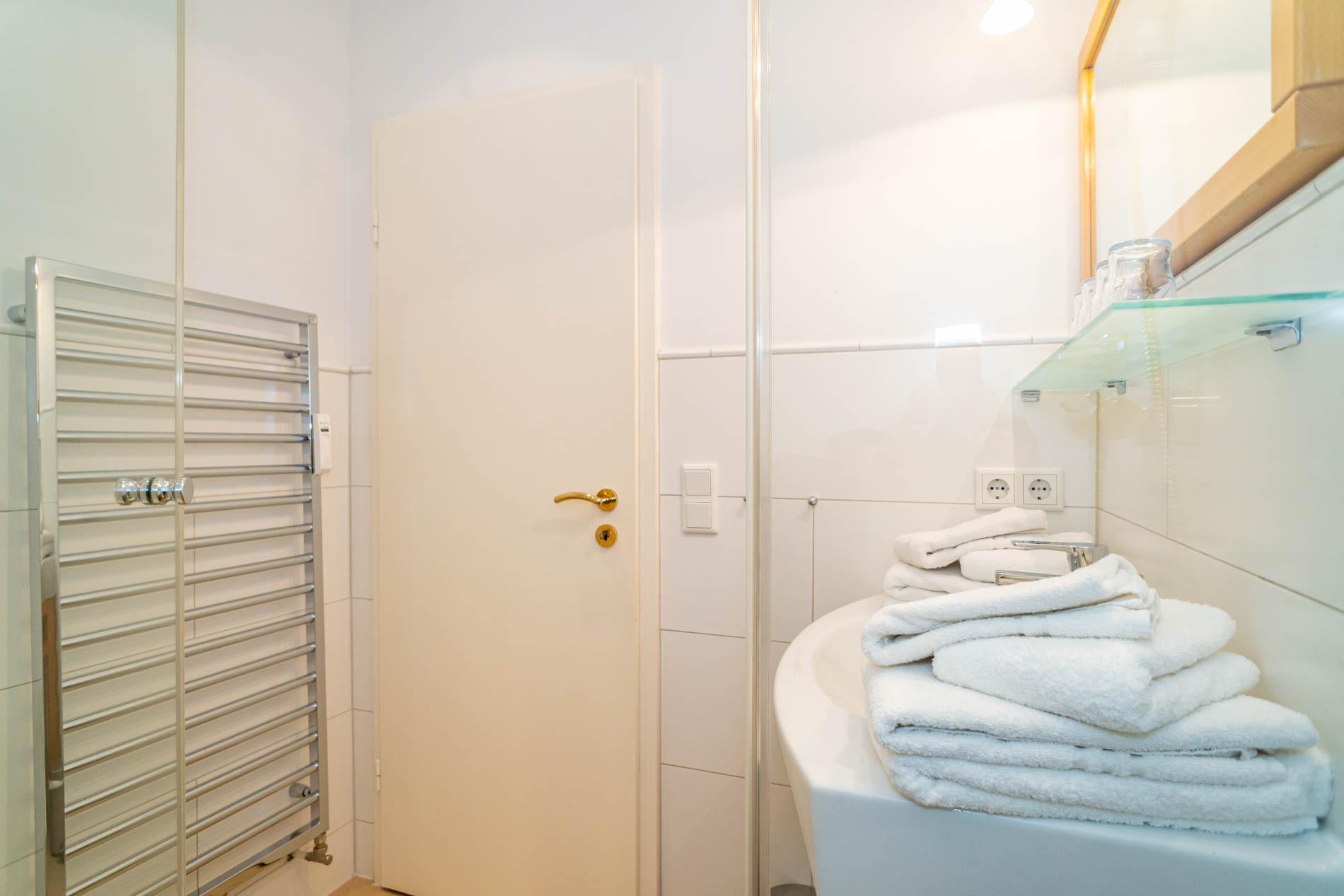 Im separaten Schlafzimmer mit hellem Eichenholzboden stehen zwei bequeme Einzelbetten (jeweils 0,90 x 2,00 m), die für erholsamen Schlaf sorgen. Das moderne Badezimmer ist mit einer Dusche, einem Waschtisch, einem Handtuchtrockner und einem WC ausgestattet.