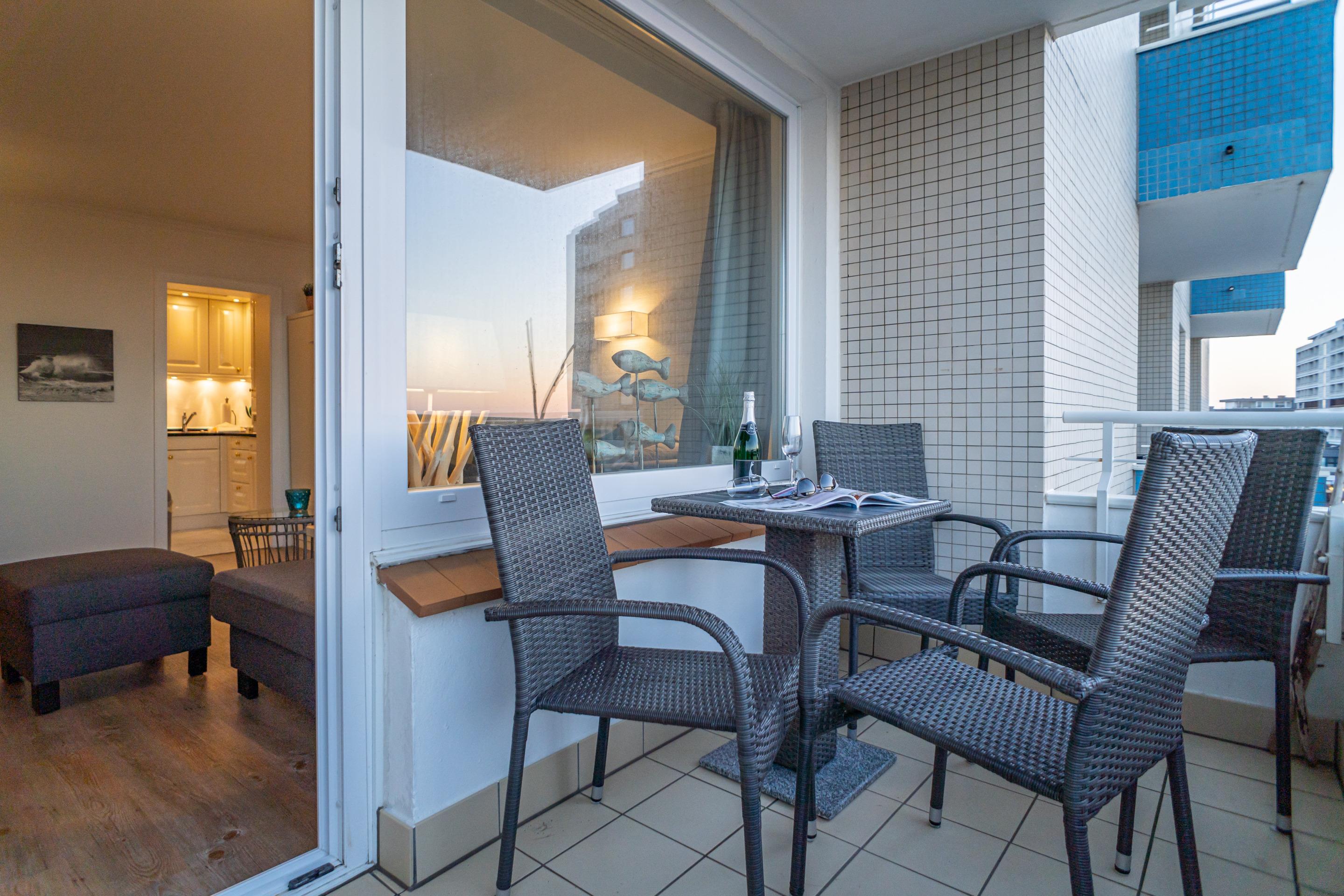 Schicke 2-Zimmer-Nichtraucher-Ferienwohnung (ca. 54 qm) in der 4. Etage mit Meerblick und Westloggia (Seeseite, mit Balkonmöbeln) für max. 2 Personen.